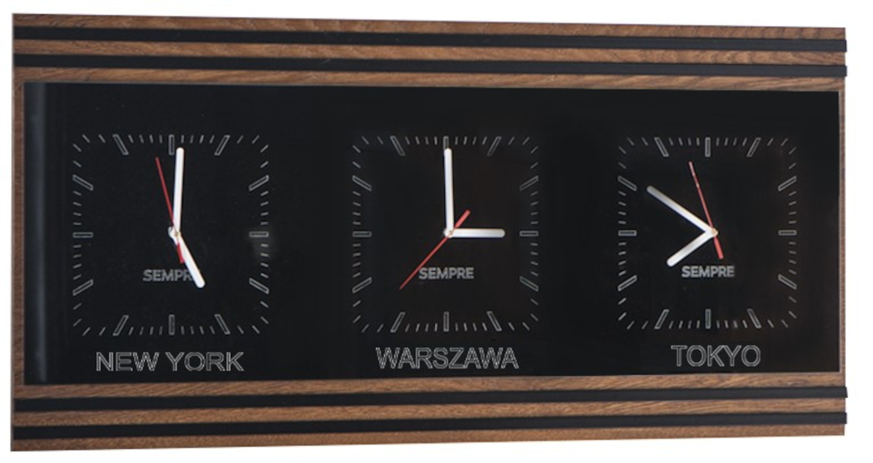 Hodiny jsou křemenné a mají tři různé ciferníky, tudíž můžete sledovat čas až ve třech světových městech. Nápisy pod hodinami lze libovolně změnit - váš výběr nám prosím napište do poznámky.