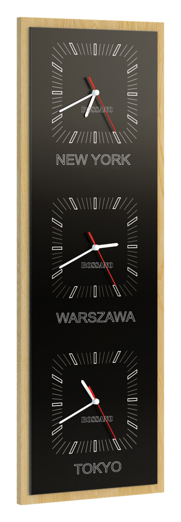 Trojité závěsné hodiny mají 3 ciferníky, tudíž můžete sledovat čas ve 3 světových městech. Nápisy lze libovolně změnit - váš výběr nám prosím napište do poznámky.