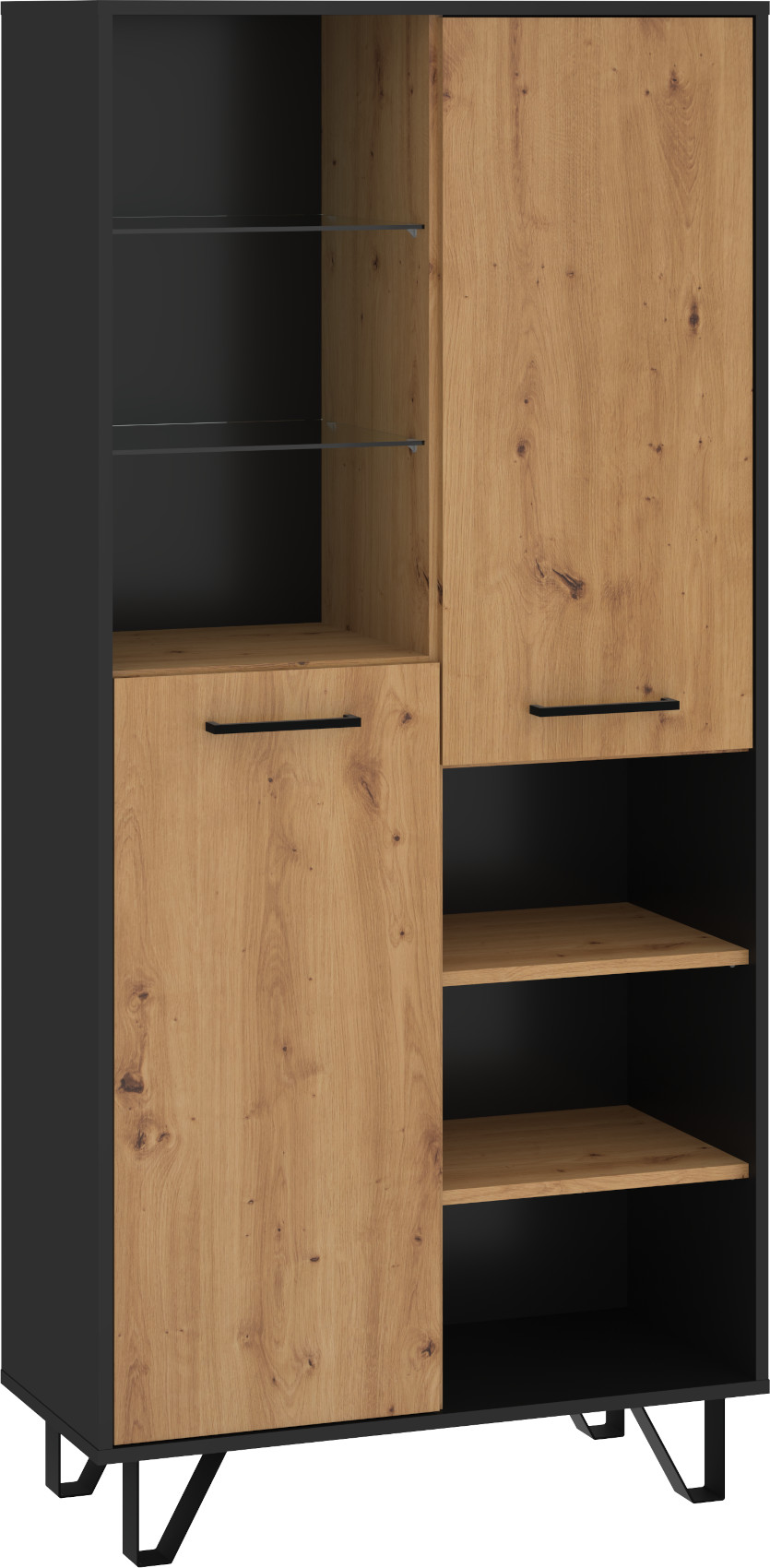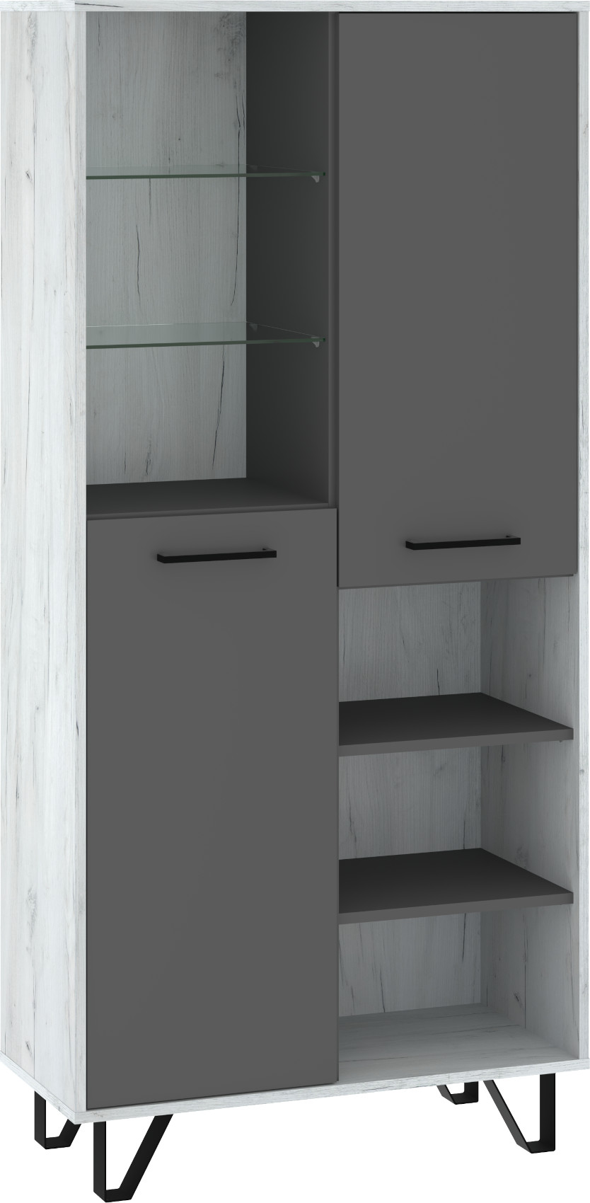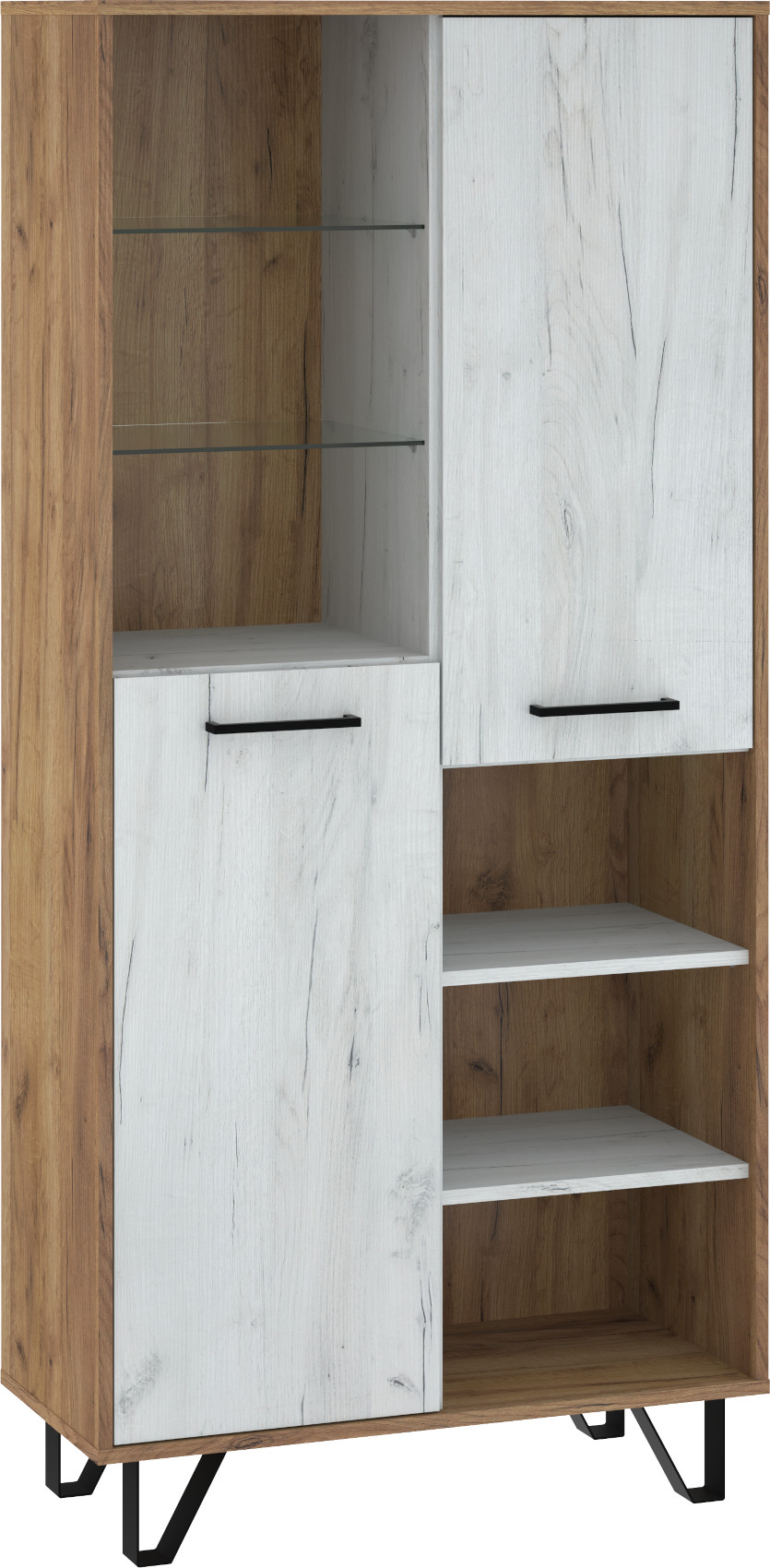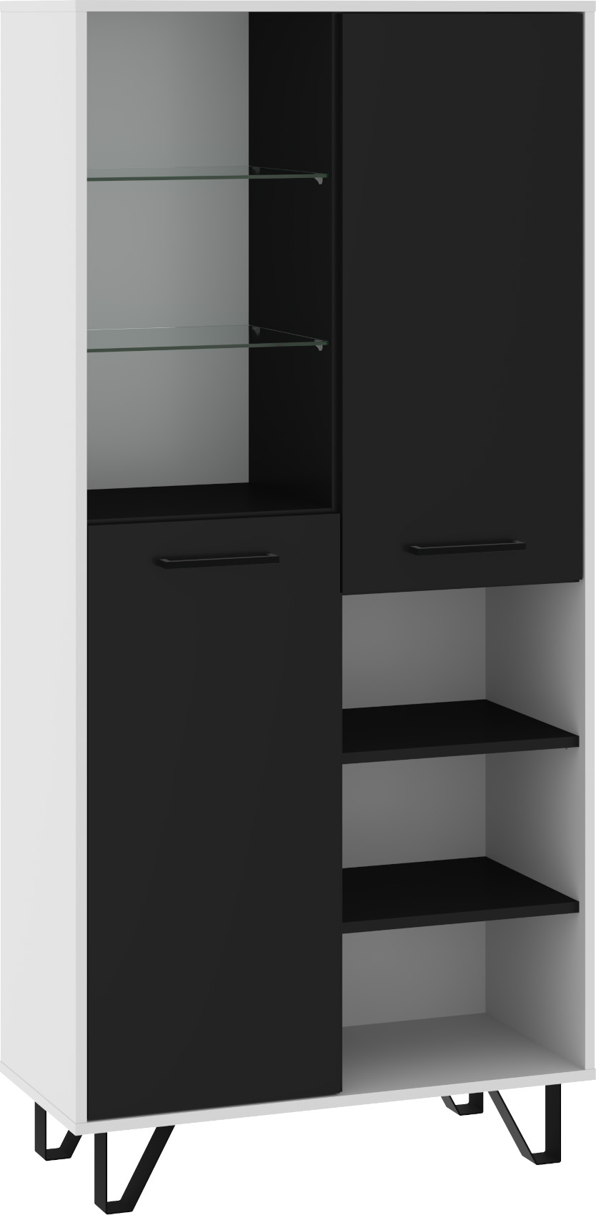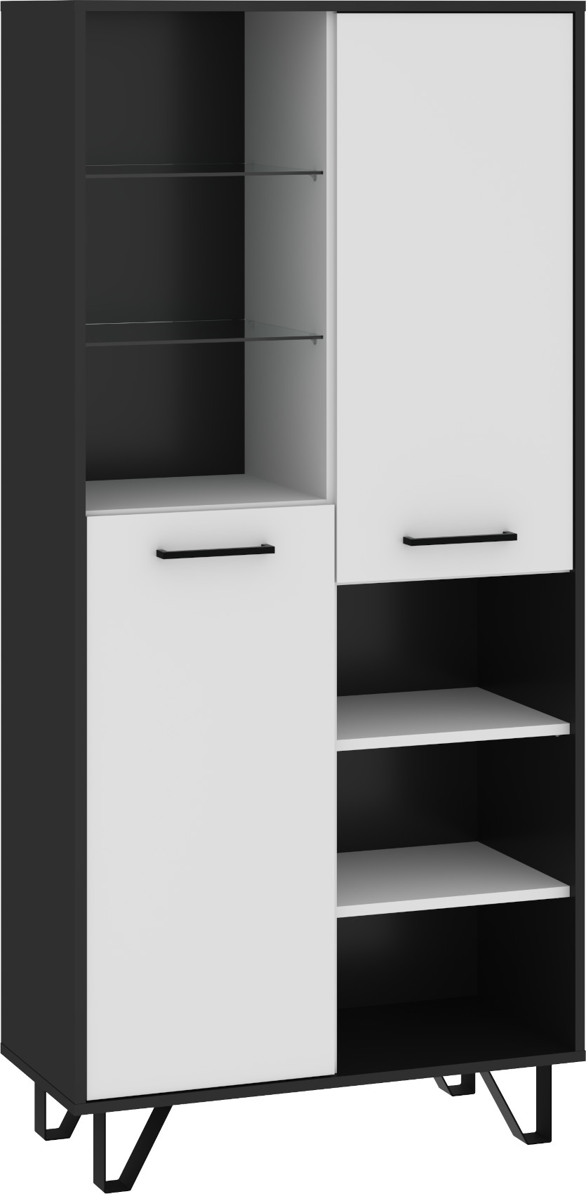 Součástí regálu jsou 2 dvířka, za kterými jsou vloženy 4 lakované police. Ve spodní pravé části jsou 2 lakované police a v horní levé části 2 skleněné police.