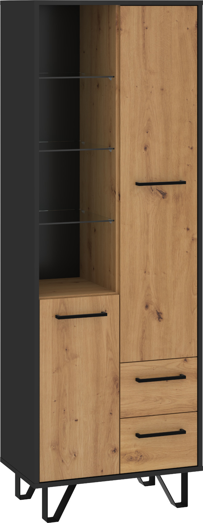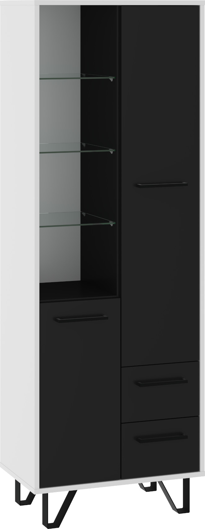 Součástí regálu jsou 2 dvířka, za kterými je vloženo 5 lakovaných polic. Ve spodní části jsou 2 zásuvky na kovových pojezdech. V horní levé části jsou 3 skleněné police.