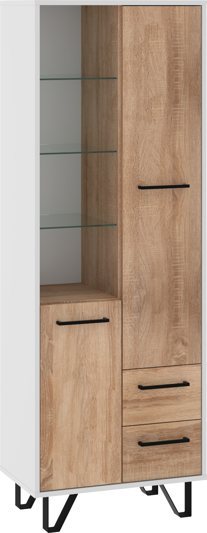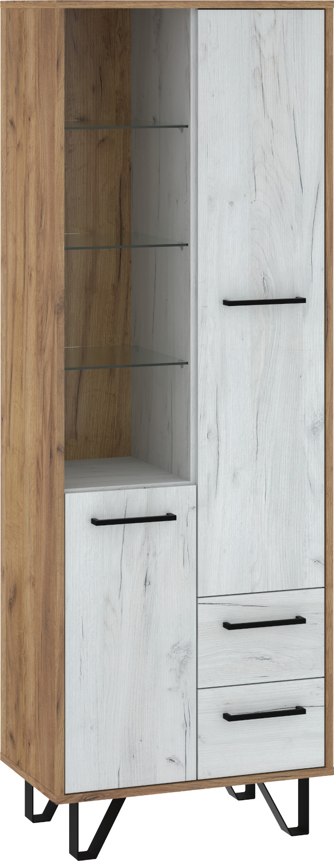 Regál Boss vás zaujme svým moderním elegantním designem a barevným provedením s přírodními detaily. Je vyroben z kvalitních lamino desek o síle 16 mm. Desky mají ABS hranění, které zvyšuje odolnost pro odštípnutí hran. Součástí zásuvek a dvířek jsou jednoduché kovové úchyty a zároveň mají zabudovaný systém tichého dovírání. Nábytek stojí na kovových nožkách, které provzdušní váš interiér. Nabízíme vám několik barevných variant.