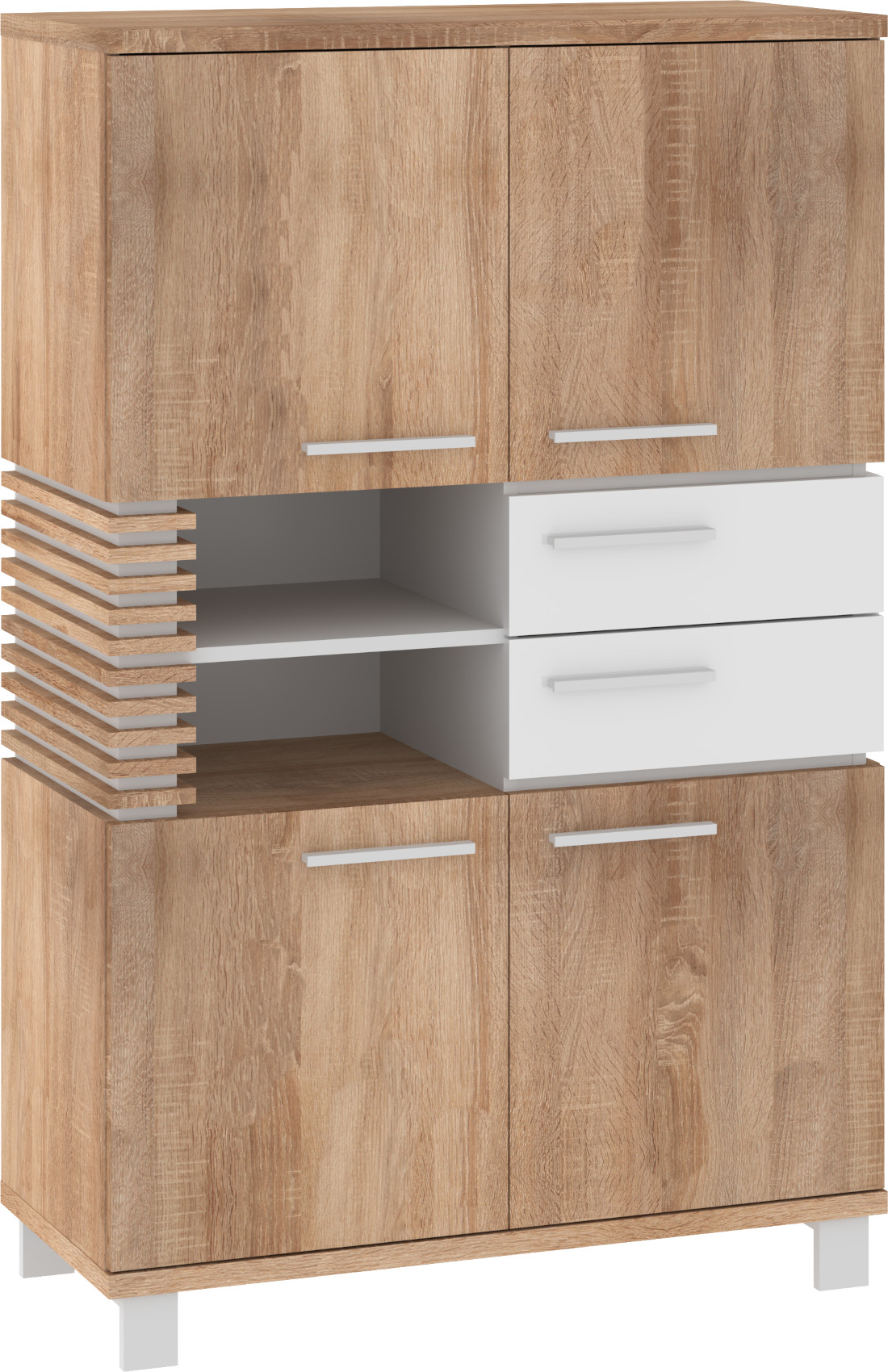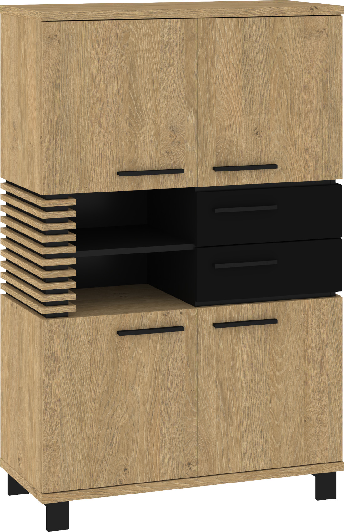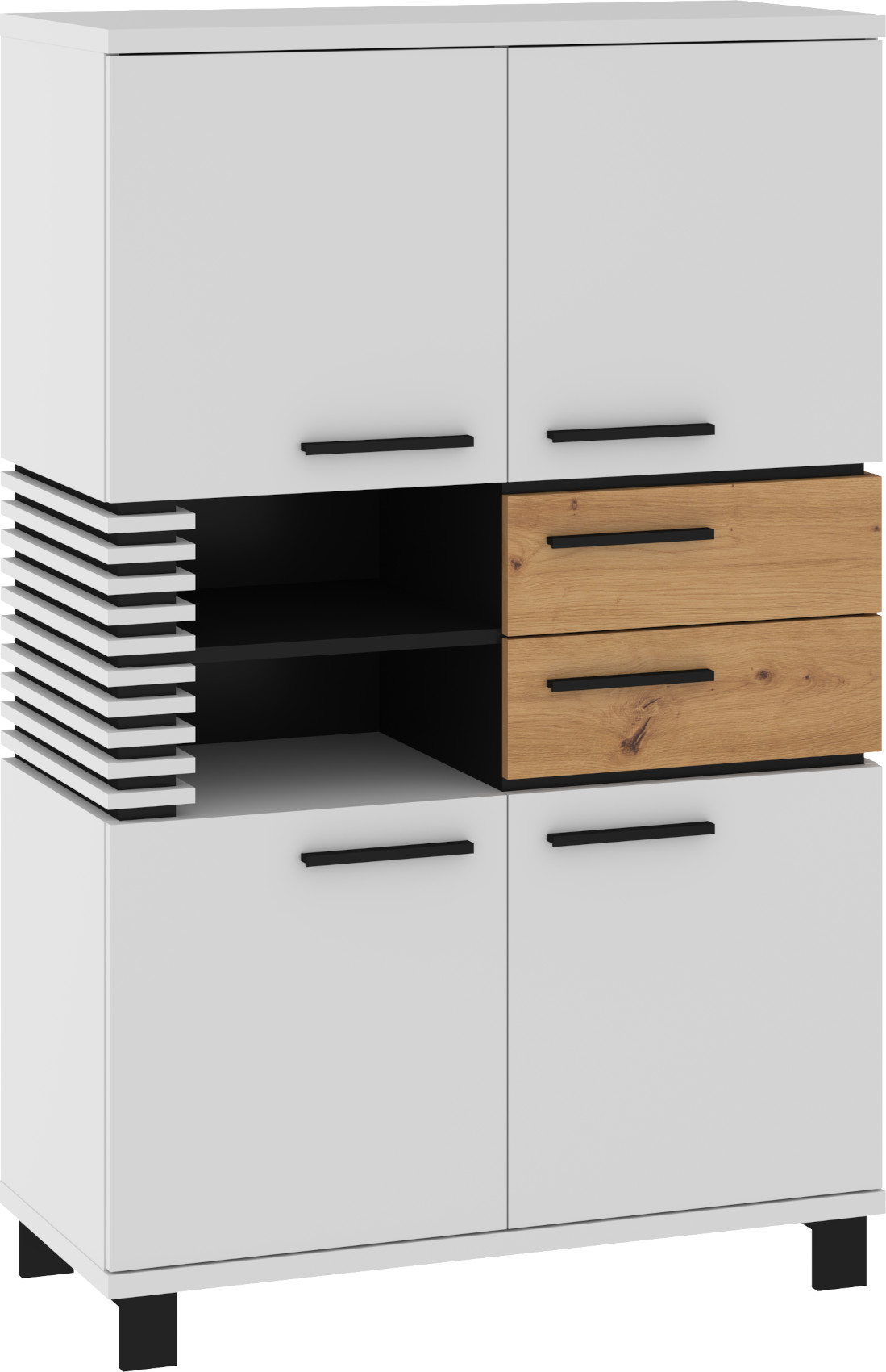 Součástí regálu jsou 4 dvířka se 4 lakovanými policemi a 2 zásuvky na kovových pojezdech. Nad levými spodními dvířky je police k vystavení vašich oblíbených dekorací nebo knih.