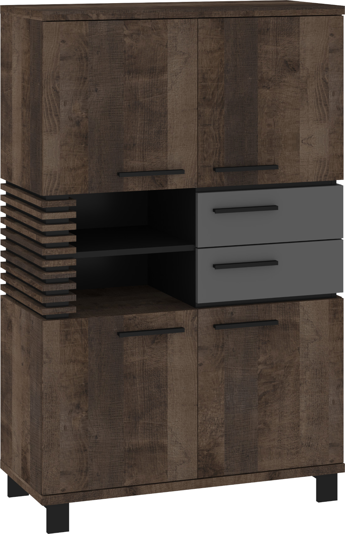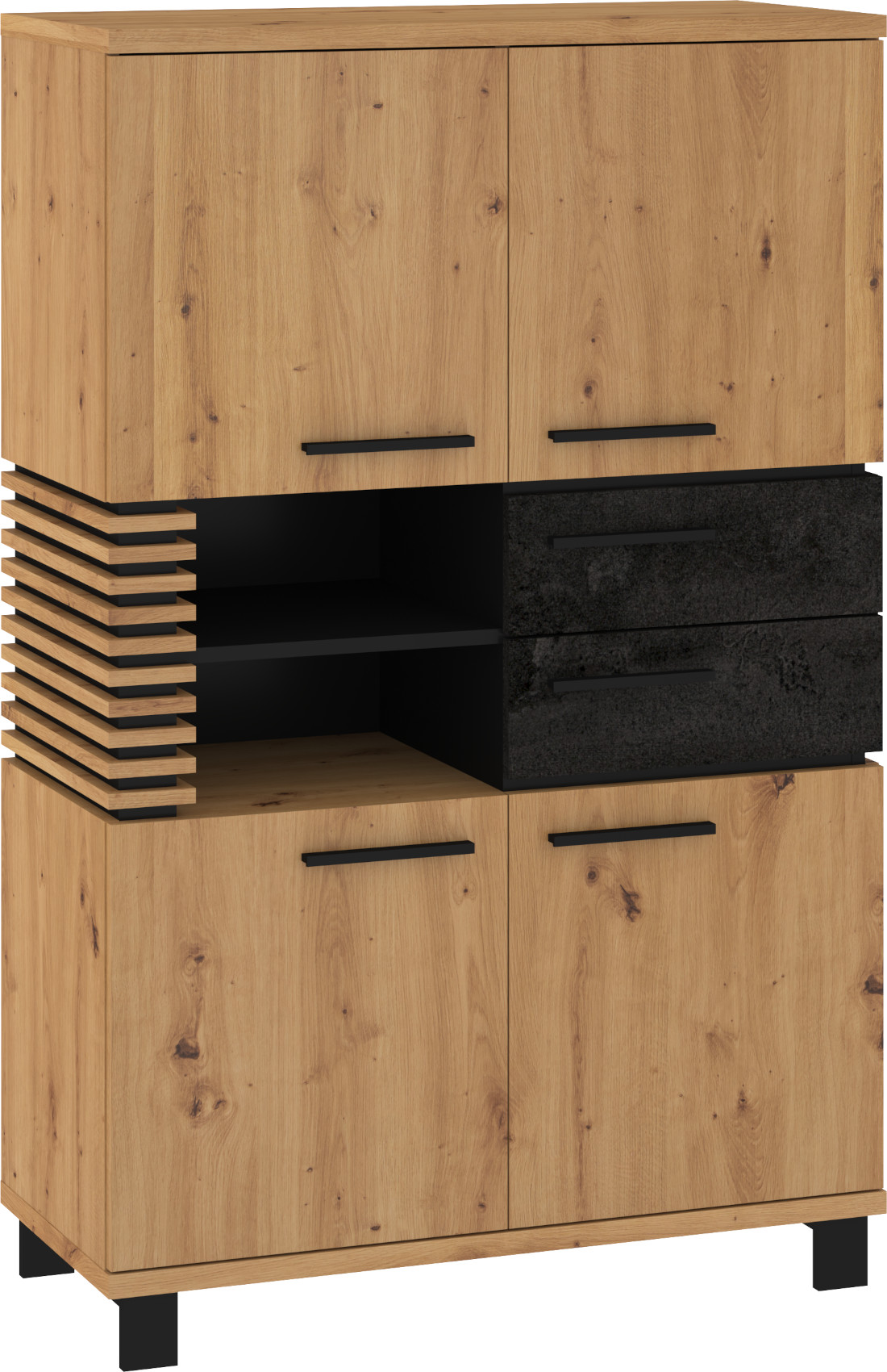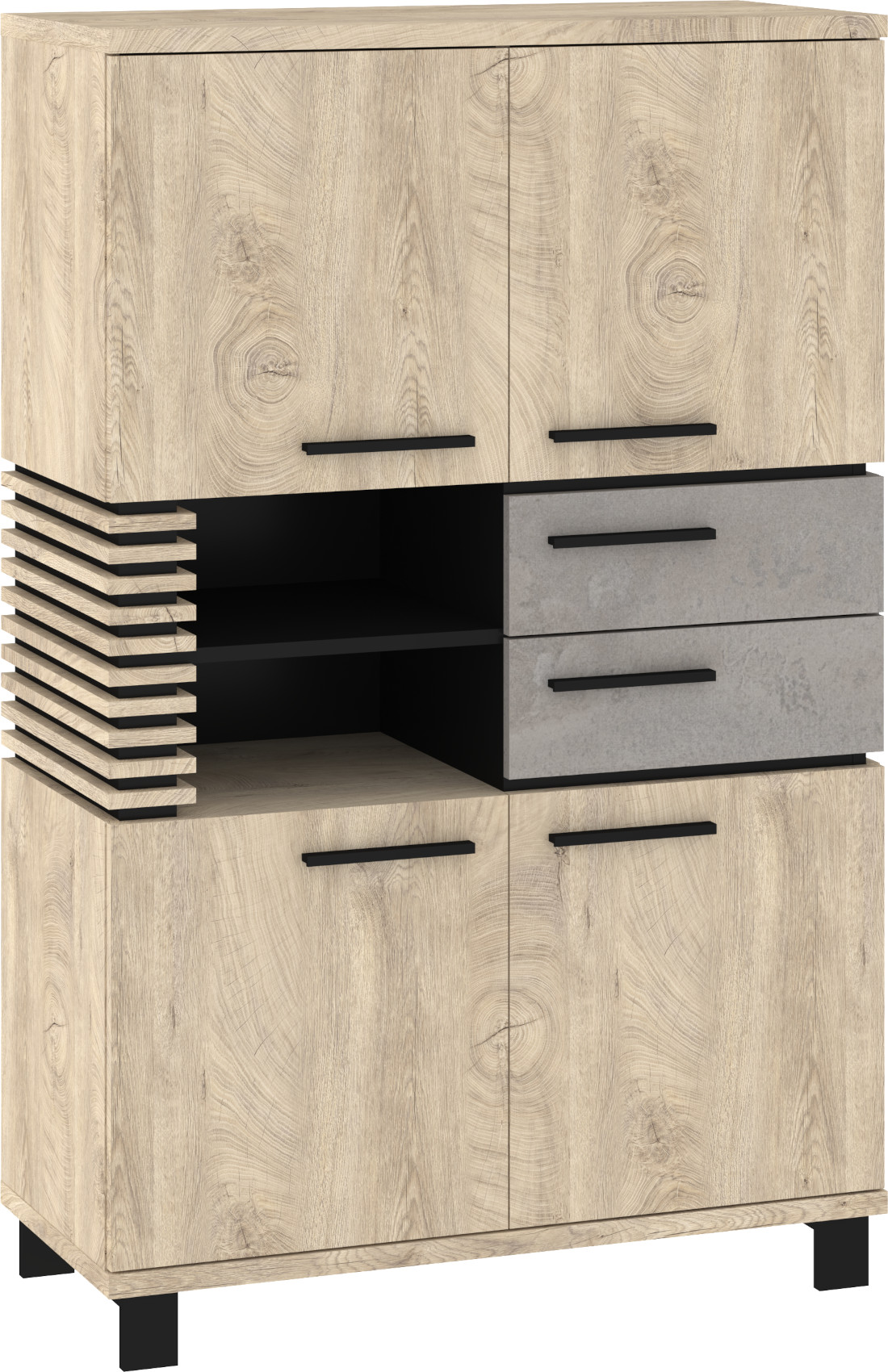 Součástí regálu jsou 4 dvířka se 4 lakovanými policemi a 2 zásuvky na kovových pojezdech. Nad levými spodními dvířky je police k vystavení vašich oblíbených dekorací nebo knih.