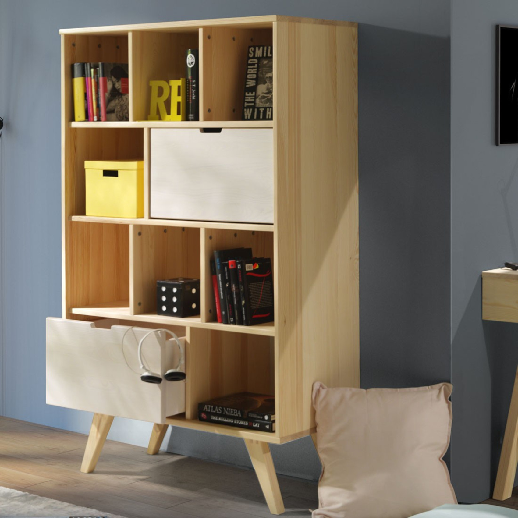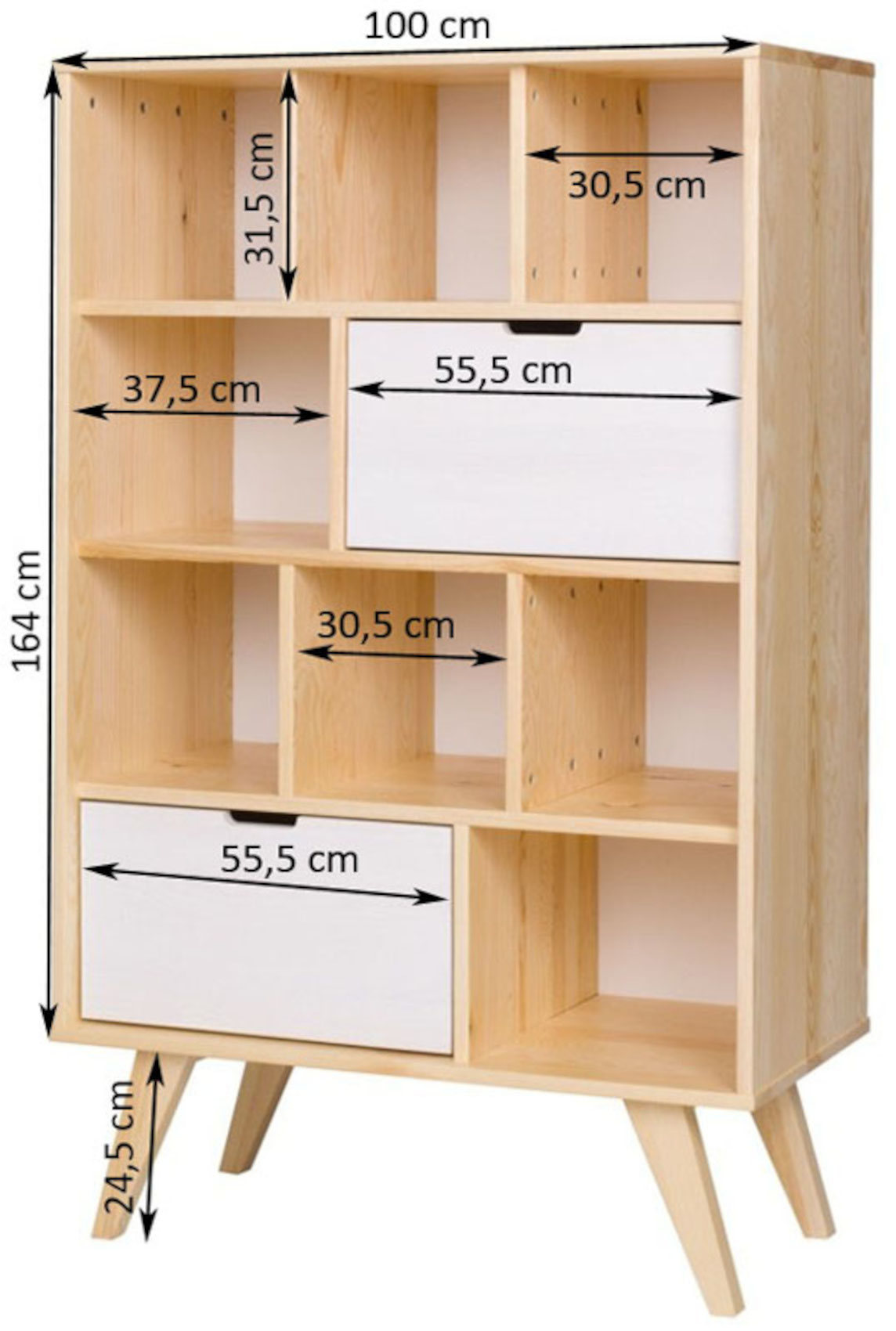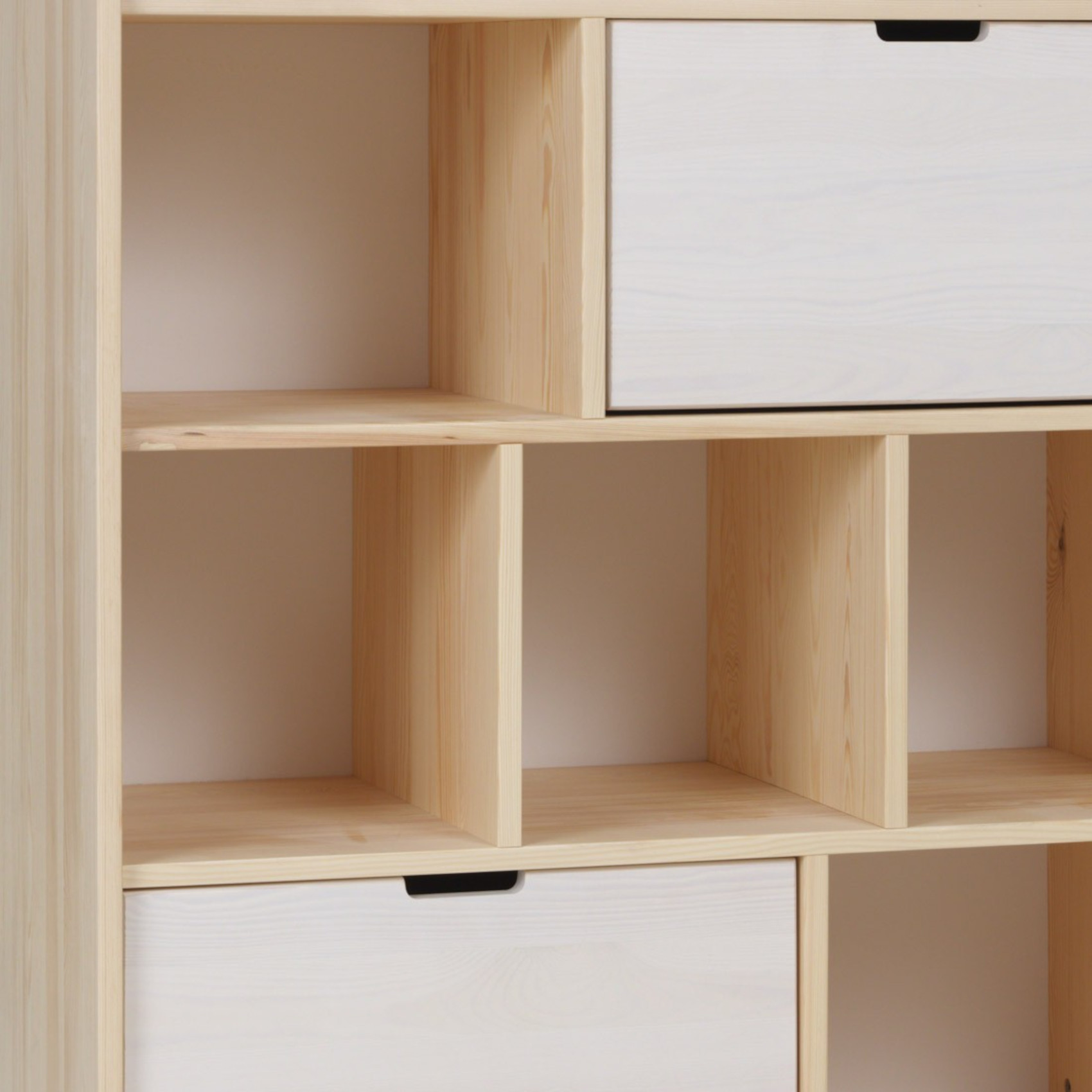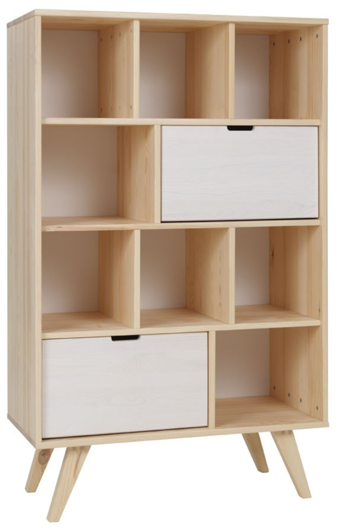 Regál má několik otevřených nik k vystavení oblíbených knih, dekorací nebo rámečků s fotografiemi. Součástí jsou také 2 zásuvky k uložení drobných nezbytností.