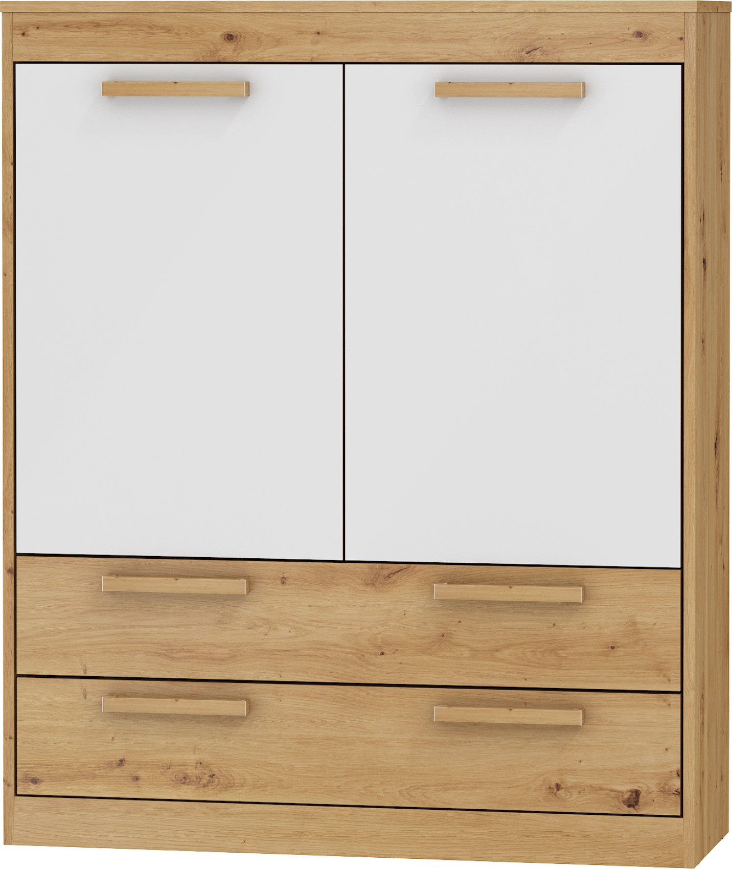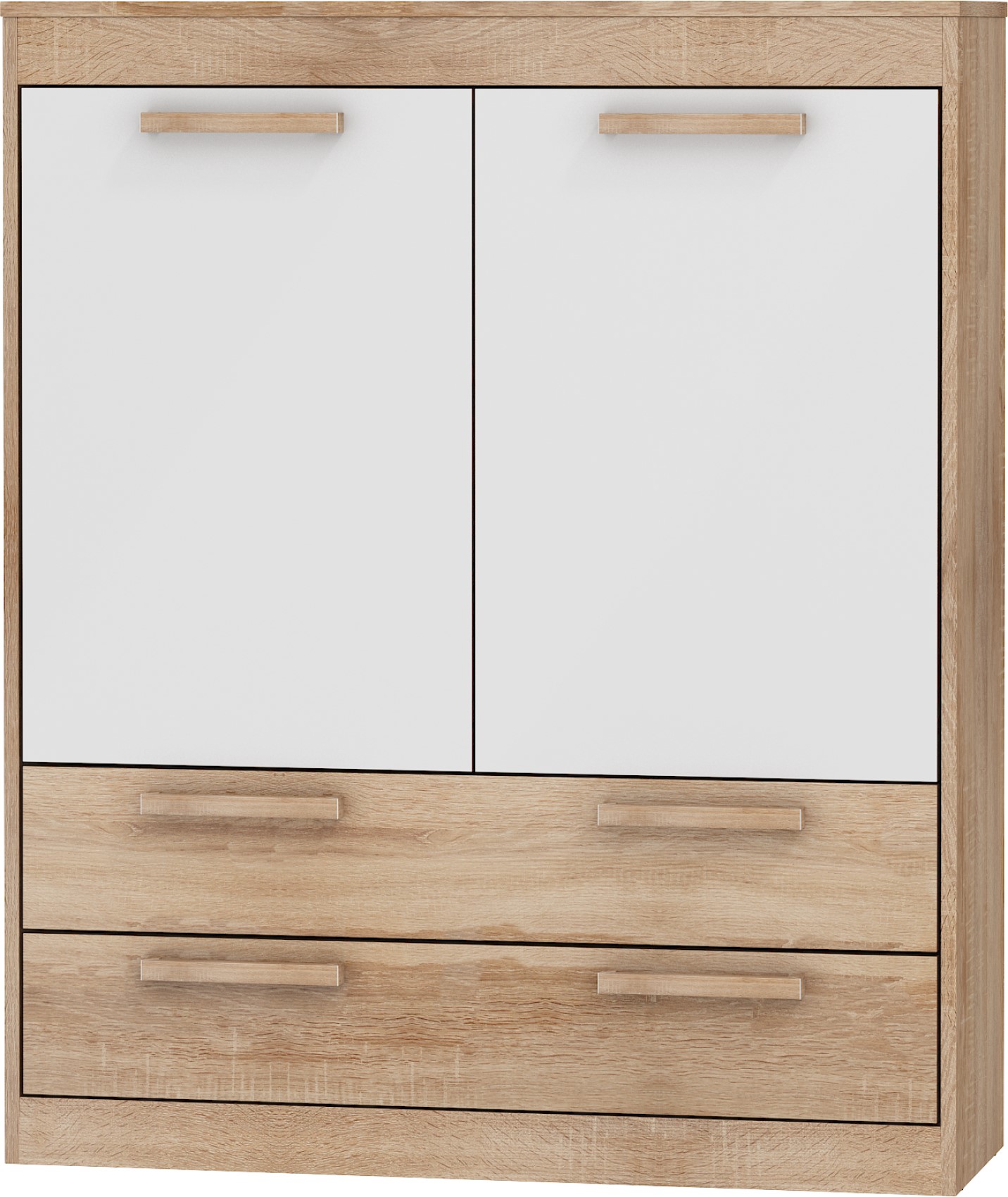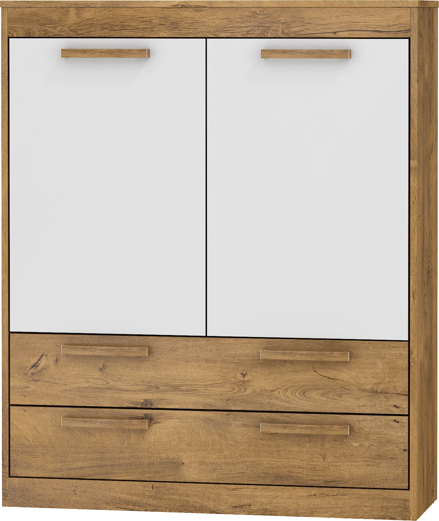 Komoda nabízí 2 plná dvířka, za kterými je vložena dlouhá lakovaná police. Pod dvířky jsou 2 zásuvky na kovových pojezdech, které můžete využít na uskladnění různých nezbytností.