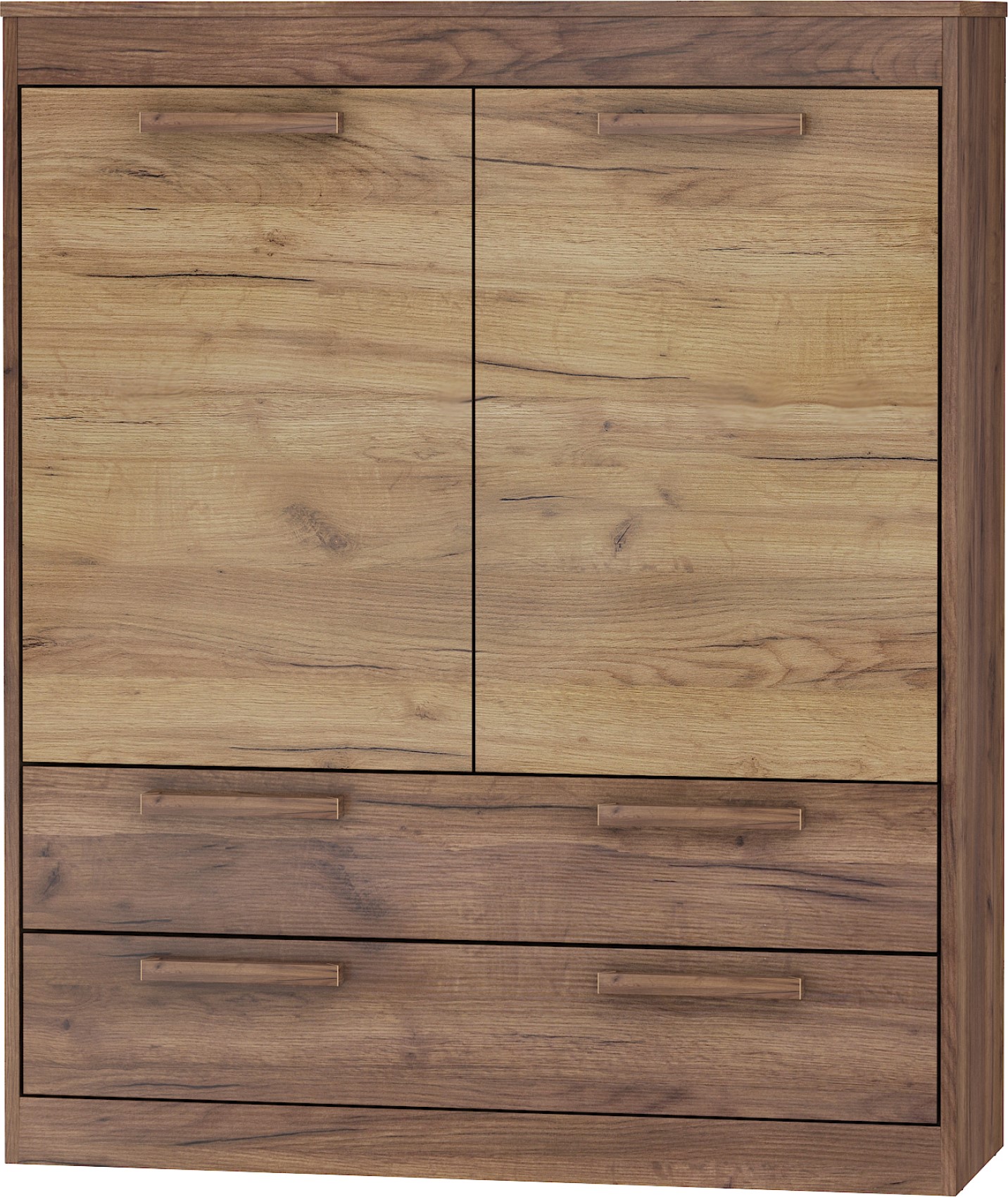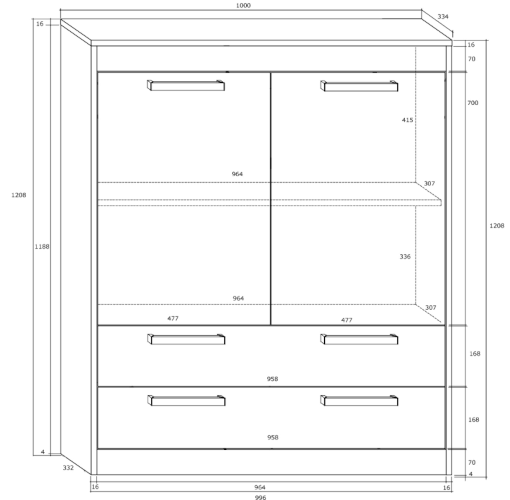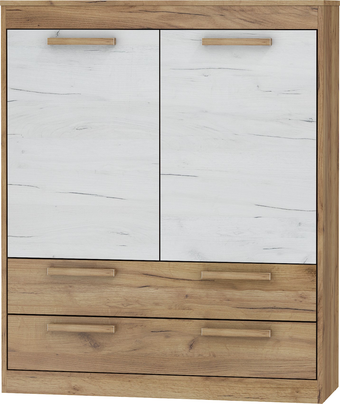 Komoda nabízí 2 plná dvířka, za kterými je vložena dlouhá lakovaná police. Pod dvířky jsou 2 zásuvky na kovových pojezdech, které můžete využít na uskladnění různých nezbytností.
