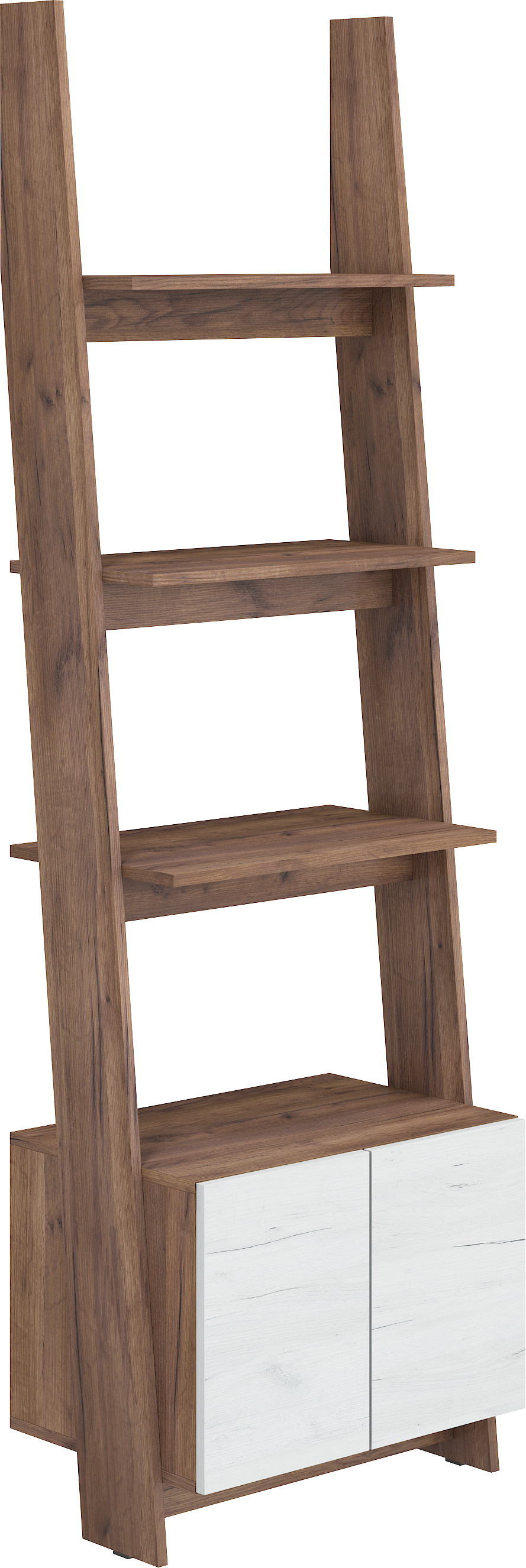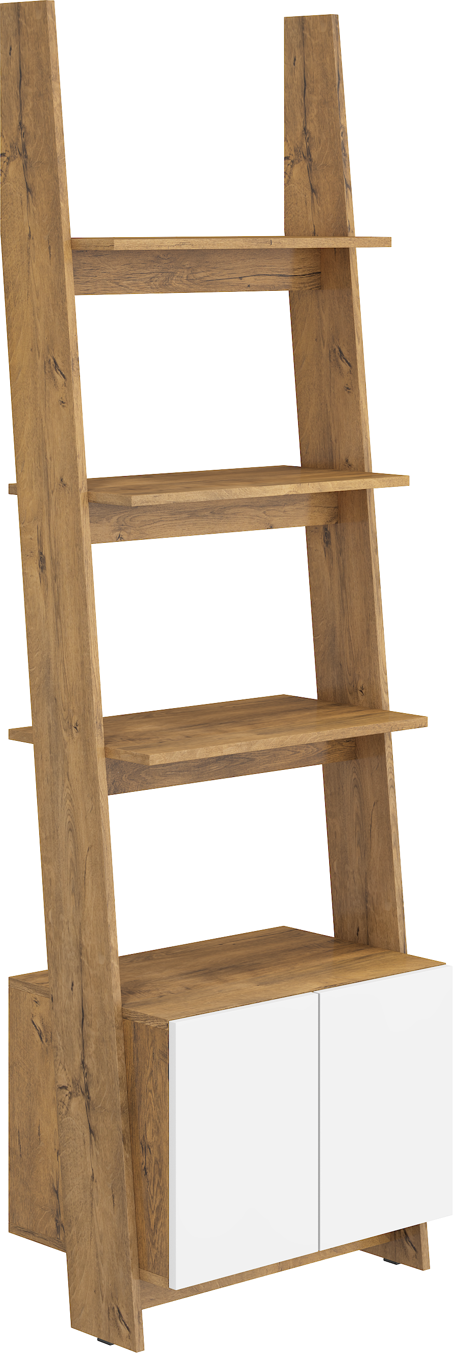 Regál má skříňku se 2 dvířky a 3 poličky.