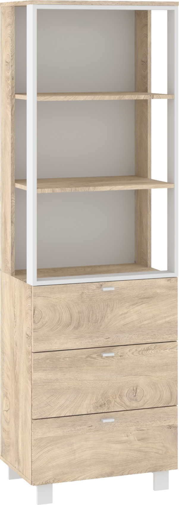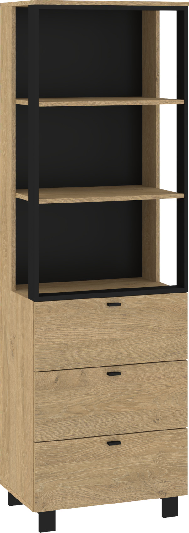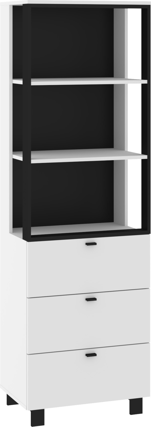 Součástí regálu jsou 3 zásuvky na kovových pojezdech. Nad zásuvkami jsou 3 otevřené niky k vystavení vašich oblíbených dekorací, knih či fotografií.