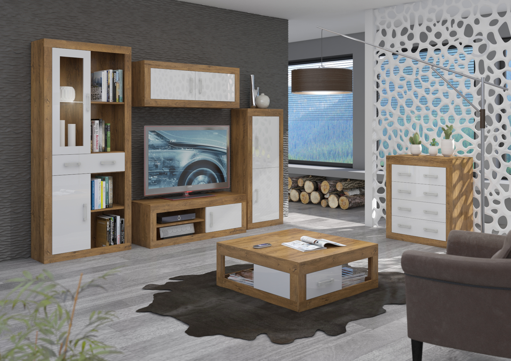 Regál Verin 13 se skvěle hodí do moderně zařízených interiérů. Zaujme vás svým neobvyklým avšak moderním designem a přírodním provedením. Je vyroben z kvalitních lamino desek o síle 16 mm. Nabízíme vám několik barevných variant. Zajímavý design barev dodává regálu ještě více na luxusu a nadčasovosti. Jednotlivé díly jsou variabilní, lze je navzájem kombinovat a vytvořit si tak obývací sestavu podle svých představ.