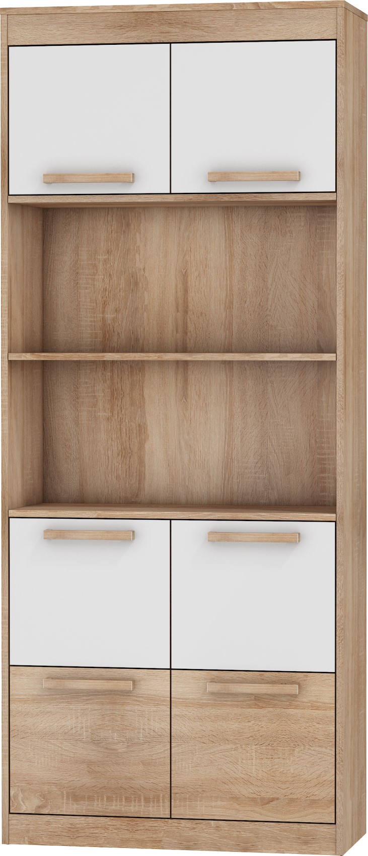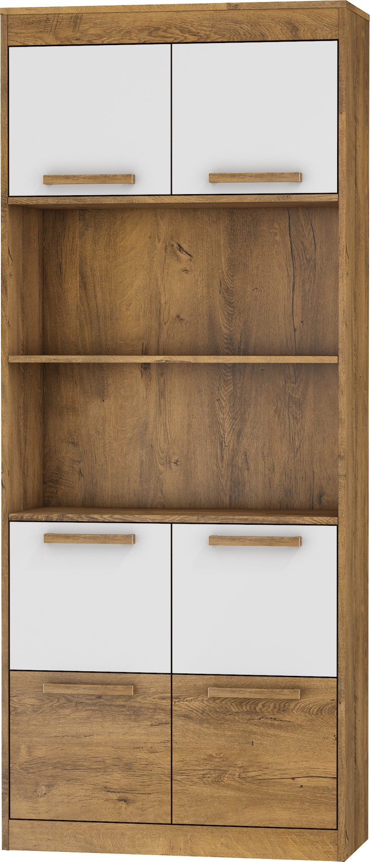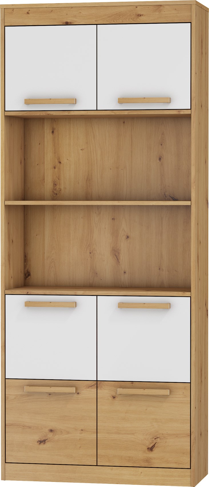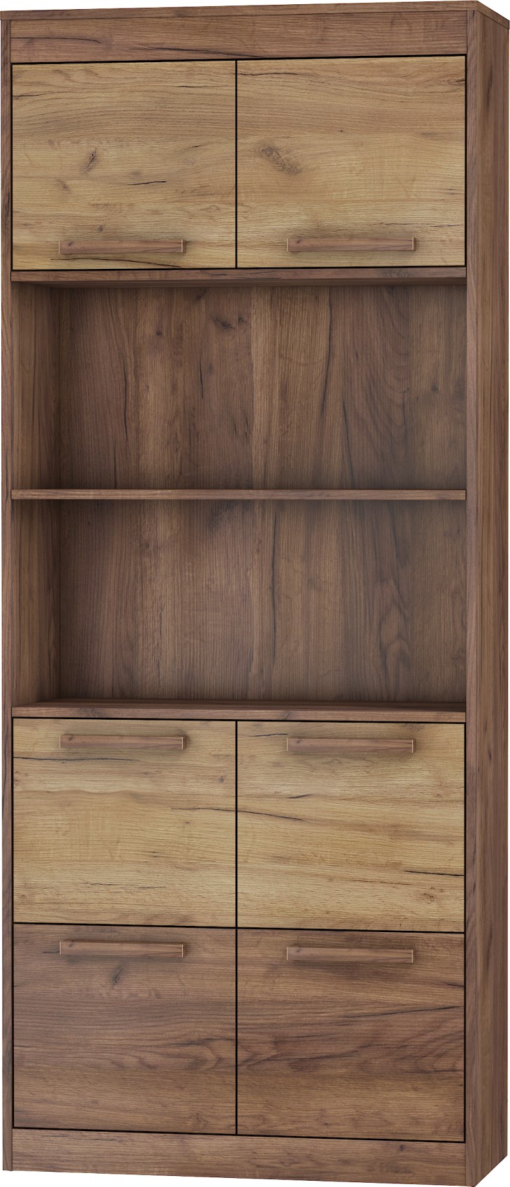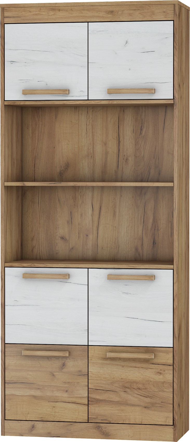 Součástí regálu je 6 skříněk s plnými dvířky a 2 otevřené niky k vystavení vašich oblíbených knih, dekorací či rámečků s fotografiemi.