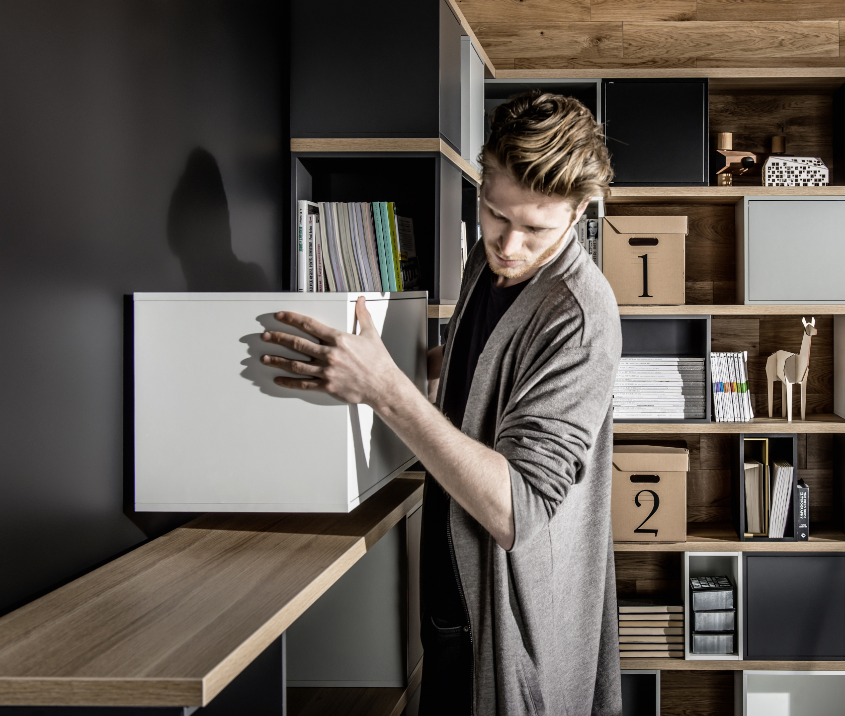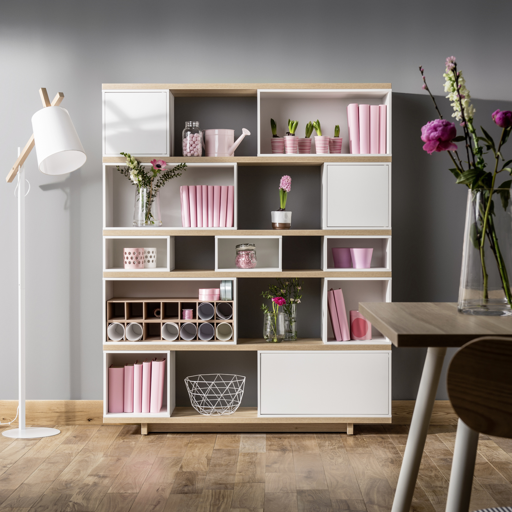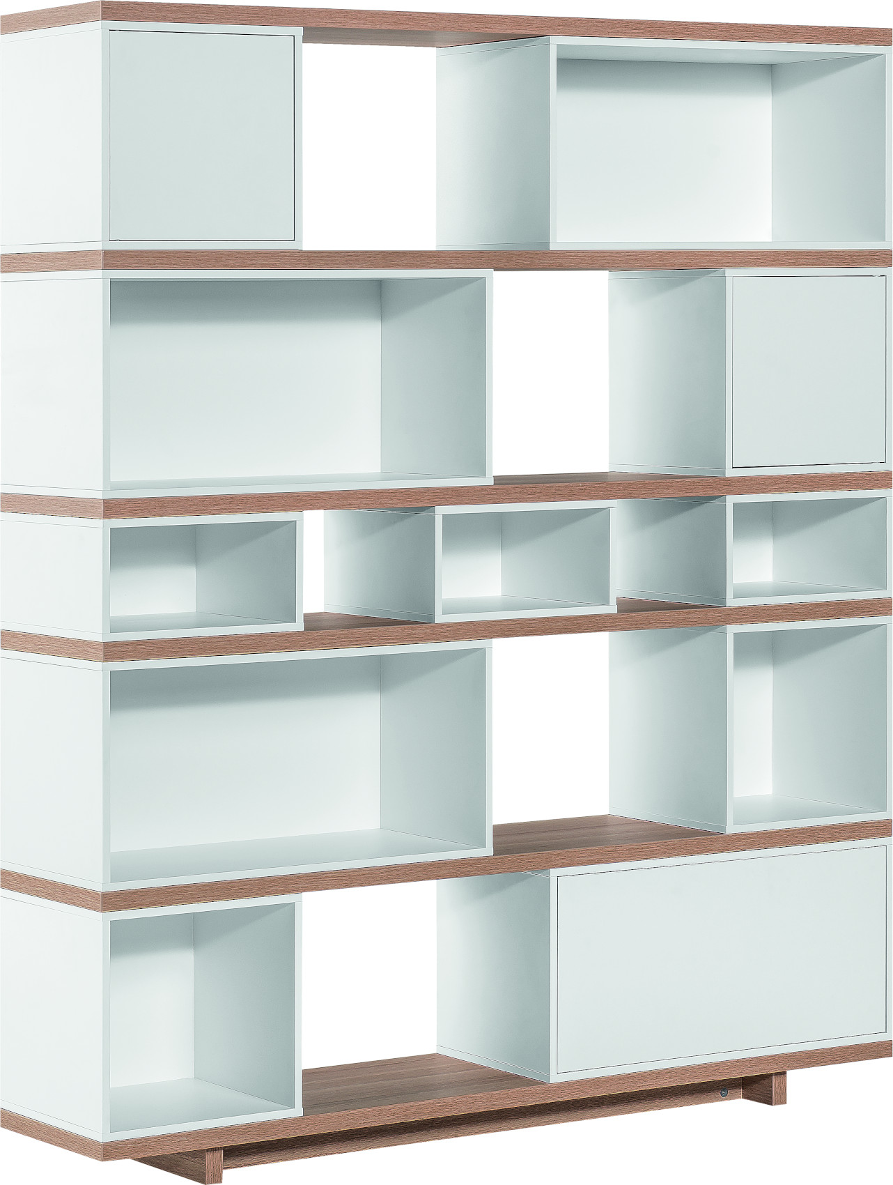 Součástí regálu je několik otevřených nik k vystavení vašich oblíbených knih, dekorací a rámečků s fotografiemi. Mezi nikami jsou vloženy také uzavíratelné skříňky, do kterých si můžete ukládat veškeré nezbytnosti.