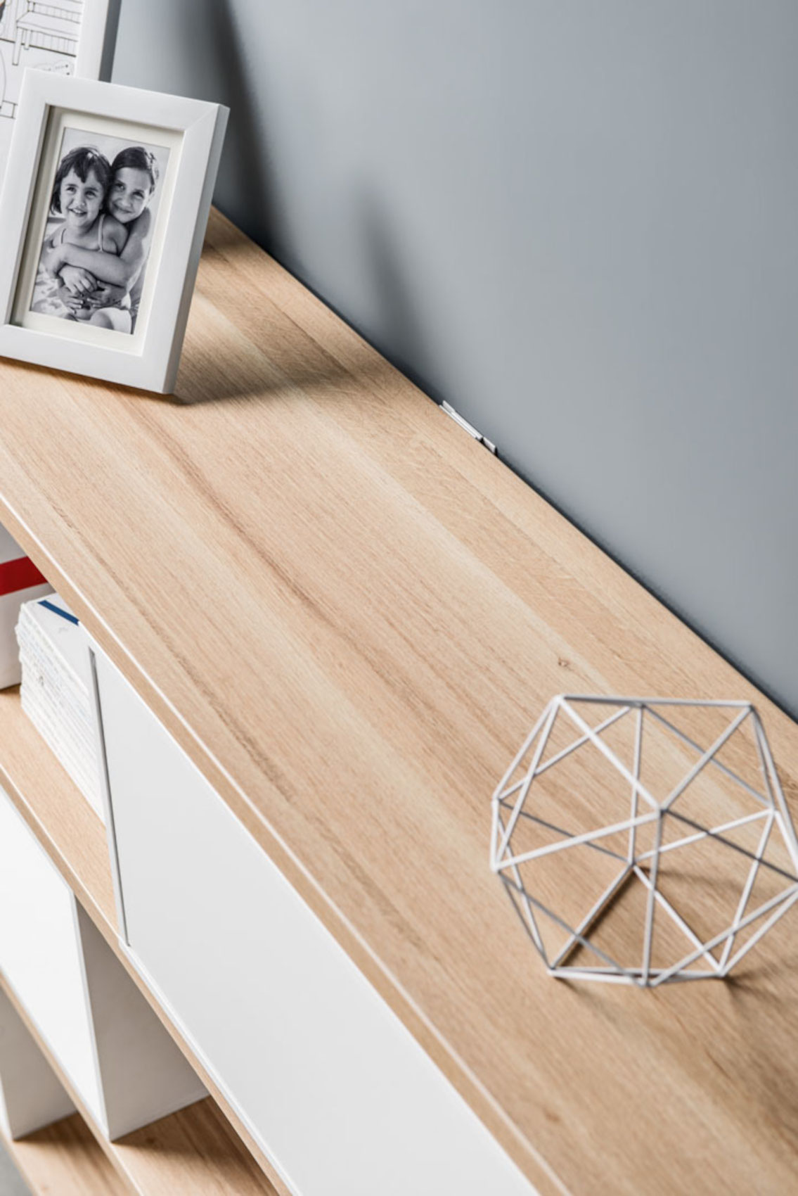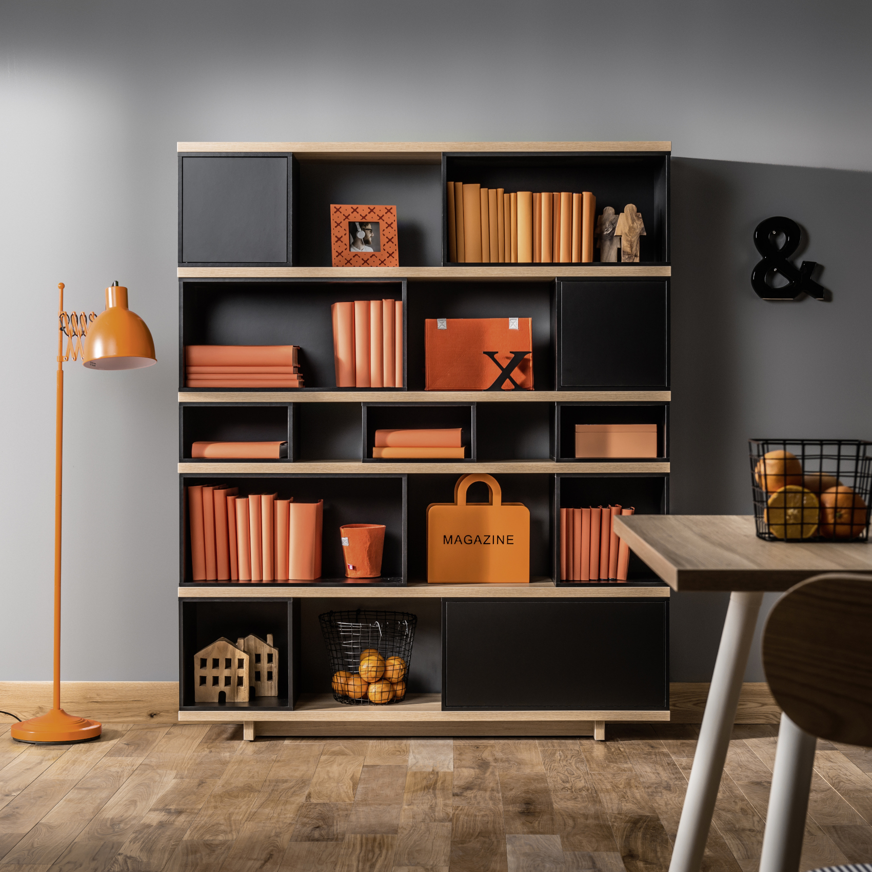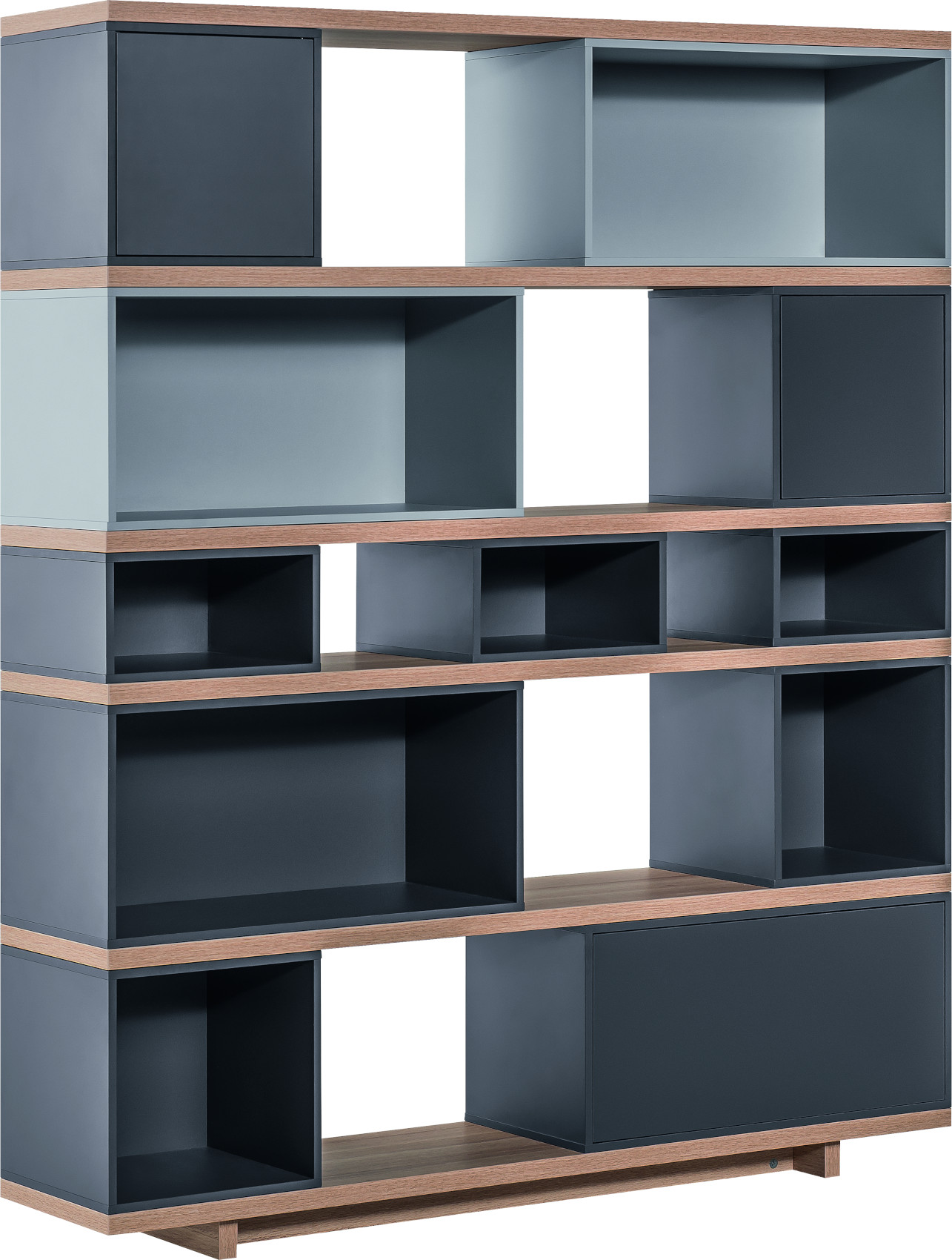 Součástí regálu je několik otevřených nik k vystavení vašich oblíbených knih, dekorací a rámečků s fotografiemi. Mezi nikami jsou vloženy také uzavíratelné skříňky, do kterých si můžete ukládat veškeré nezbytnosti.