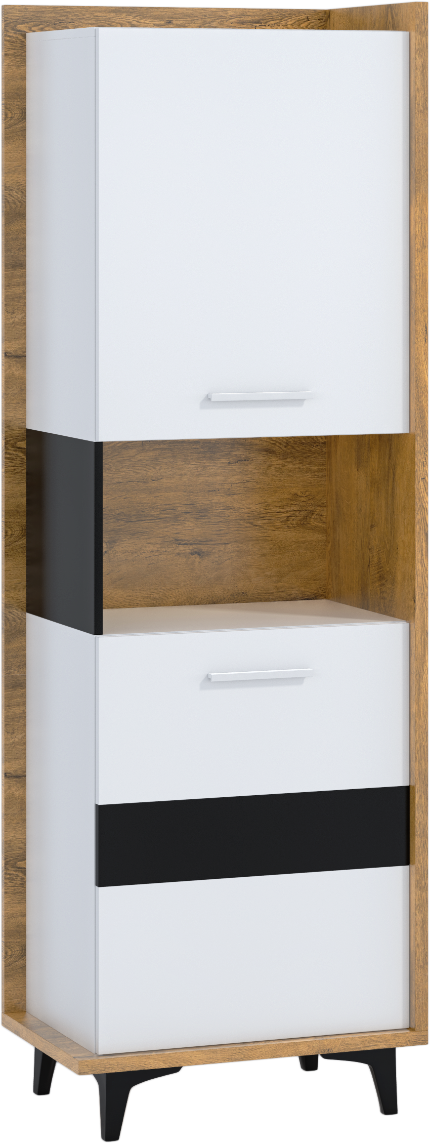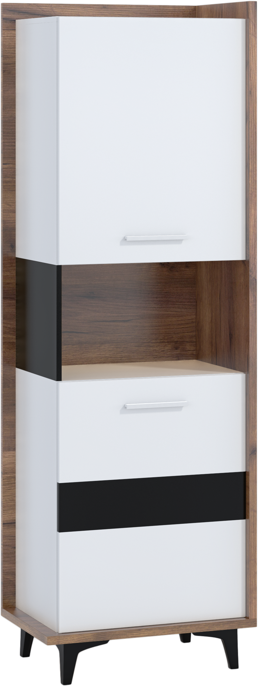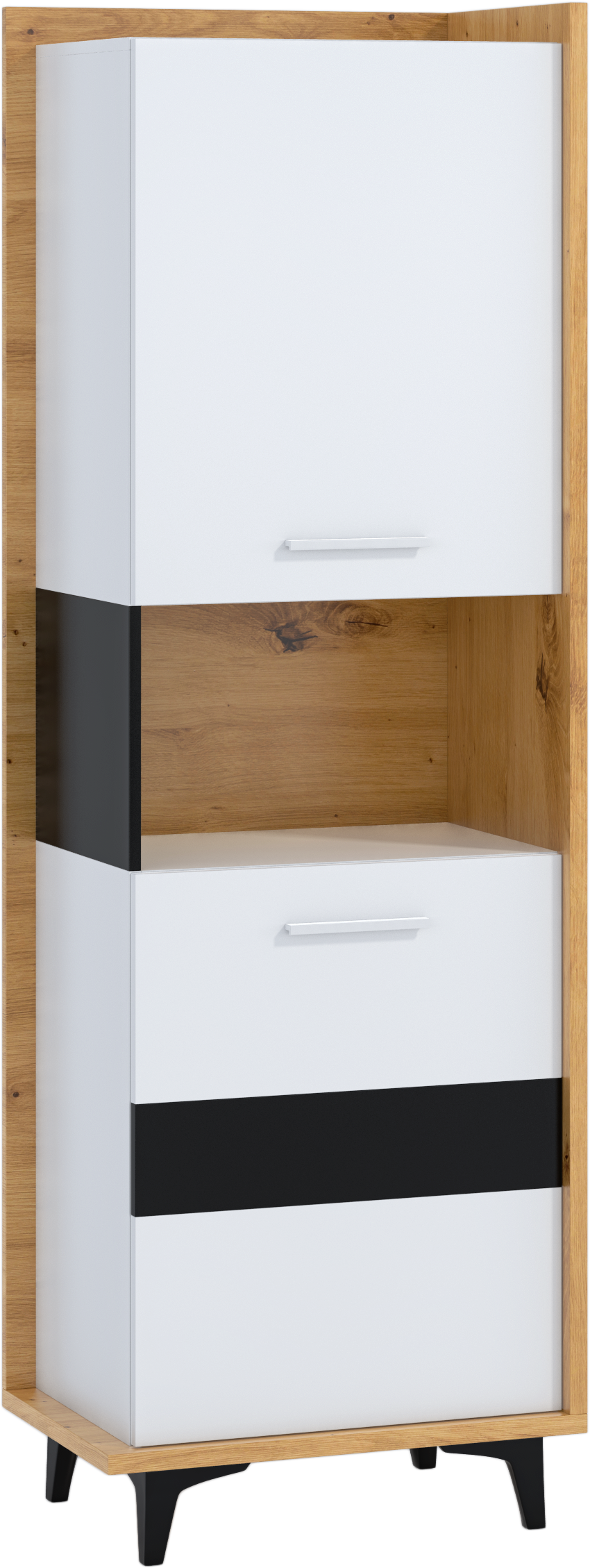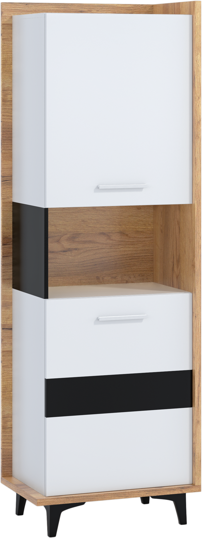 V horní a spodní části jsou plná dvířka, za kterými jsou vloženy 3 lakované police. Uprostřed se nachází otevřená nika k vystavení vašich oblíbených knih, dekorací či rámečků s fotografiemi.