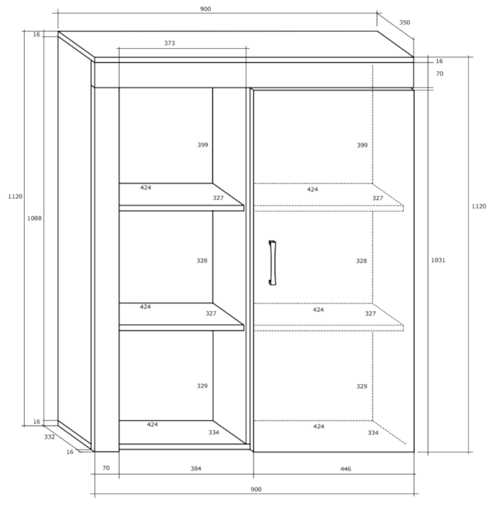Součástí regálu jsou 1 dvířka, za kterými jsou vloženy 2 lakované police. Na levé straně jsou 2 otevřené niky k vystavení vašich oblíbených knih, dekorací či jiných nezbytností.