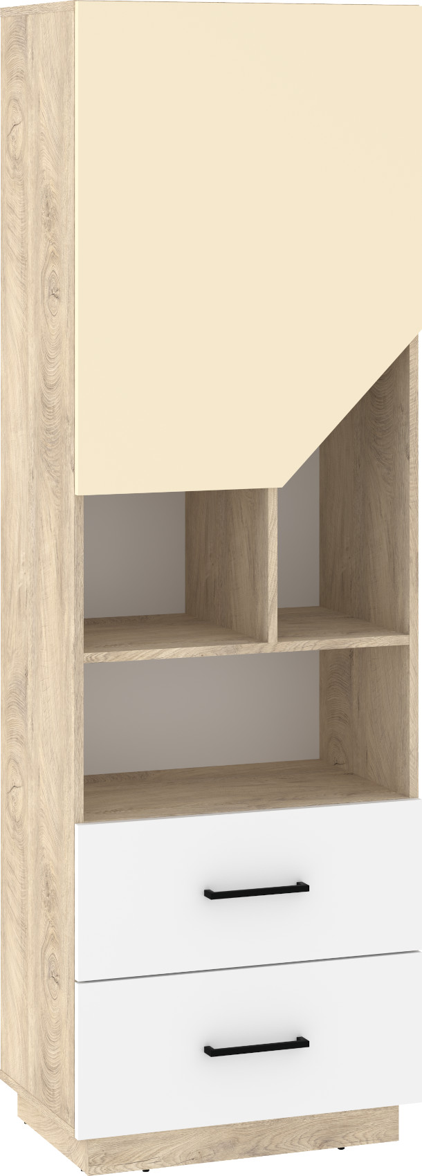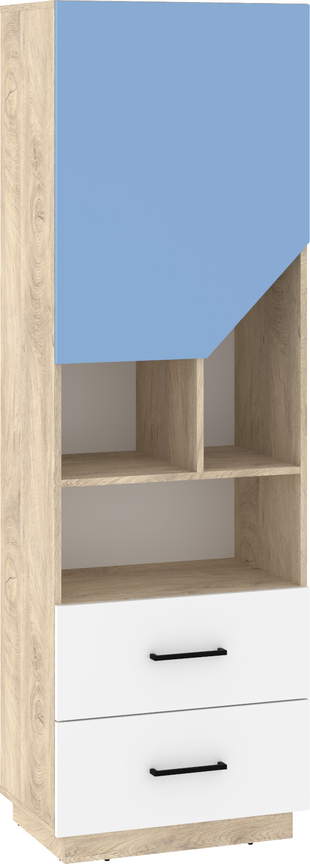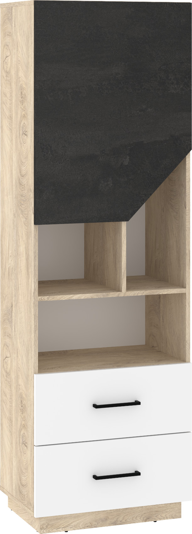 Regál má 1 dvířka a 2 zásuvky na kovových pojezdech, kam schováte všechny věci, co potřebujete mít po ruce. Nad zásuvkami jsou 3 otevřené niky k vystavení vašich oblíbených knih či dekorací.