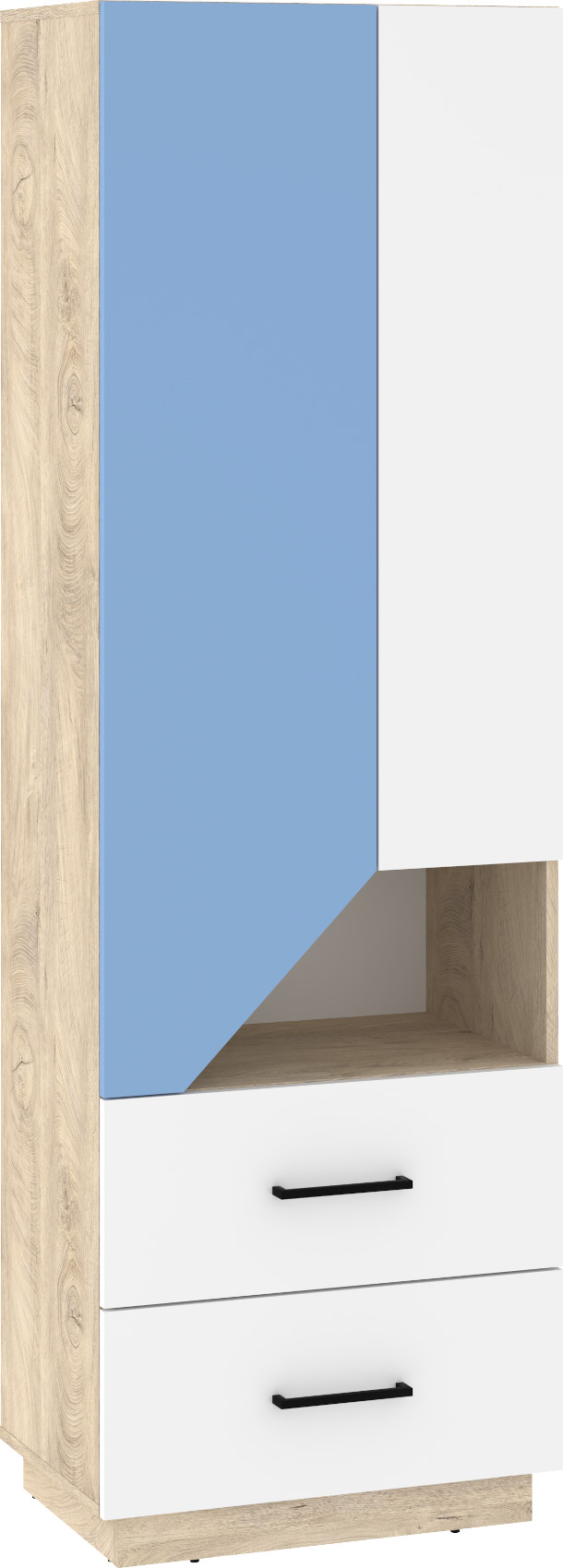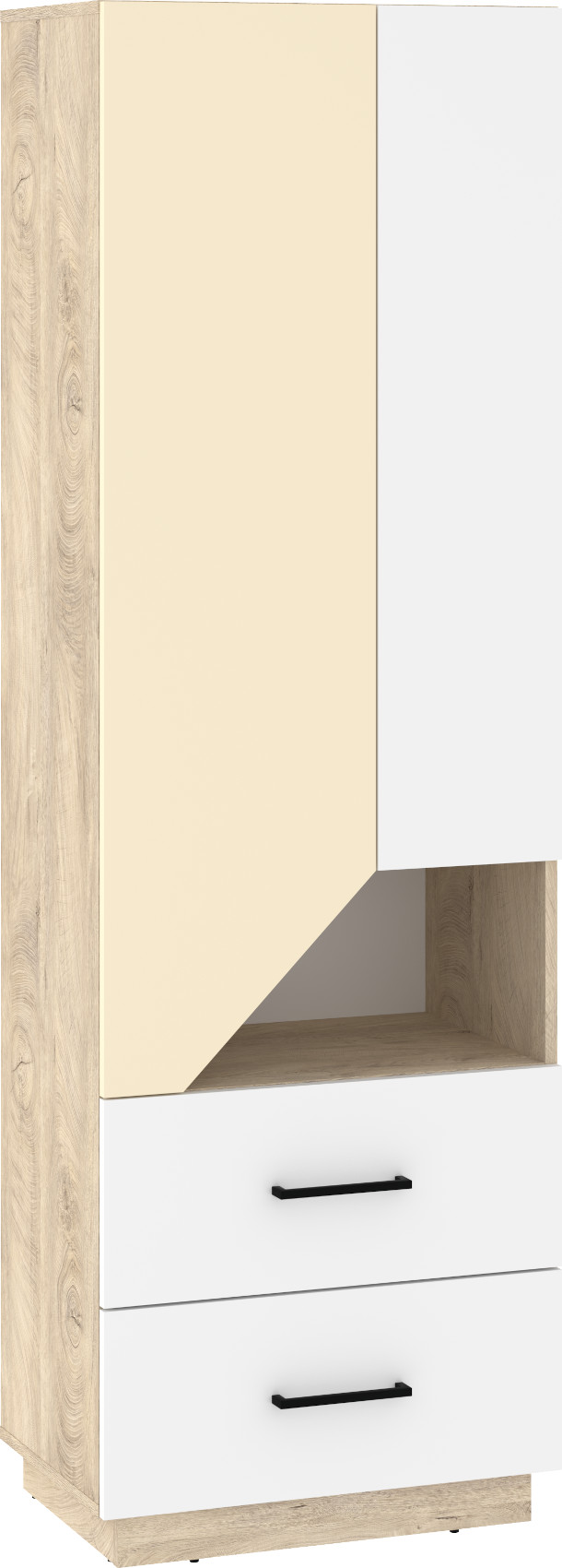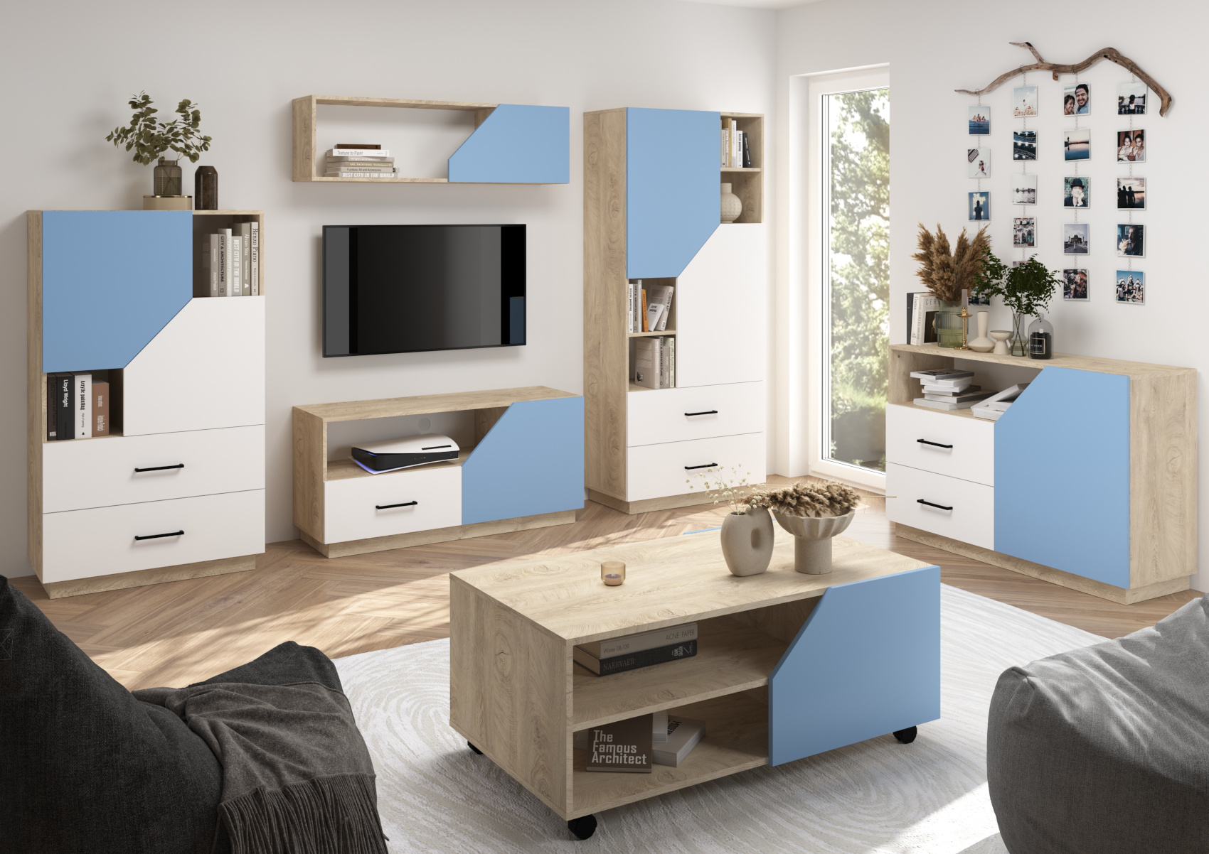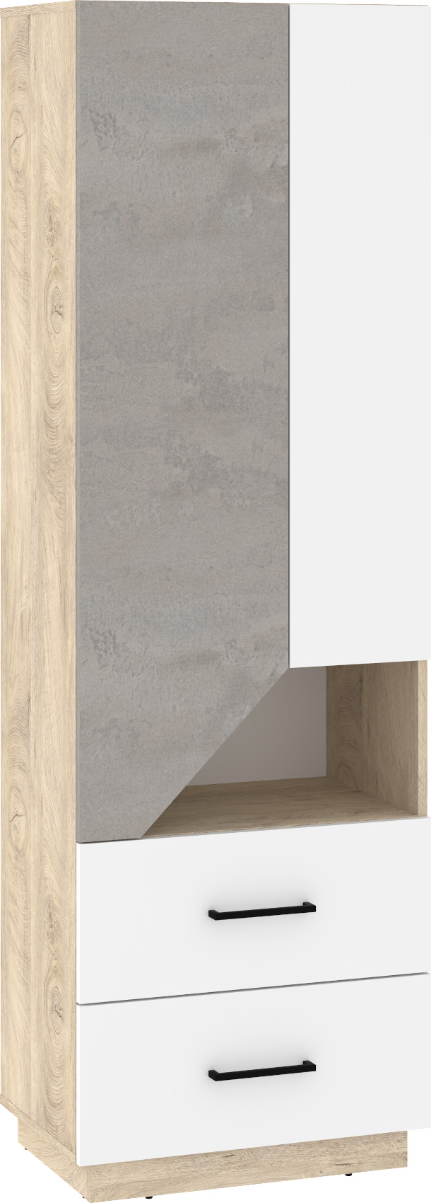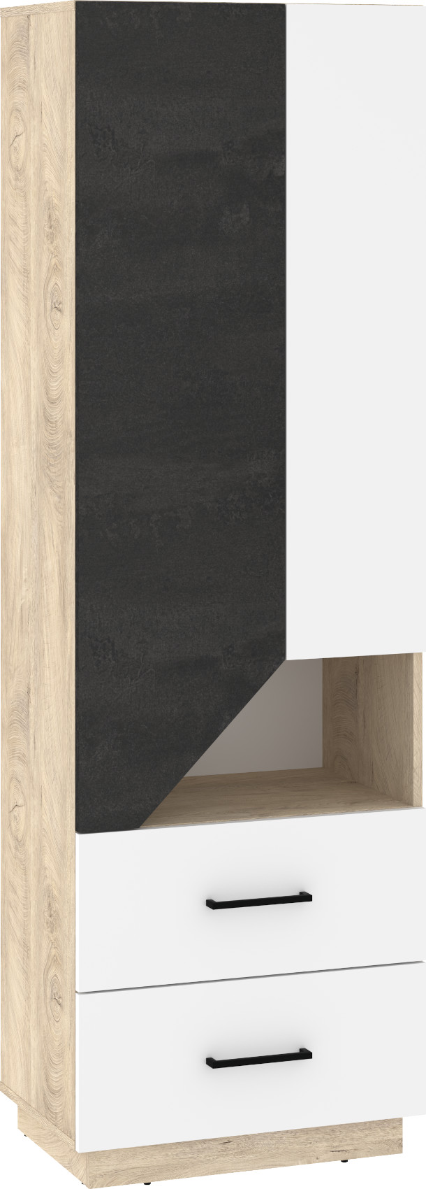 Regál má 2 dvířka a 2 zásuvky na kovových pojezdech, kam schováte všechny věci, co potřebujete mít po ruce. Nad zásuvkami je 1 otevřená nika k vystavení vašich oblíbených knih či dekorací.