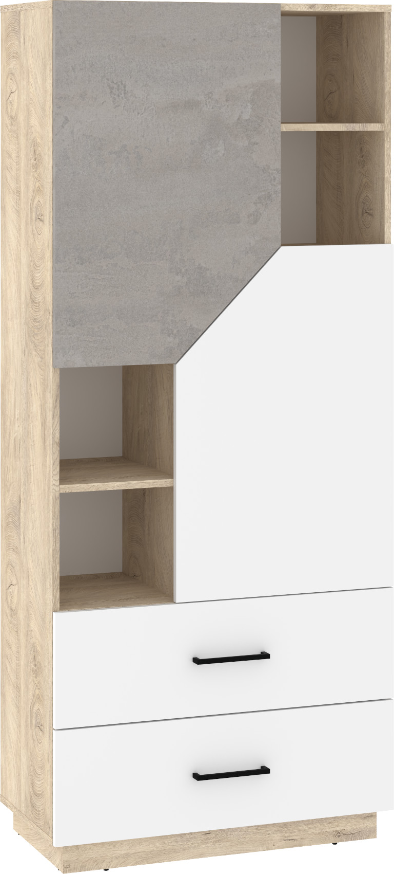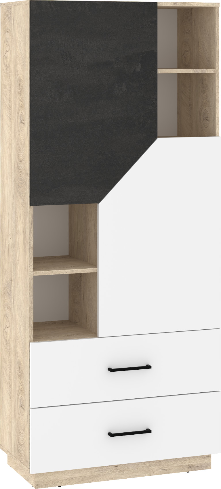 Regál má 2 dvířka a 2 zásuvky na kovových pojezdech, kam schováte všechny věci, co potřebujete mít po ruce. Nad zásuvkami jsou 4 otevřené niky k vystavení vašich oblíbených knih či dekorací.