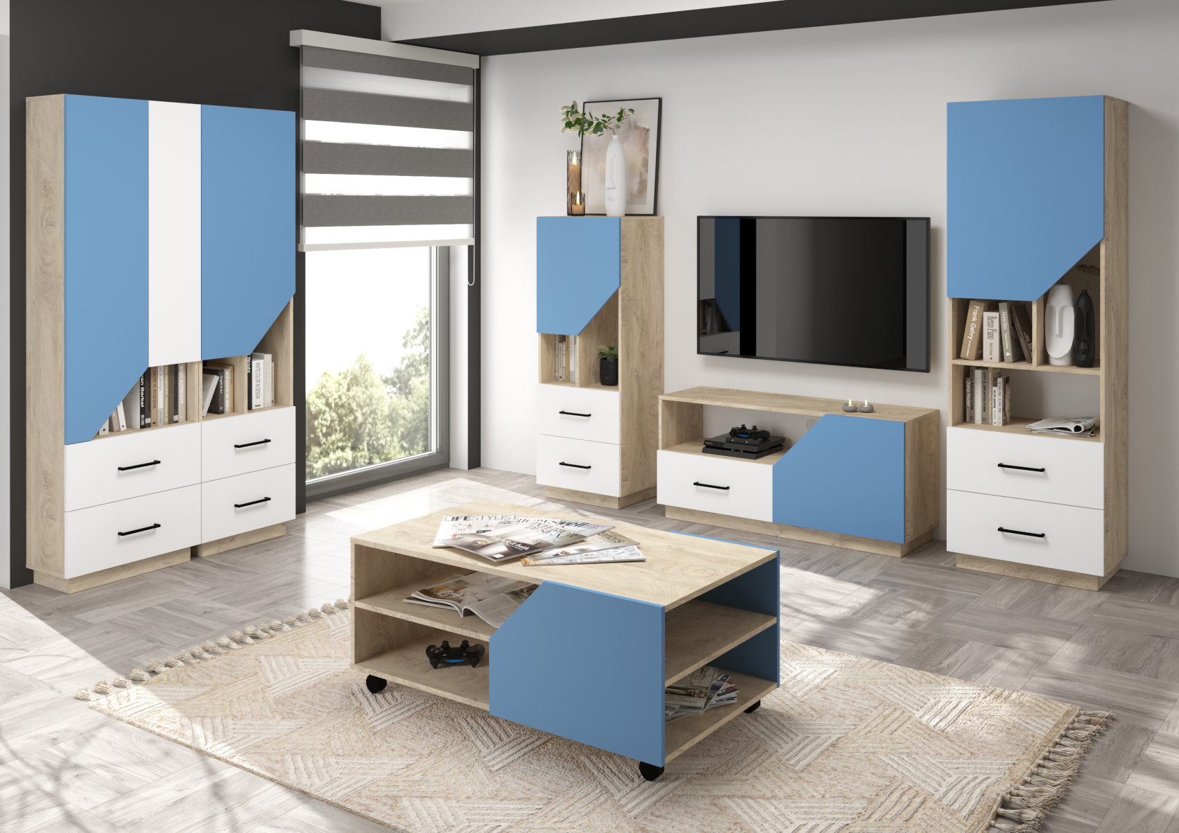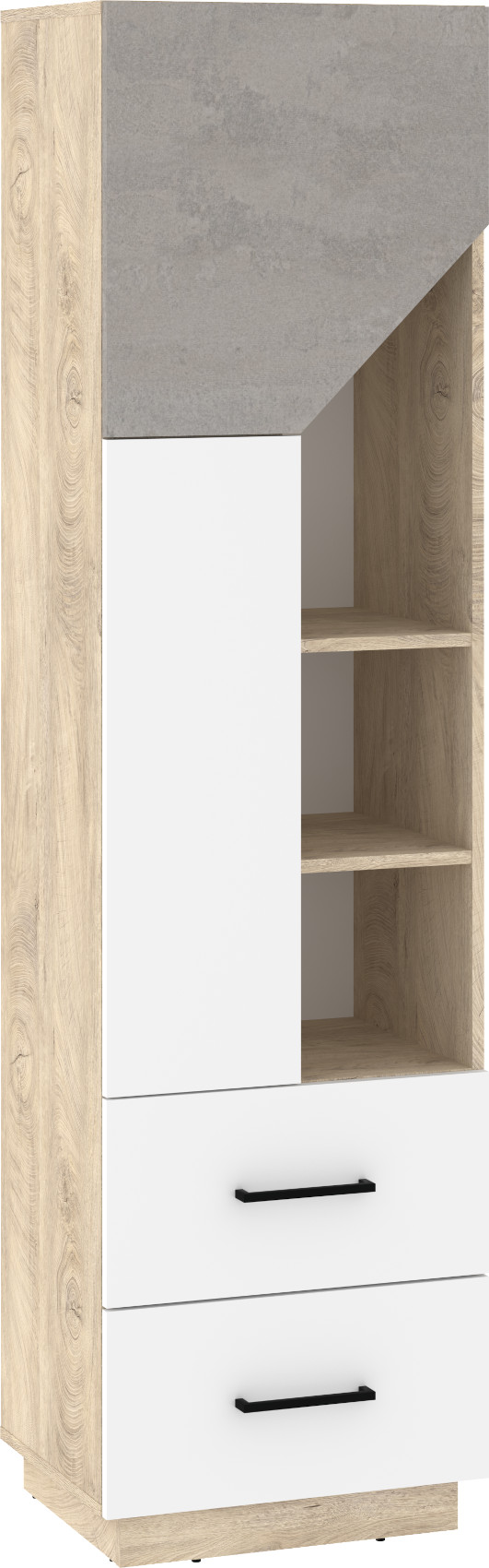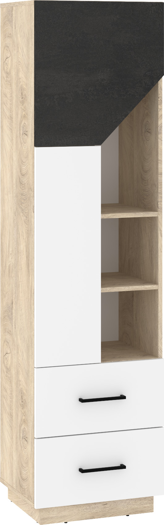 Regál má 2 dvířka a 2 zásuvky na kovových pojezdech, kam schováte všechny věci, co potřebujete mít po ruce. Nad zásuvkami jsou 3 otevřené niky k vystavení vašich oblíbených knih či dekorací.