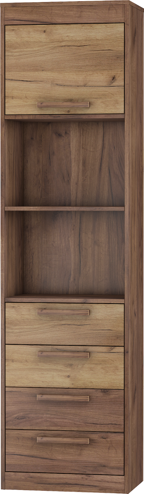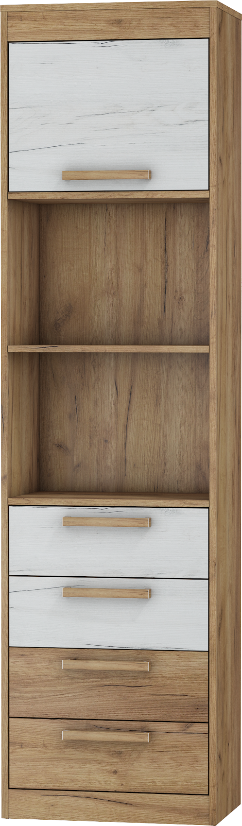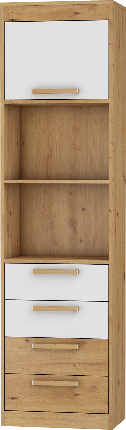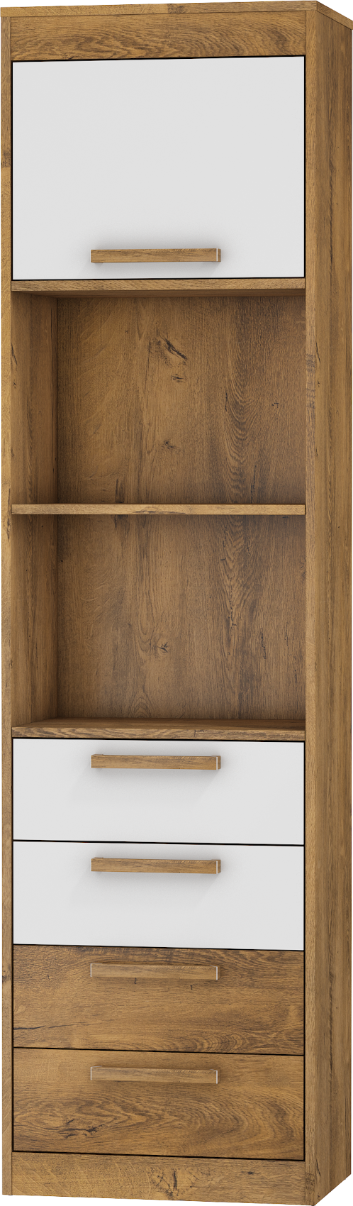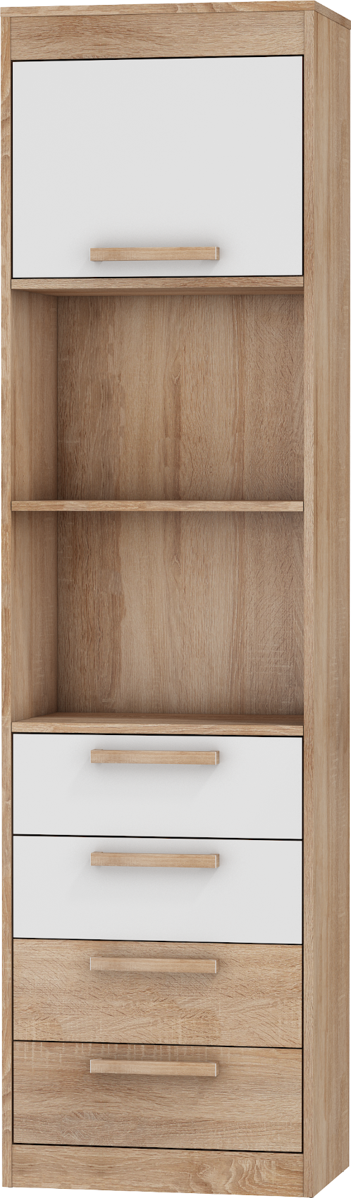 Součástí regálu jsou 4 zásuvky na kovových pojezdech, 1 skříňka s plnými dvířky a 2 otevřené niky k vystavení vašich oblíbených knih, dekorací či rámečků s fotografiemi.