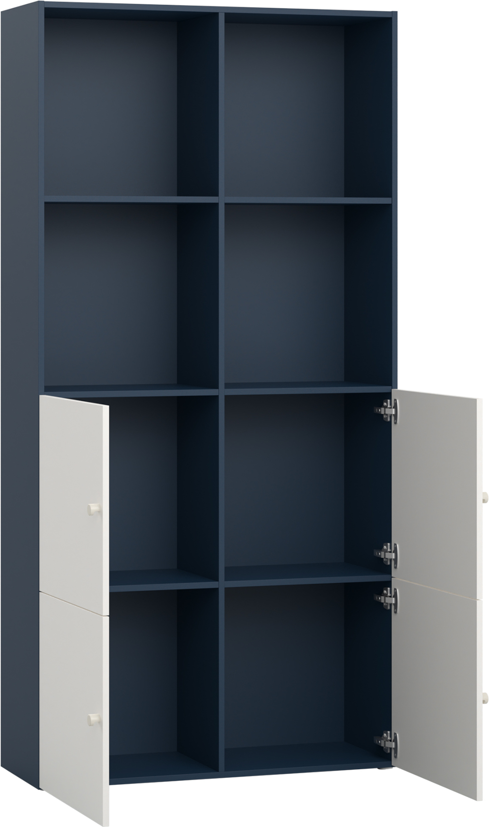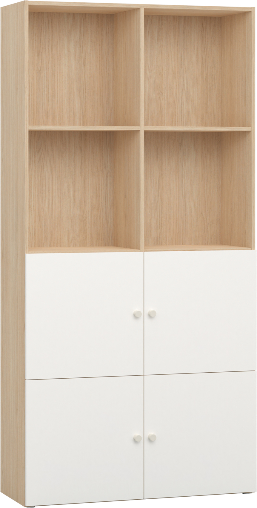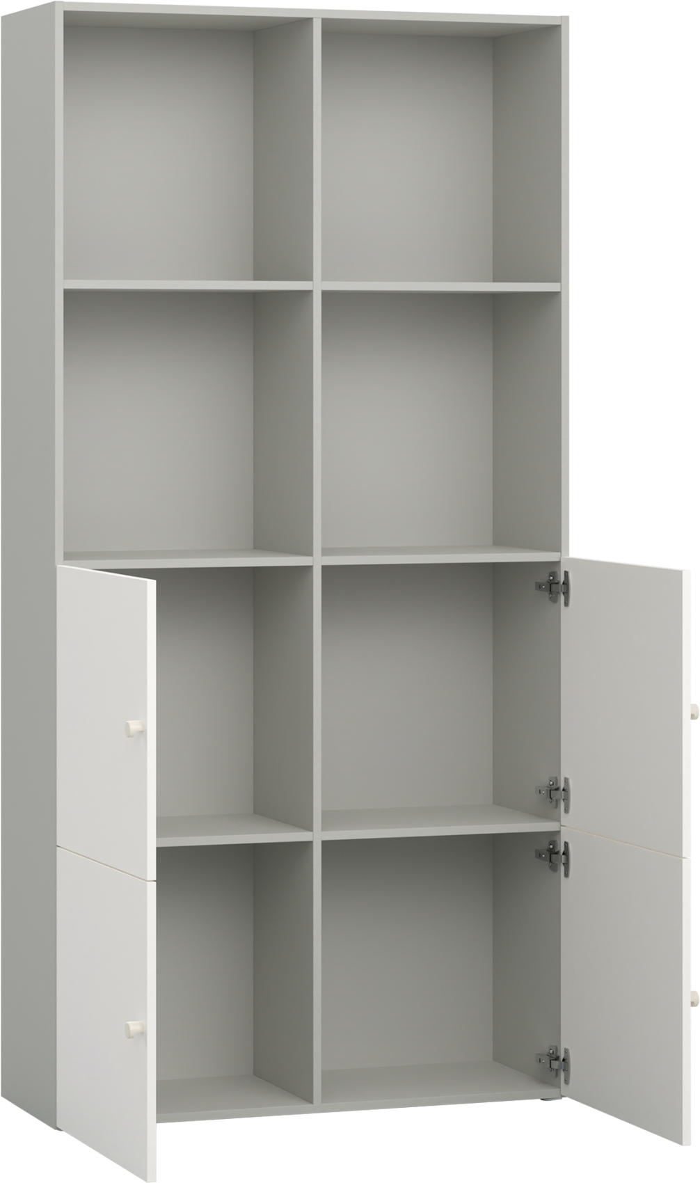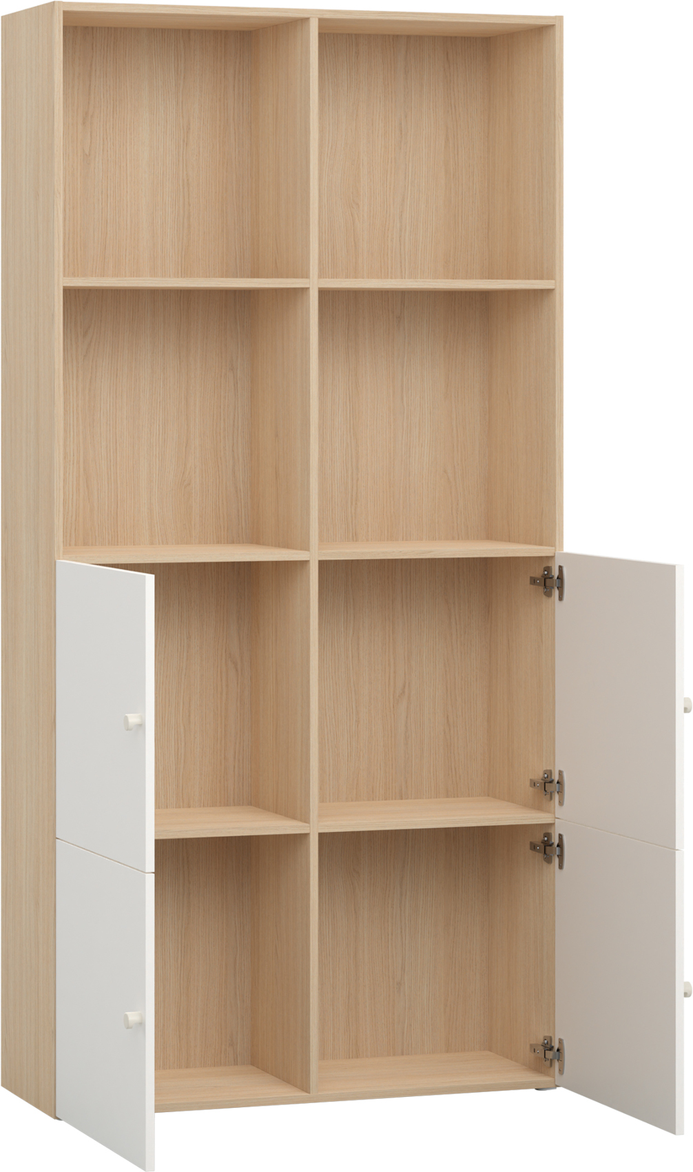 Součástí regálu jsou 4 spodní dvířka, za kterými jsou vloženy 2 police. V horní části jsou 4 otevřené niky. V nich si můžete vystavit své oblíbené knihy, dekorace či doplňkové police Reli a výplň Reli.