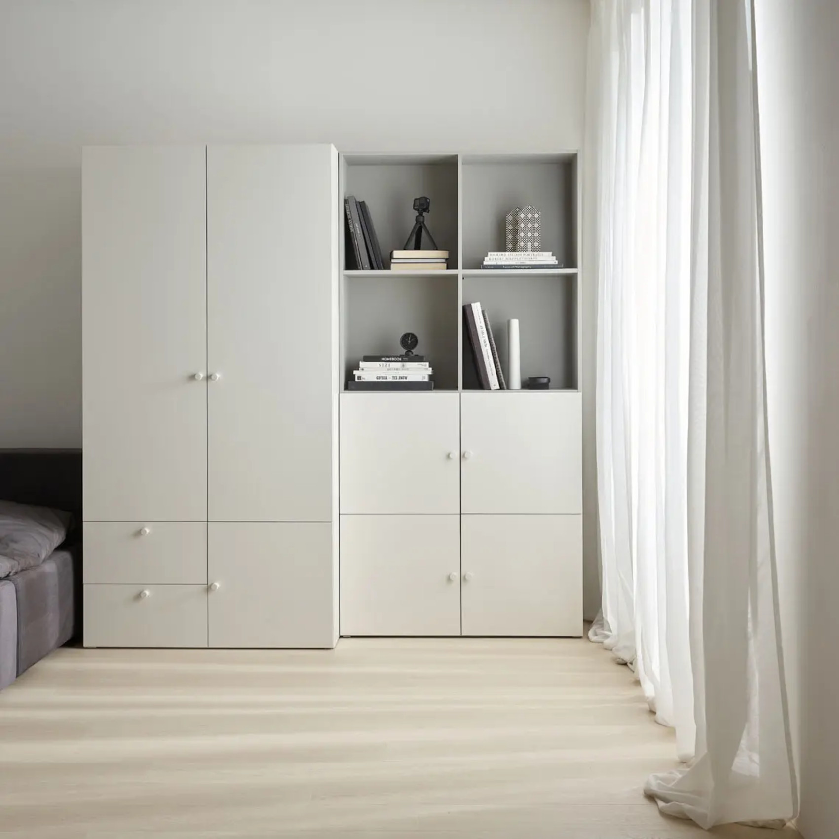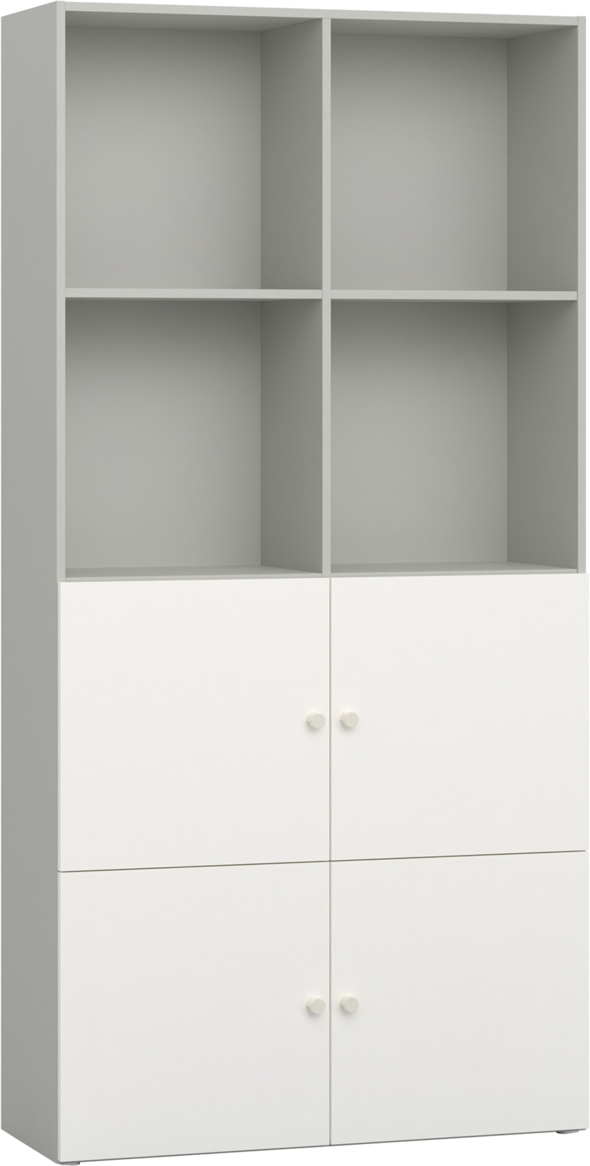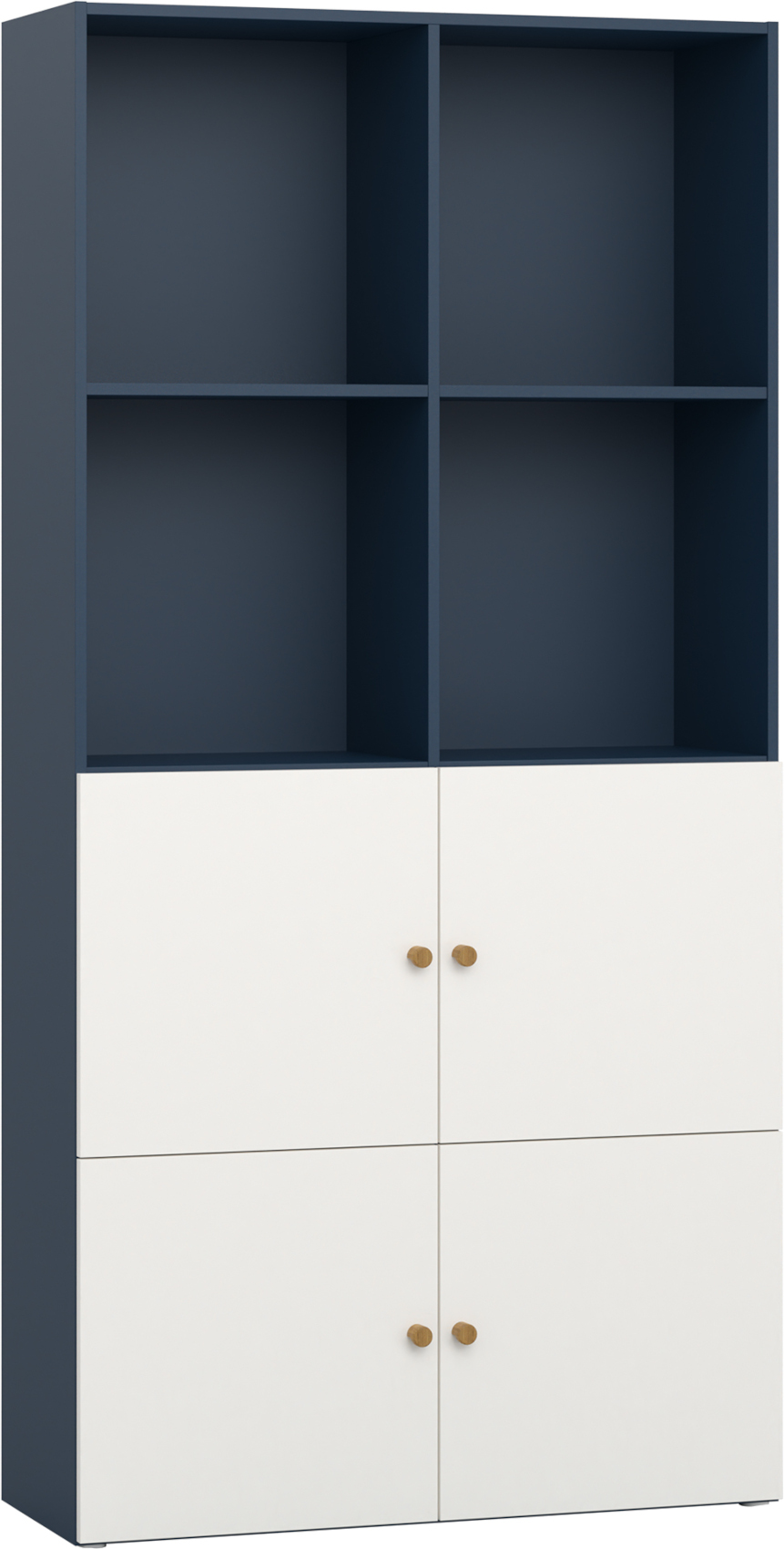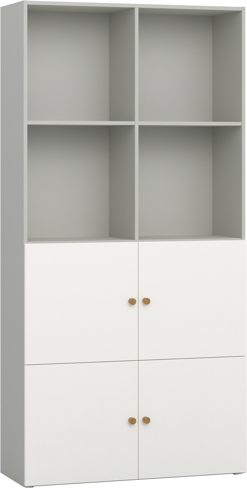 Součástí regálu jsou 4 spodní dvířka, za kterými jsou vloženy 2 police. V horní části jsou 4 otevřené niky. V nich si můžete vystavit své oblíbené knihy, dekorace či doplňkové police Reli a výplň Reli.