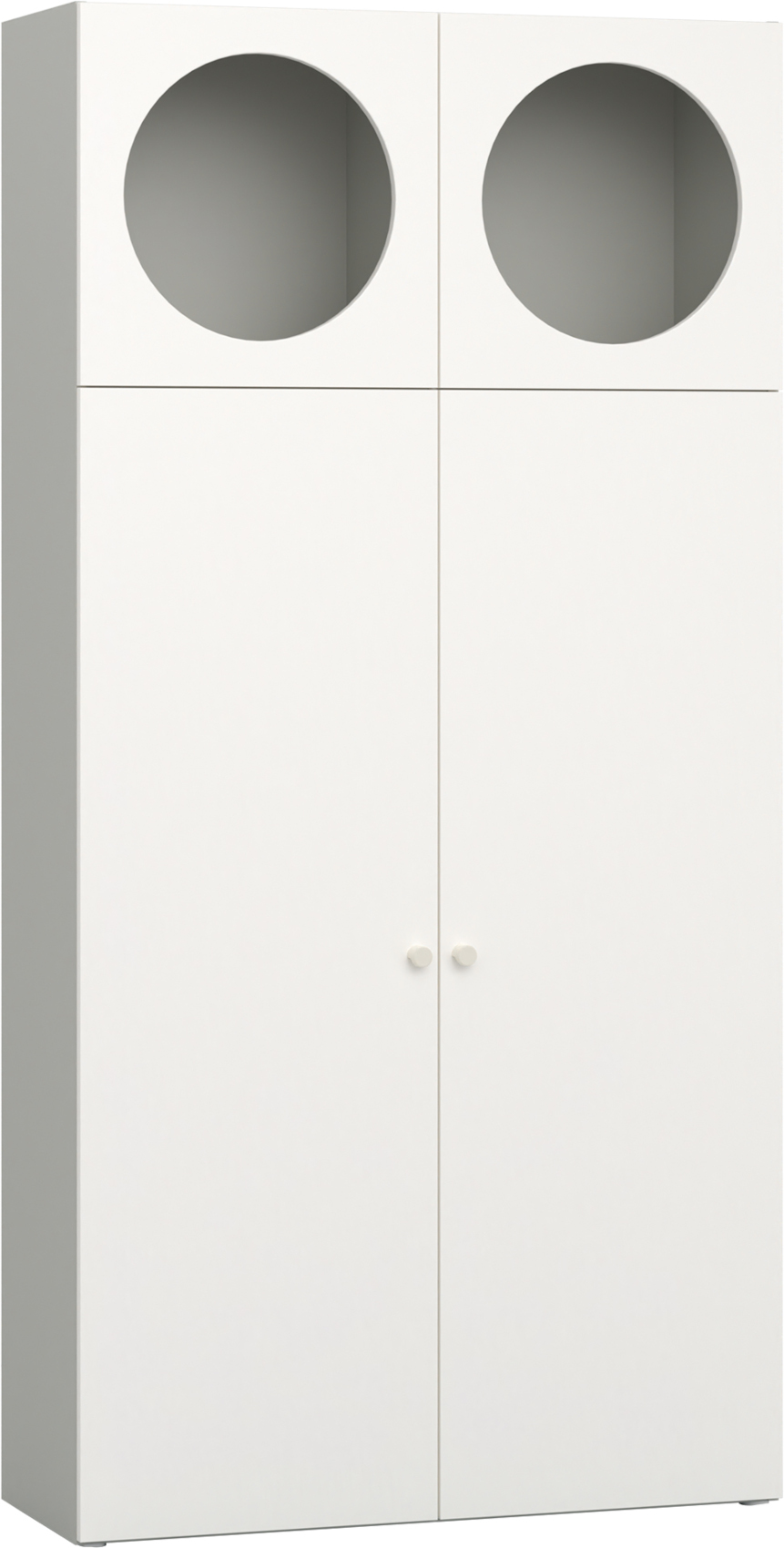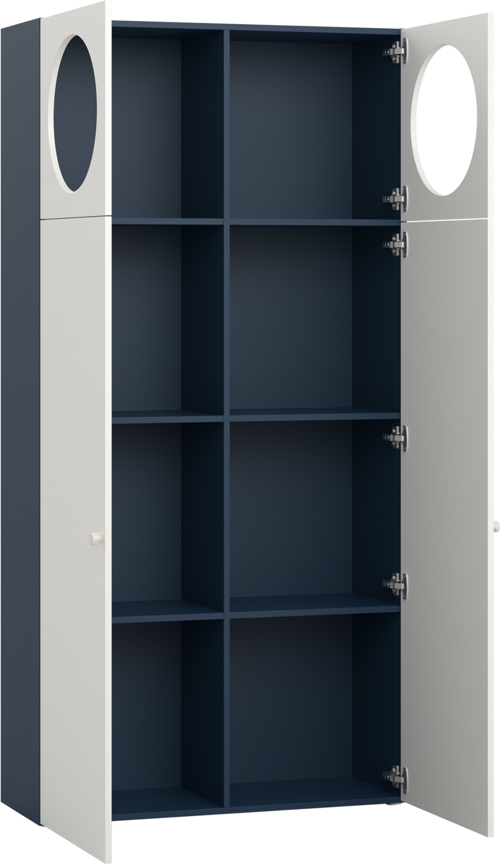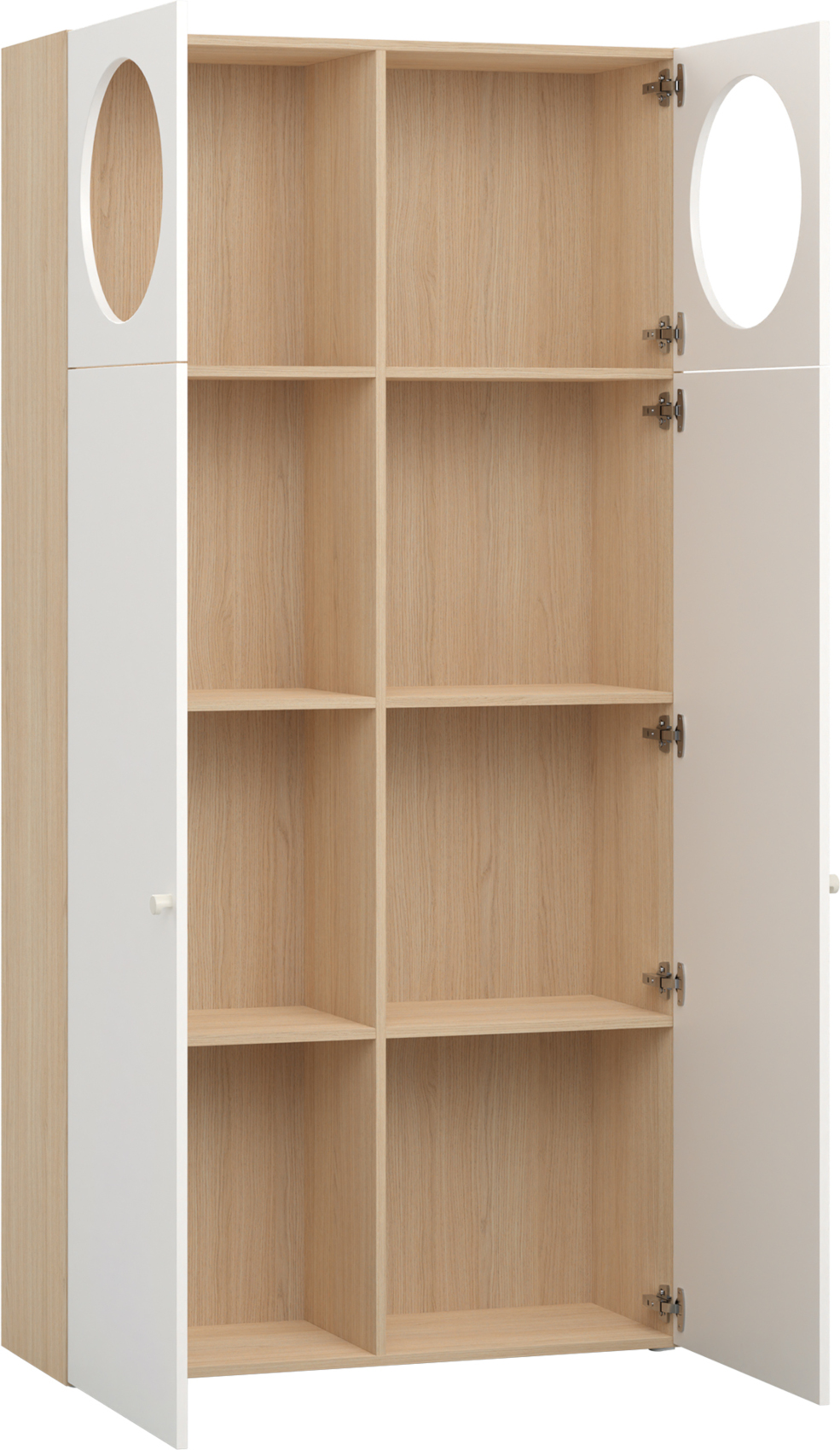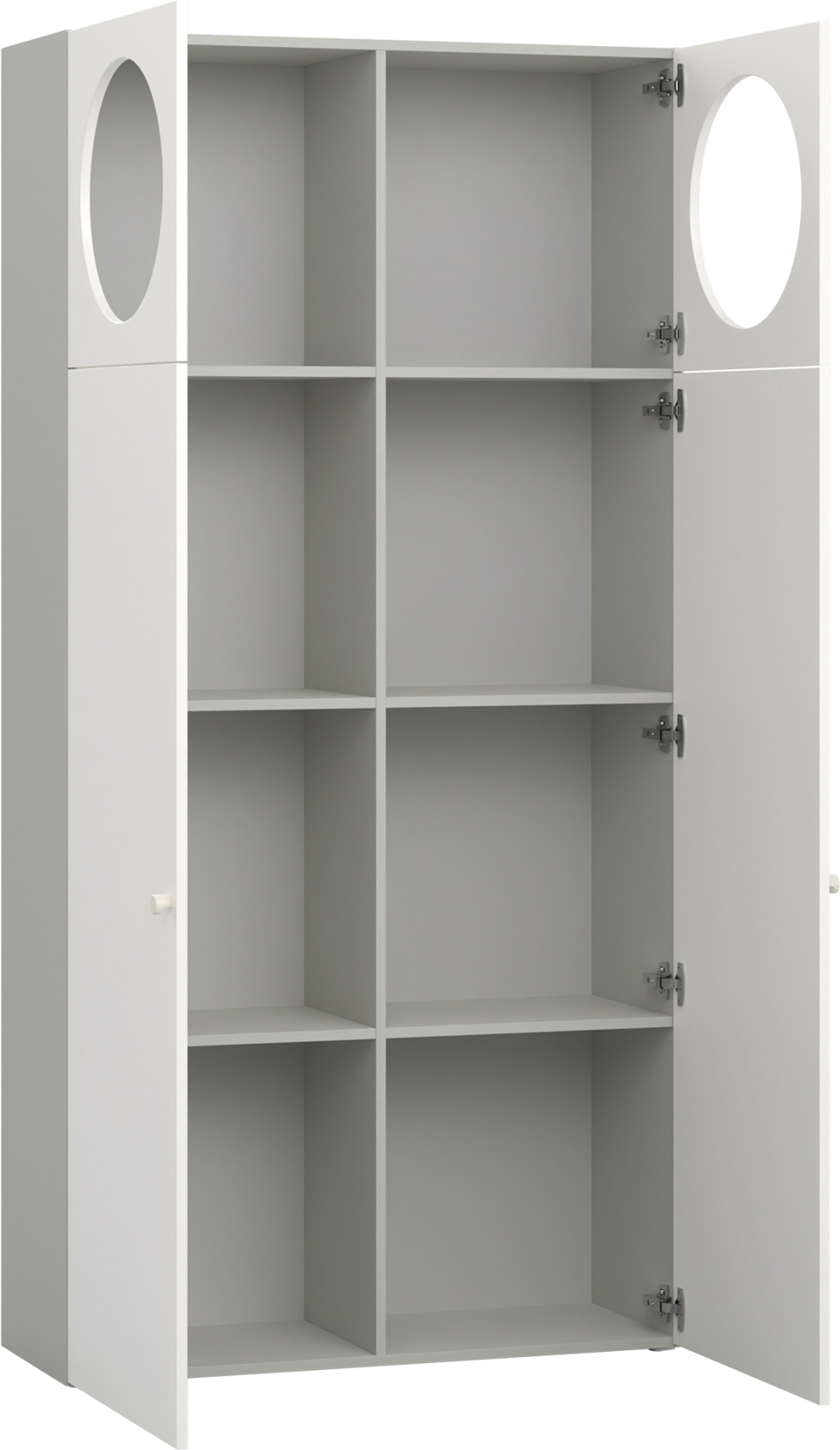 Součástí regálu jsou 2 dvířka s horními otvory. Za dvířky je vloženo 6 polic, které tak vytváří 8 otevřených nik. Ty můžete doplnit doplňkovými policemi Relivýplní Reli, díky kterým udržíte v regálu pořádek.