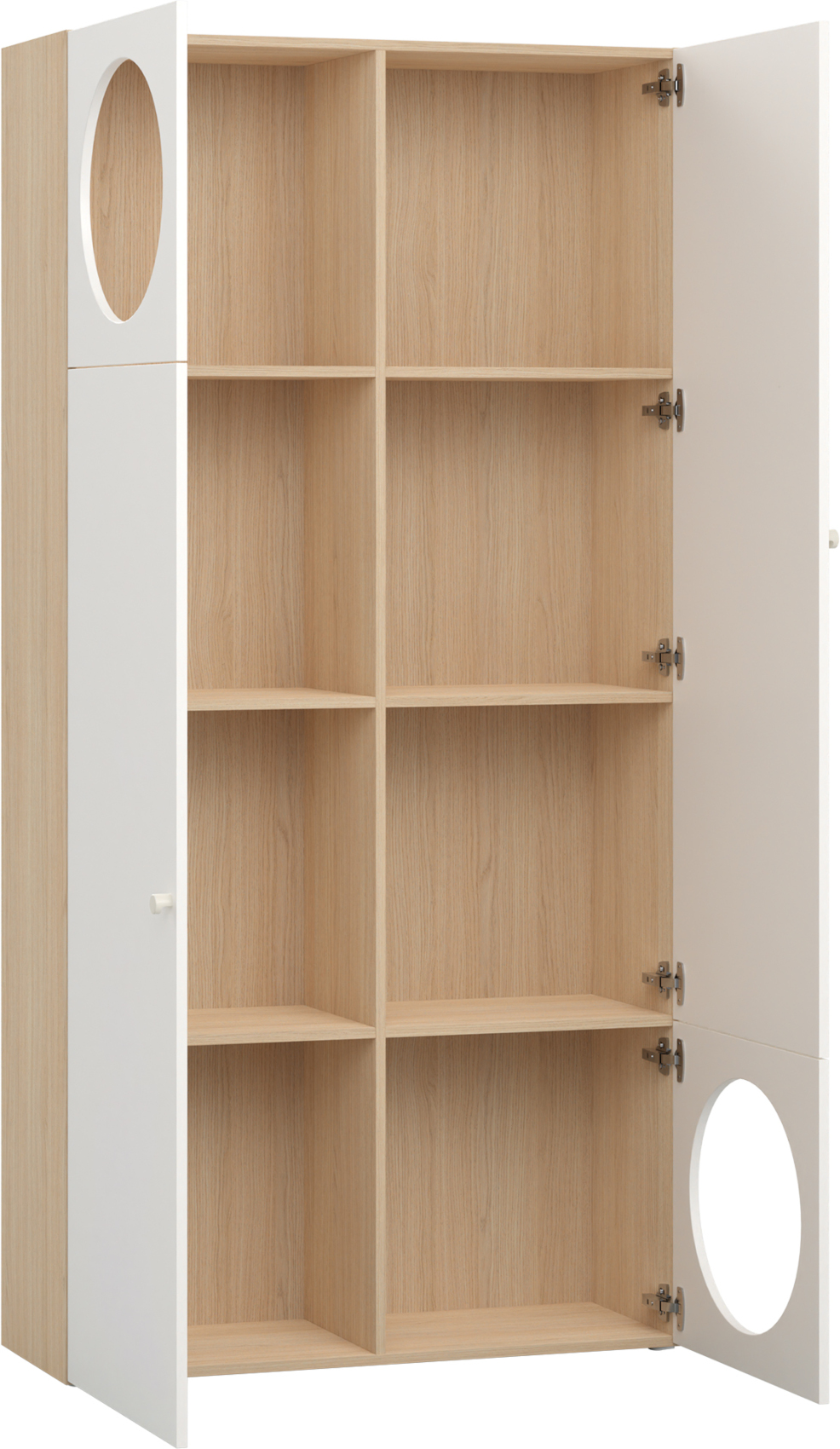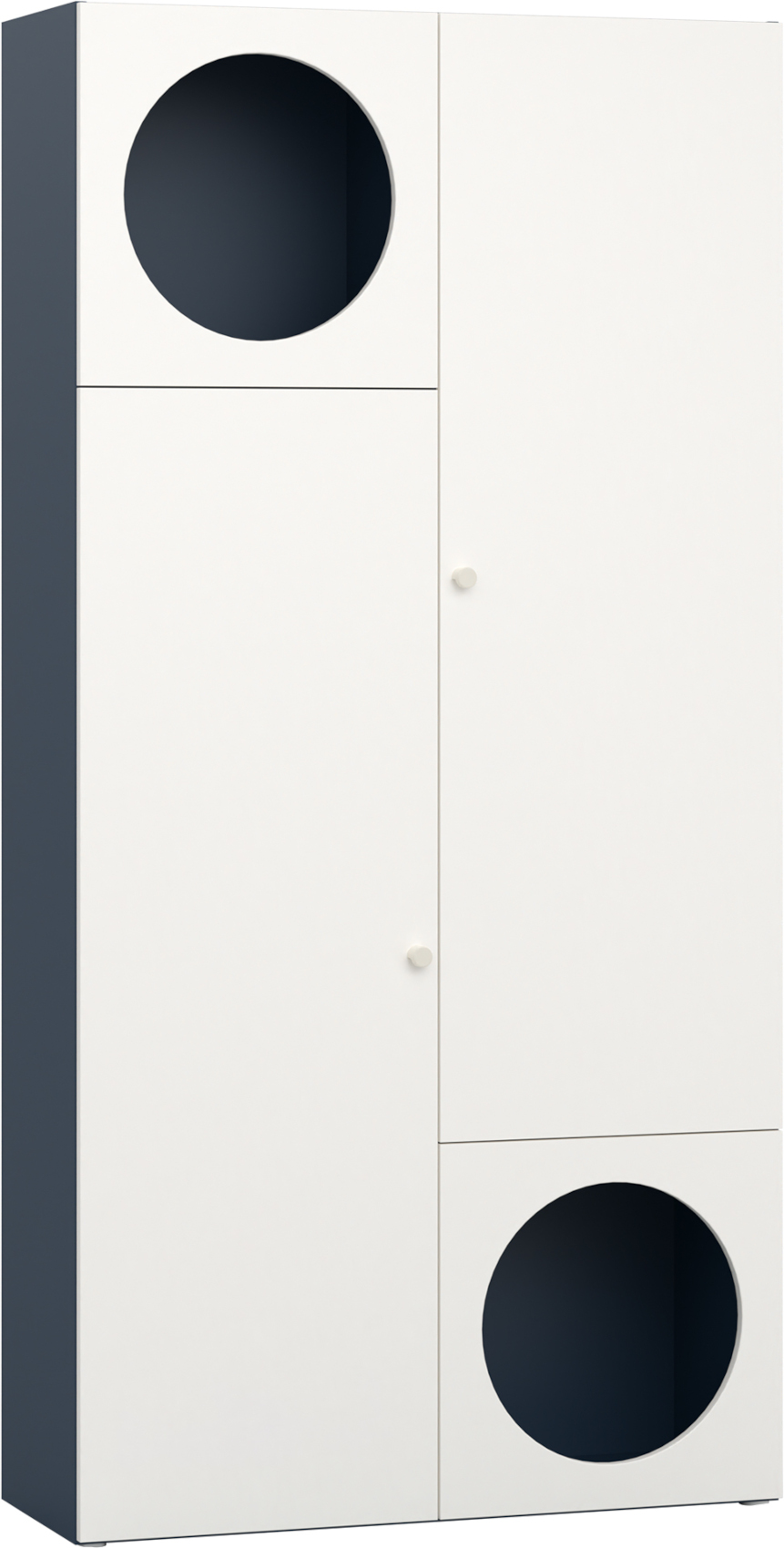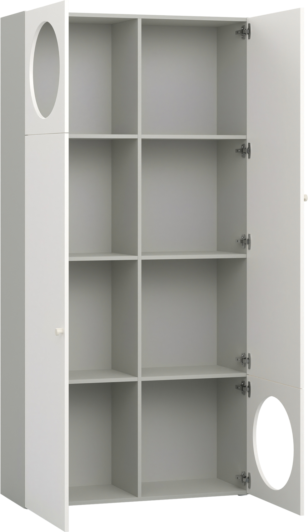 Součástí regálu jsou 2 dvířka s horním a spodním otvorem. Za dvířky je vloženo 6 polic, které tak vytváří 8 otevřených nik. Ty můžete doplnit doplňkovými policemi Reli a výplní Reli, díky kterým udržíte v regálu pořádek.