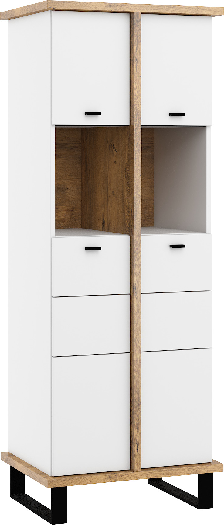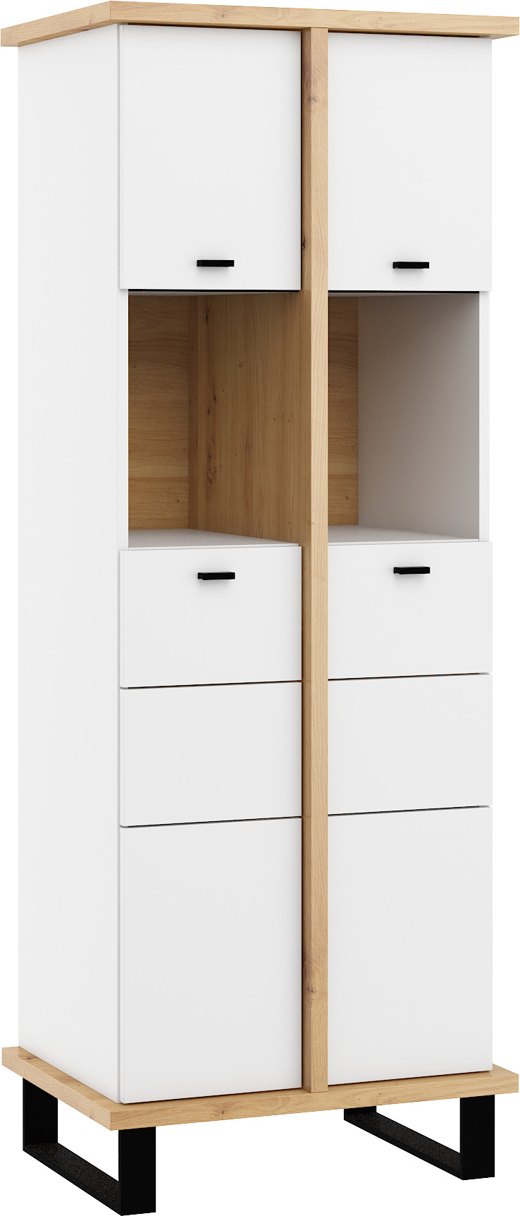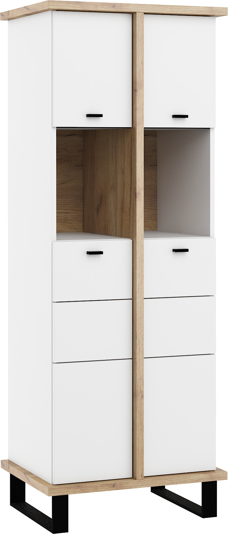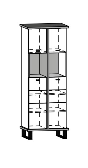 Úzký regál Cross 17 disponuje 4 skříňkami s plnými dvířky. Uvnitř skříněk je polička. V horní části má 2 otevřené police, které můžete využít např. jako knihovničku. Nožky jsou vysoké 12 cm.