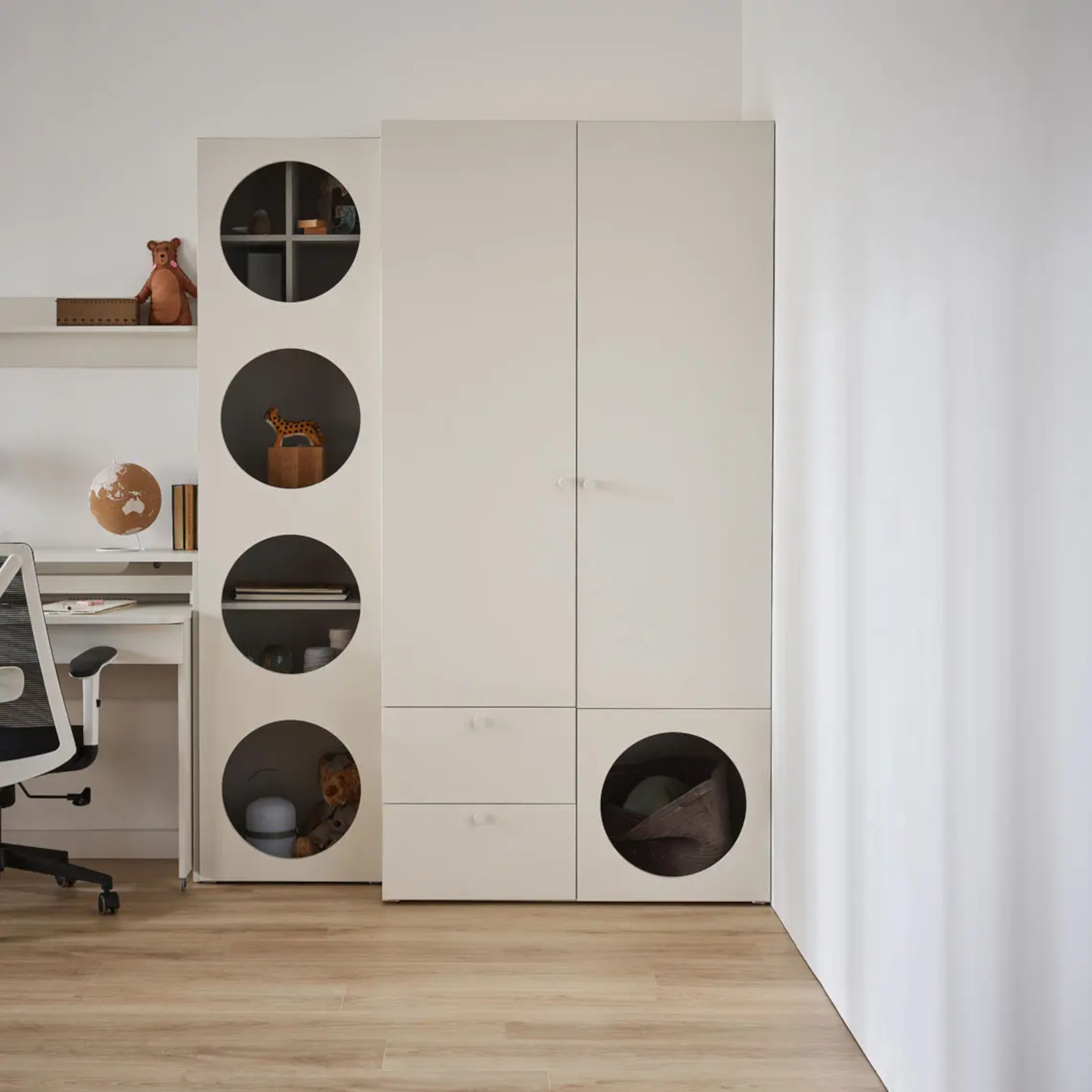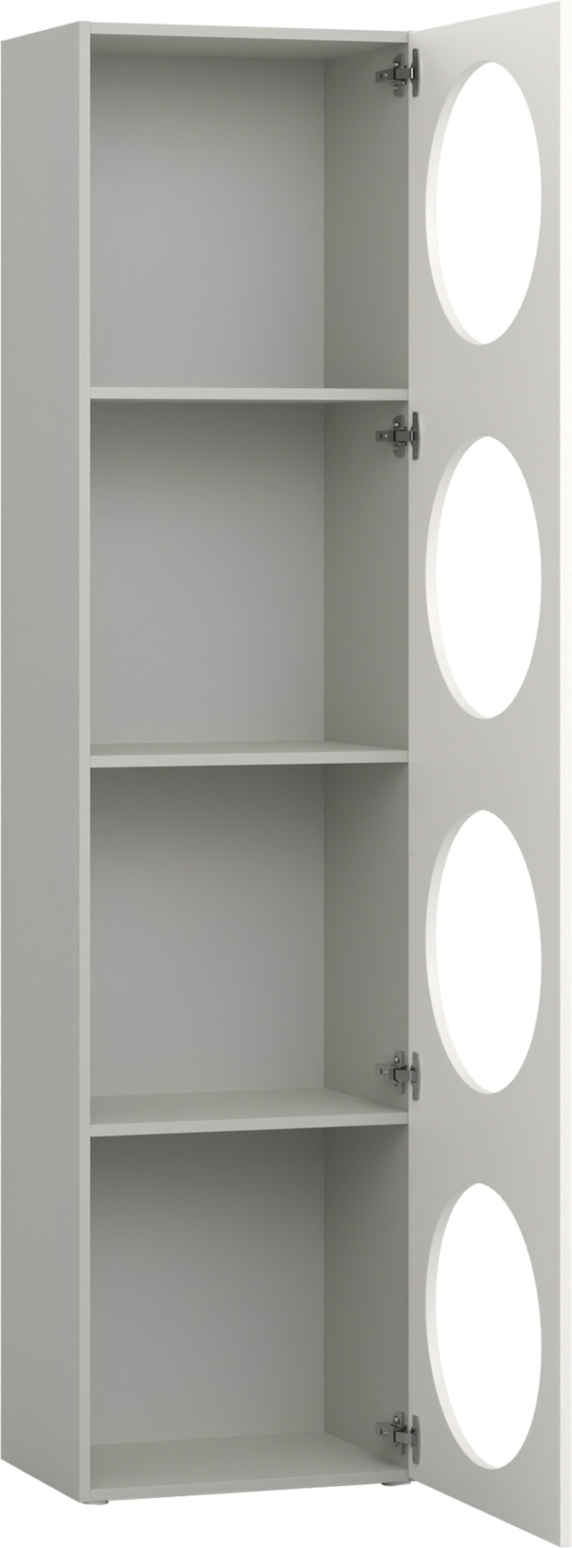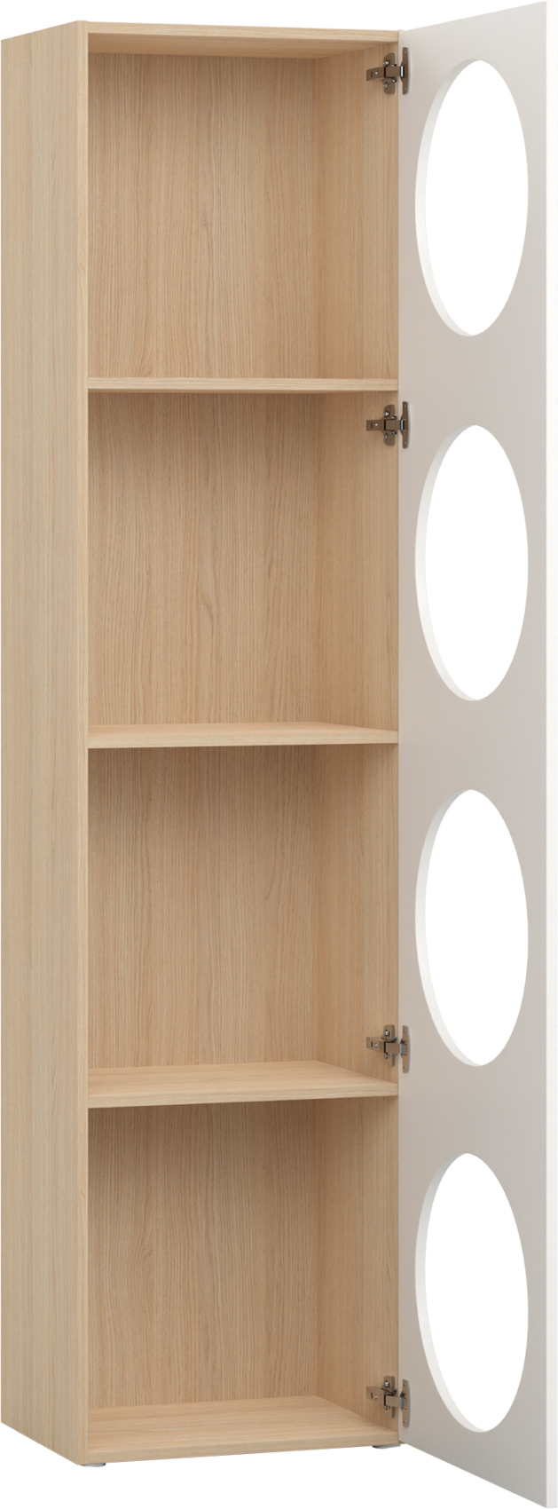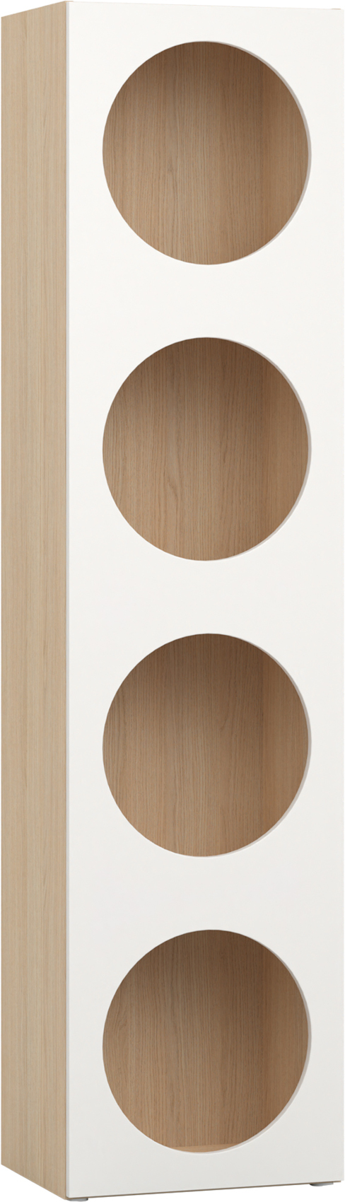 Součástí regálu jsou 1 dvířka se 4 otvory, za kterými jsou vloženy 3 police. Ty můžete využít k vystavení vašich oblíbených knih či dekorací nebo doplnit doplňkovými policemi Reli a výplní Reli, díky kterým udržíte v regálu pořádek.