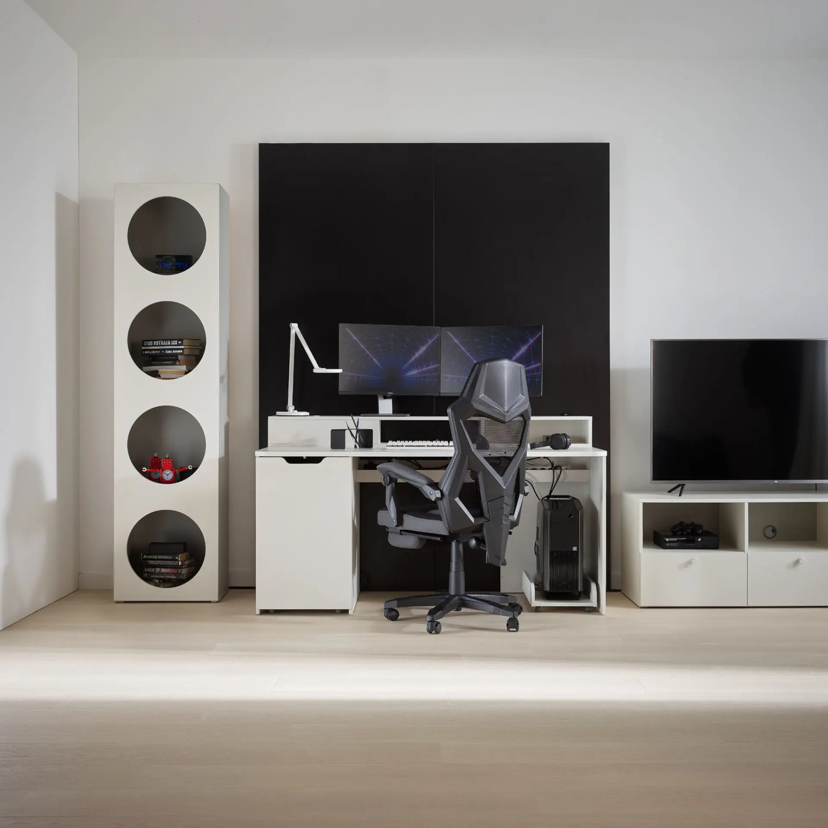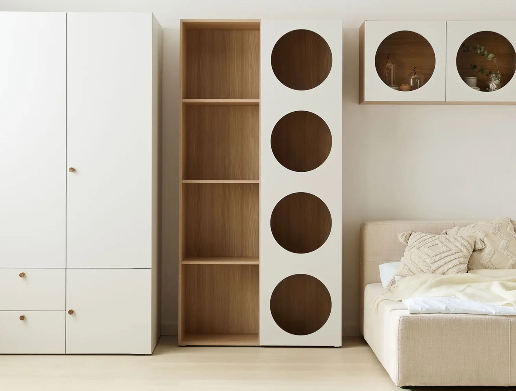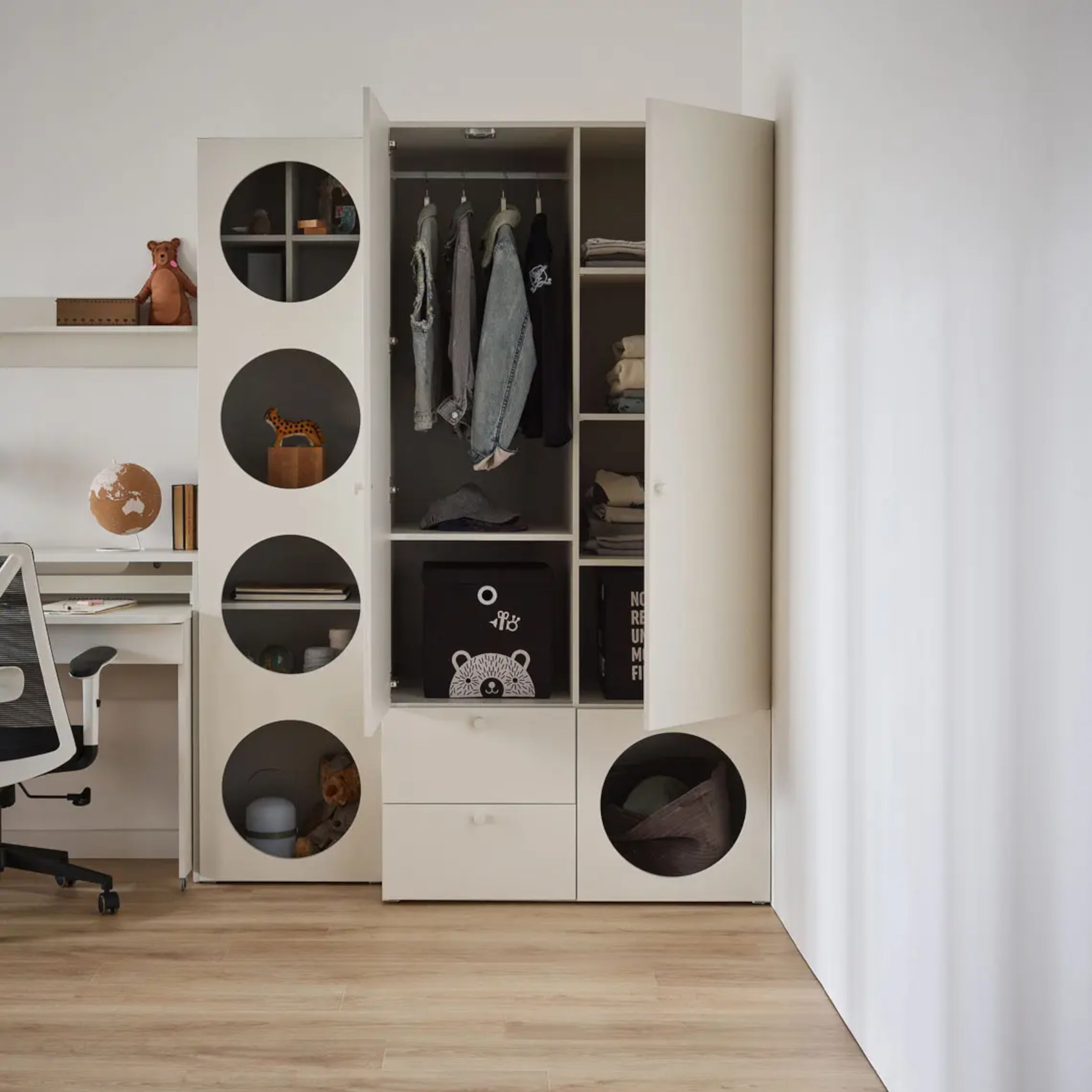 Součástí regálu jsou 1 dvířka se 4 otvory, za kterými jsou vloženy 3 police. Ty můžete využít k vystavení vašich oblíbených knih či dekorací nebo doplnit doplňkovými policemi Reli a výplní Reli, díky kterým udržíte v regálu pořádek.
