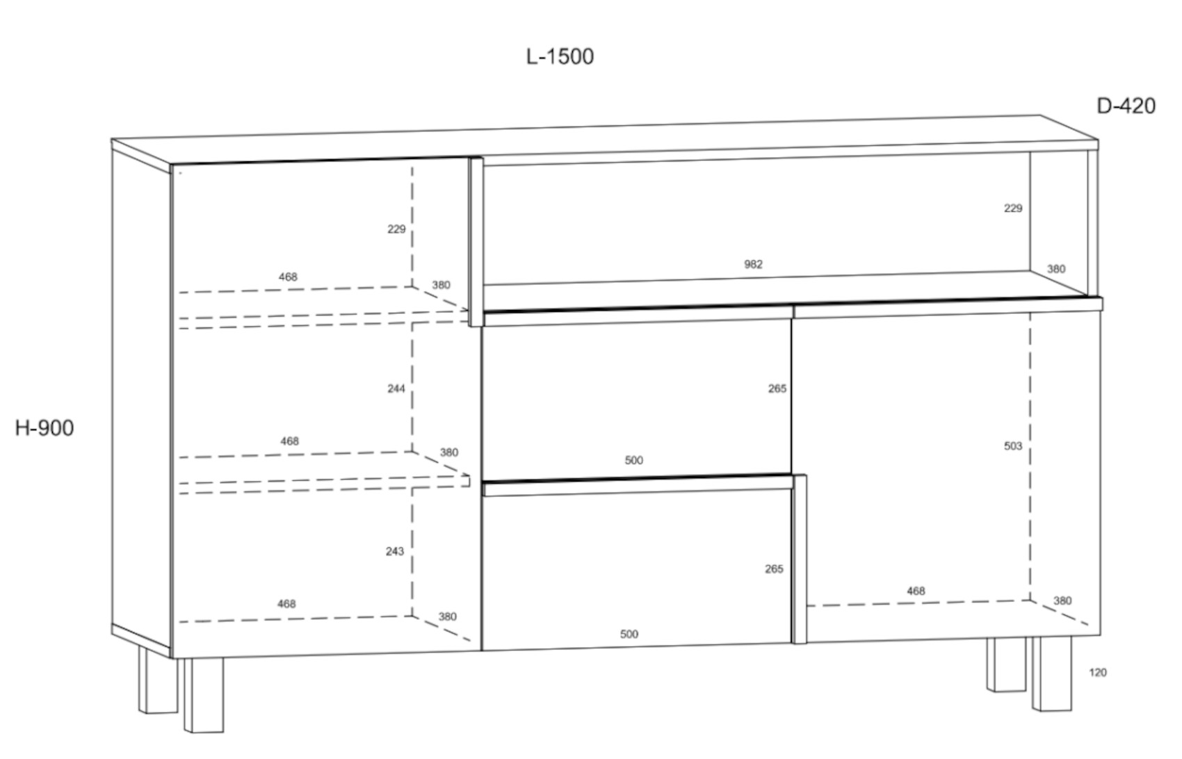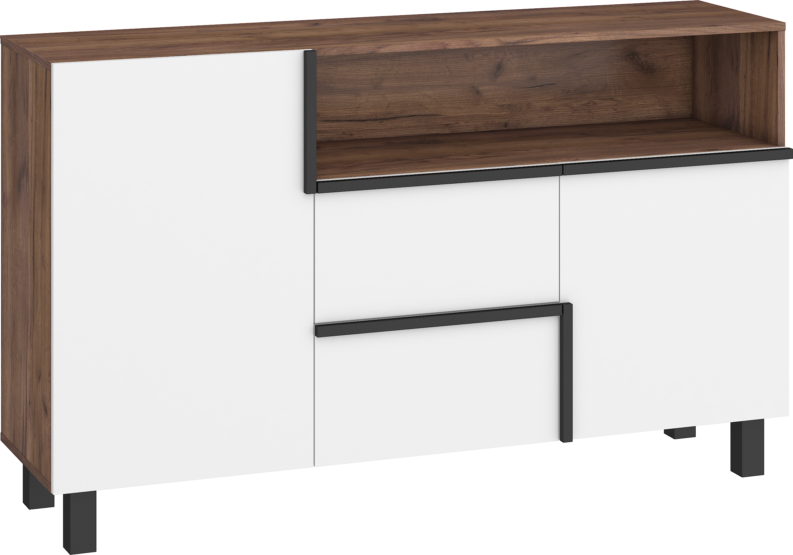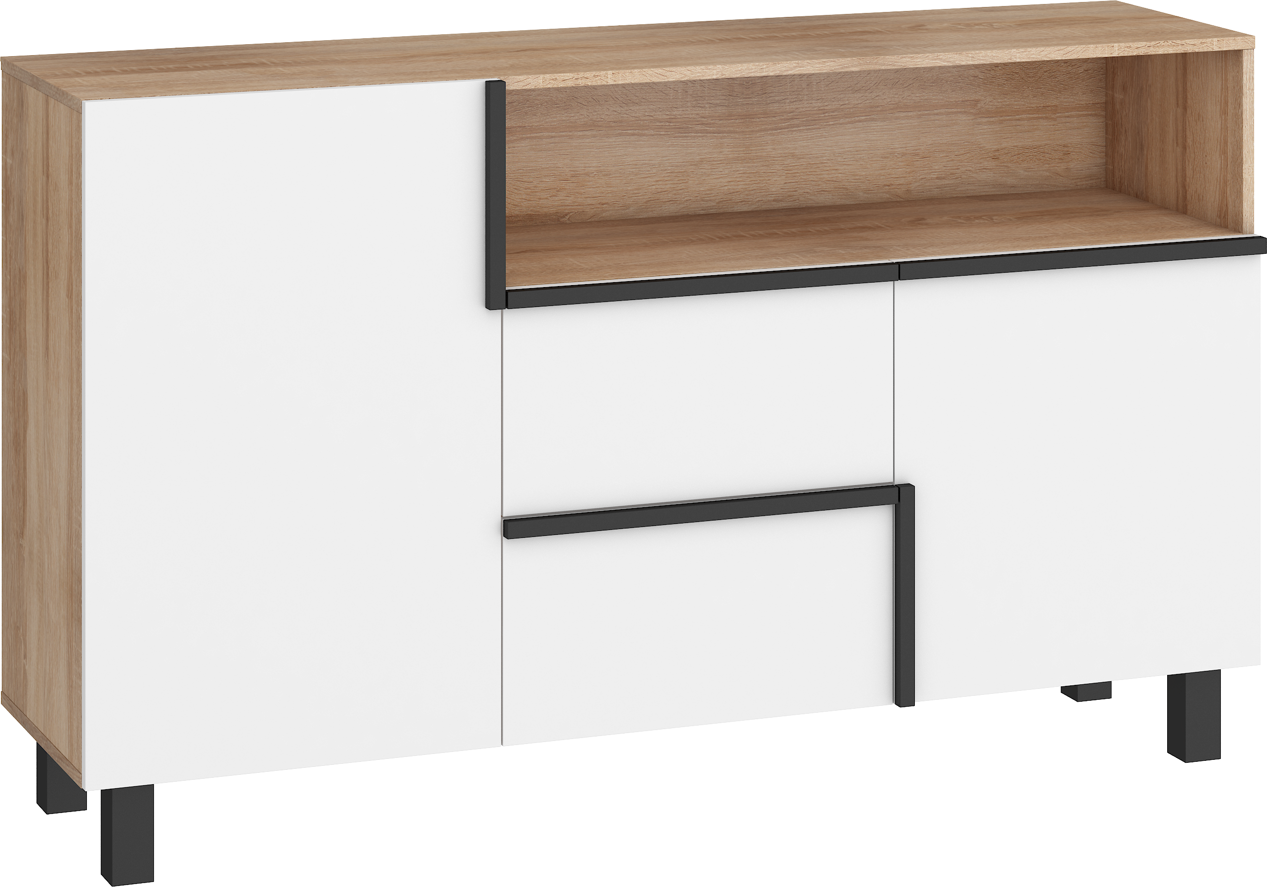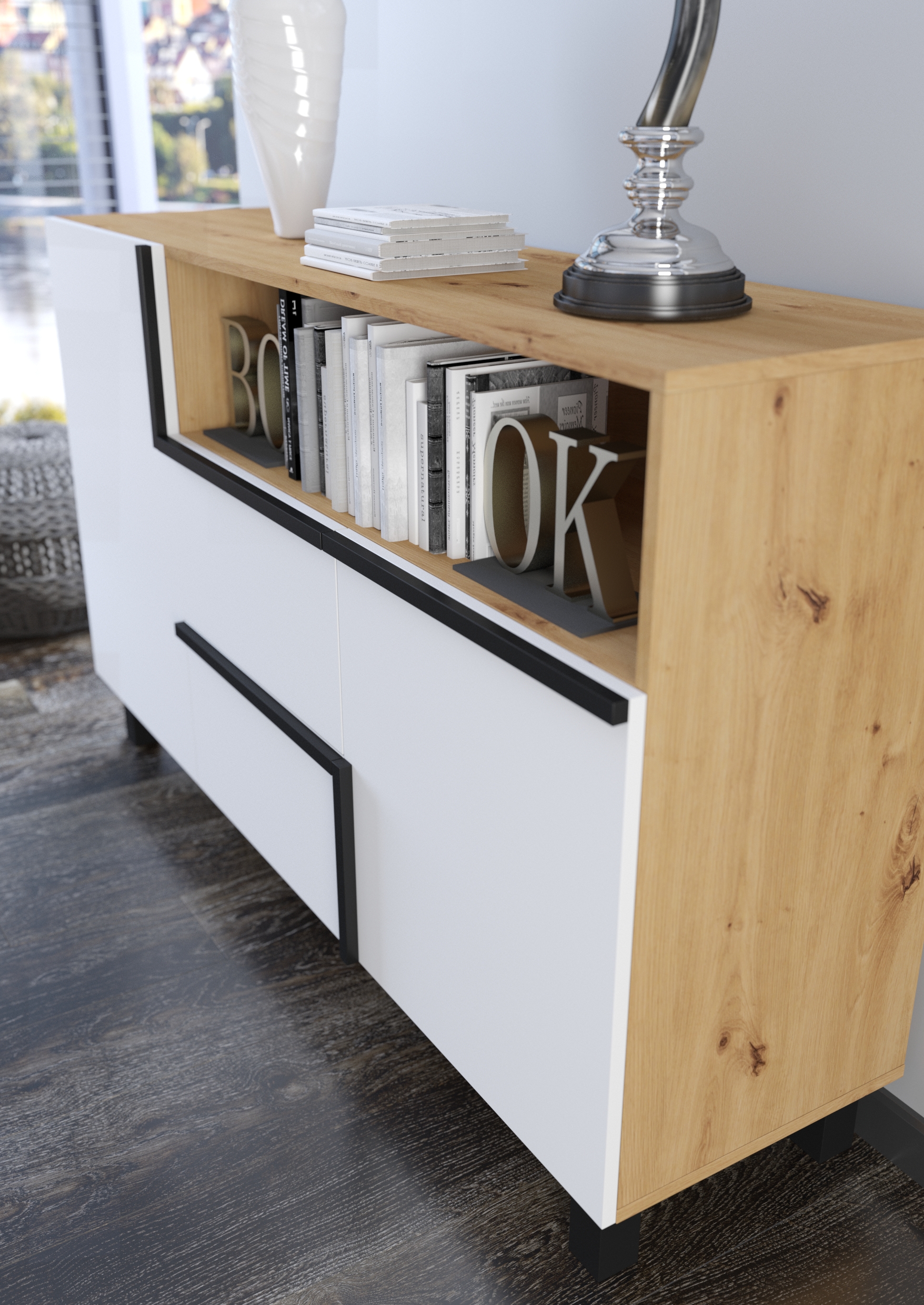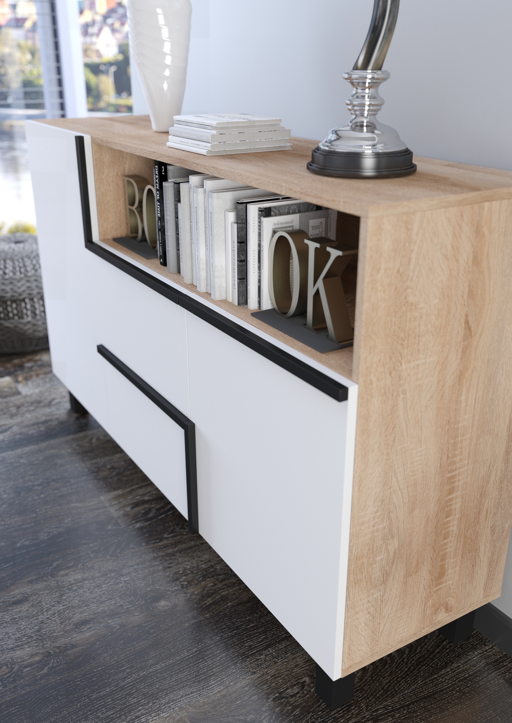 Součástí komody jsou 2 plná dvířka, za kterými jsou vloženy 2 lakované police. Uprostřed se nachází 2 zásuvky na kovových pojezdech a 1 otevřená nika k vystavení vašich oblíbených knih, dekorací či rámečků s fotografiemi.
