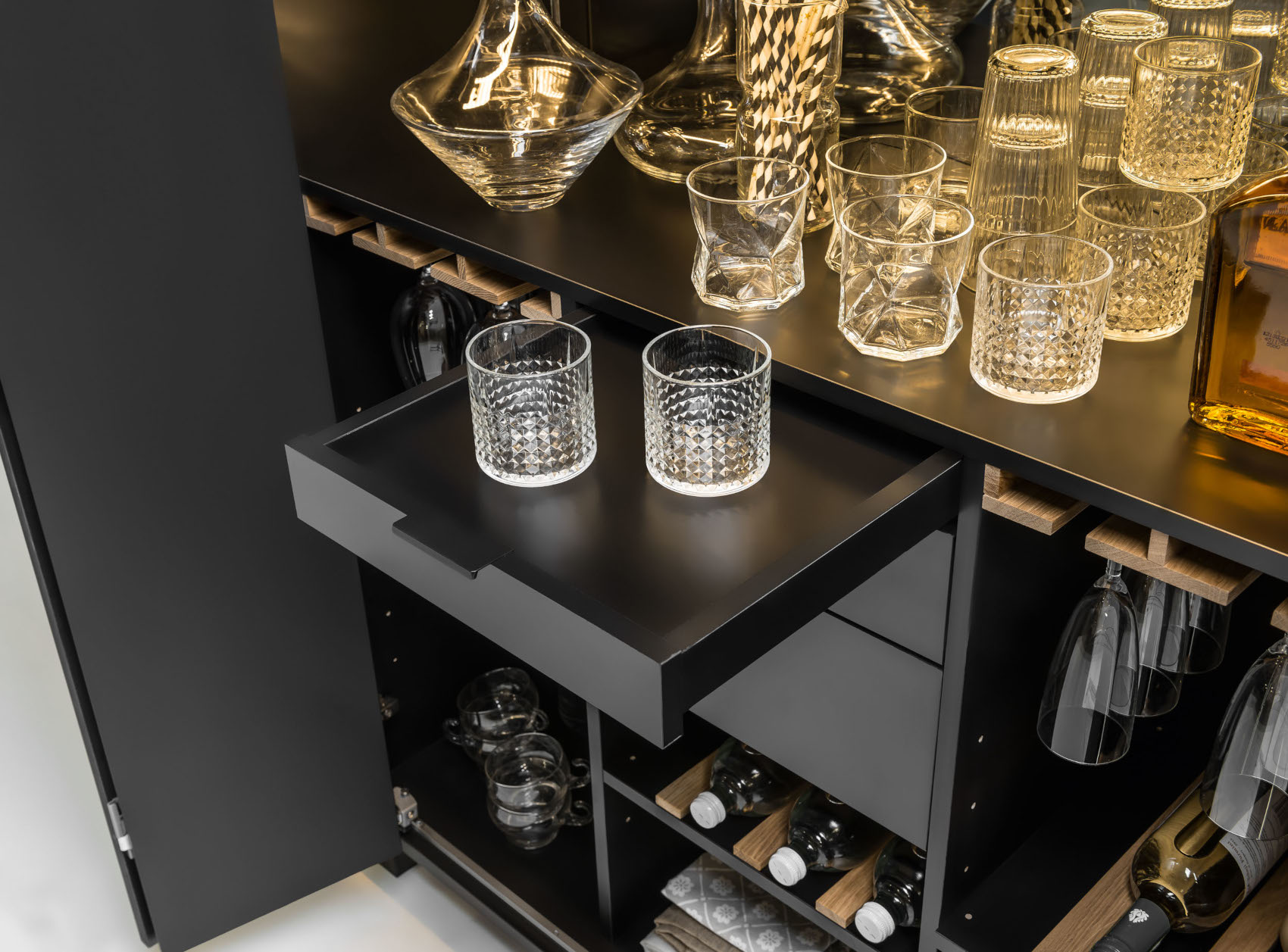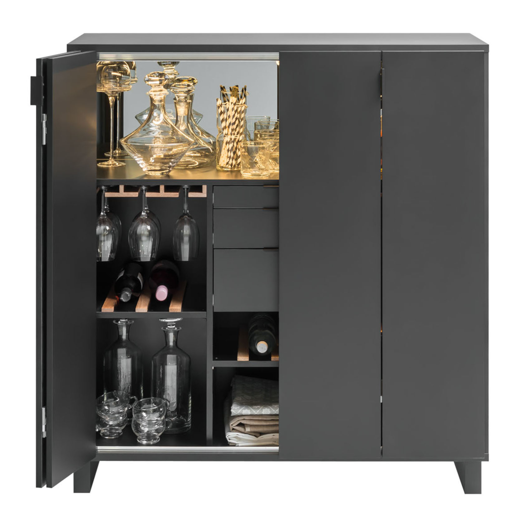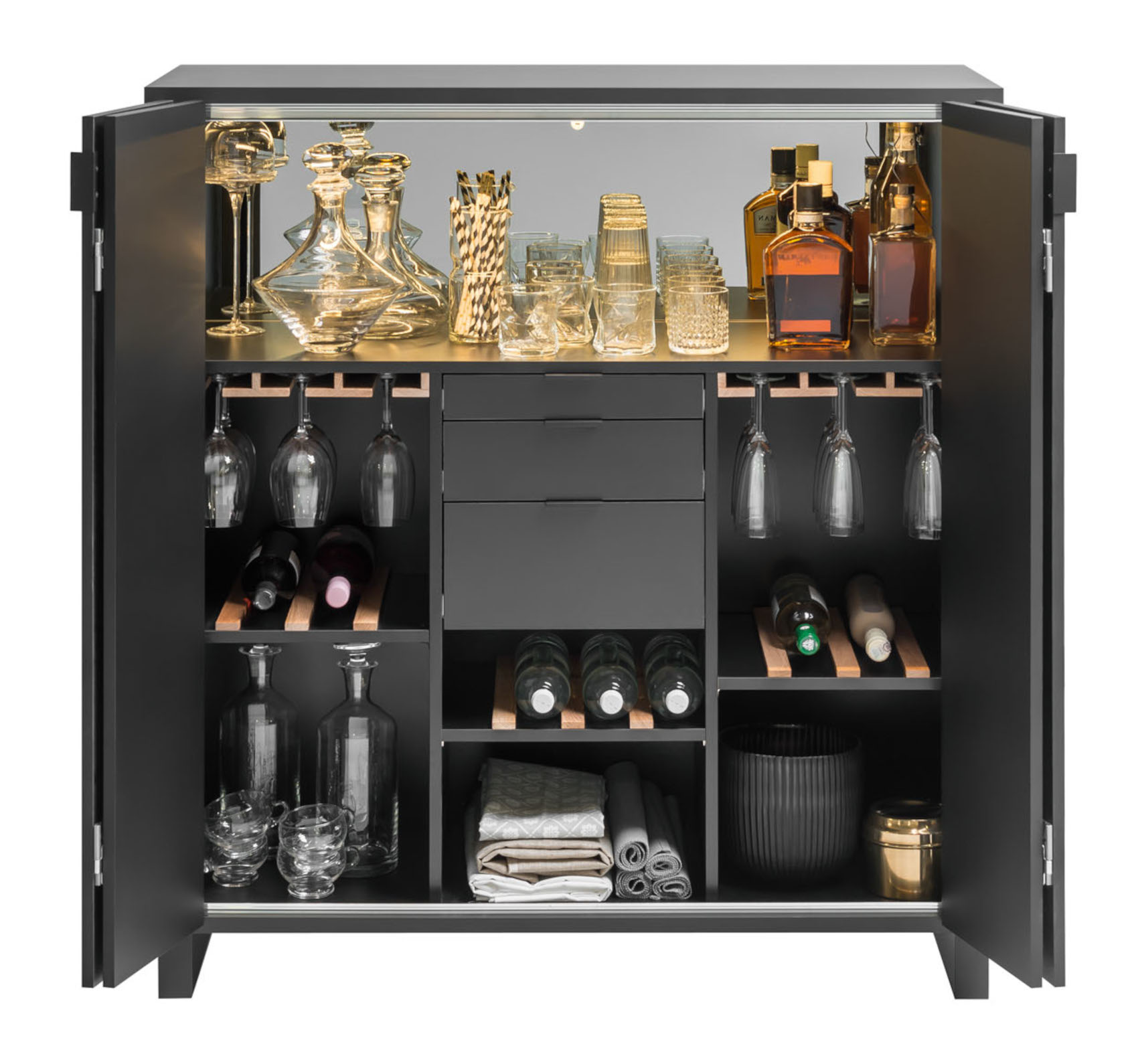 Ve vnitřním prostoru jsou vloženy 3 police s libovolně nastavitelnou výškou, jedna široká police s vývodem pro kabeláž a 3 zásuvky na kovových pojezdech. K polici jsou připevněny závěsy na sklenice a držáky na vinné lahve. Součástí komody je LED osvětlení s pohybovým senzorem, které se rozsvítí při otevření dvířek.