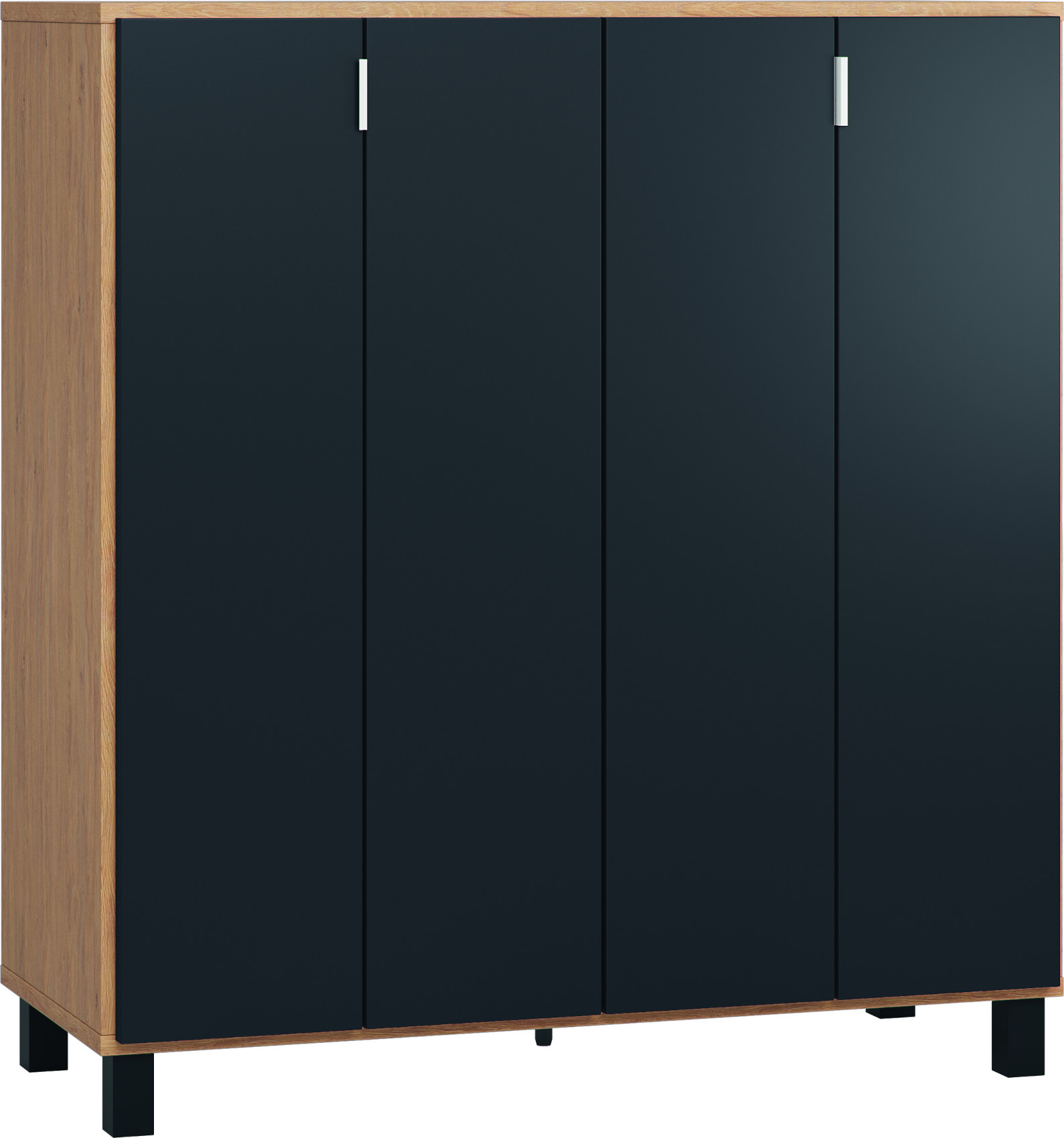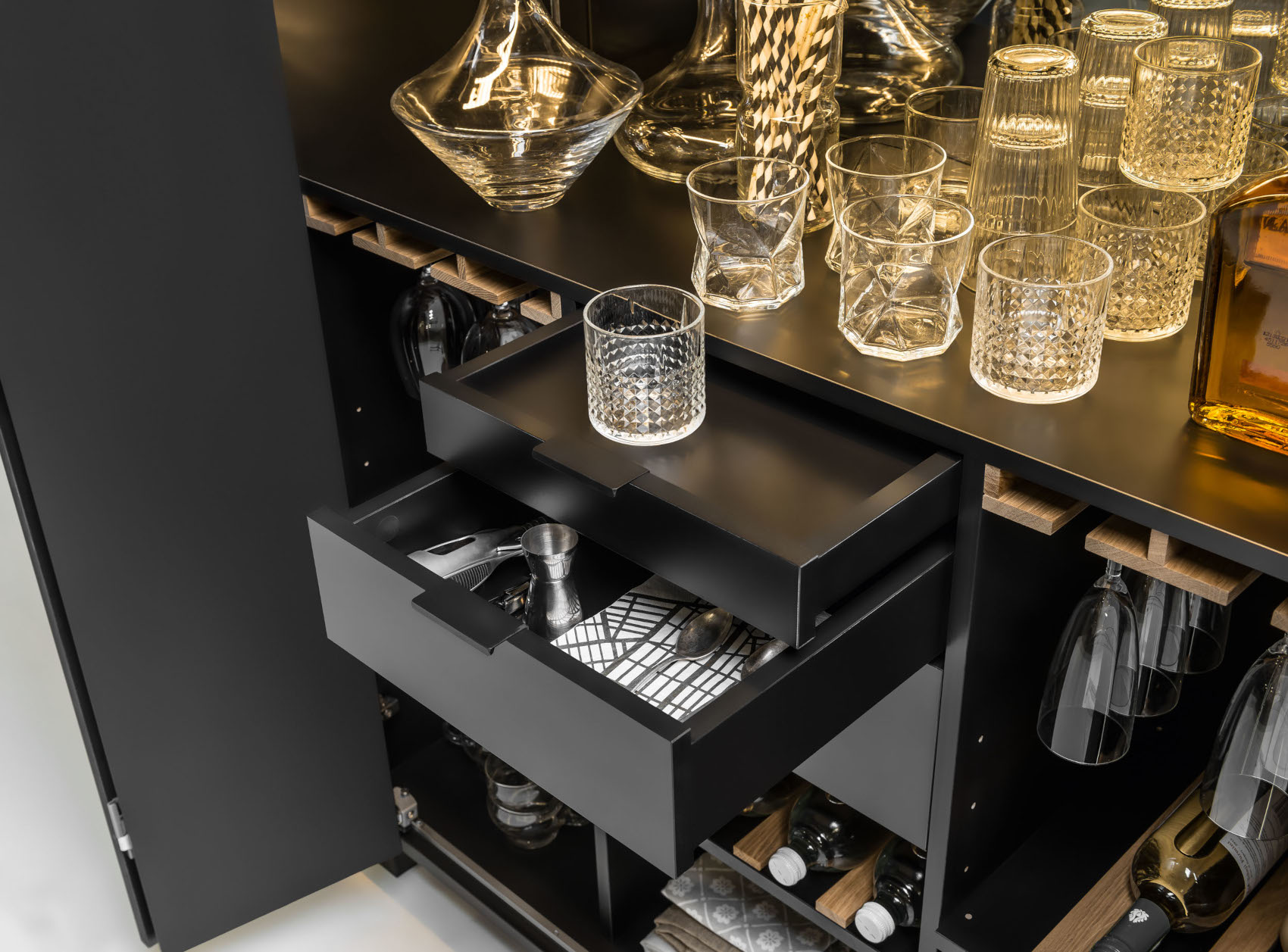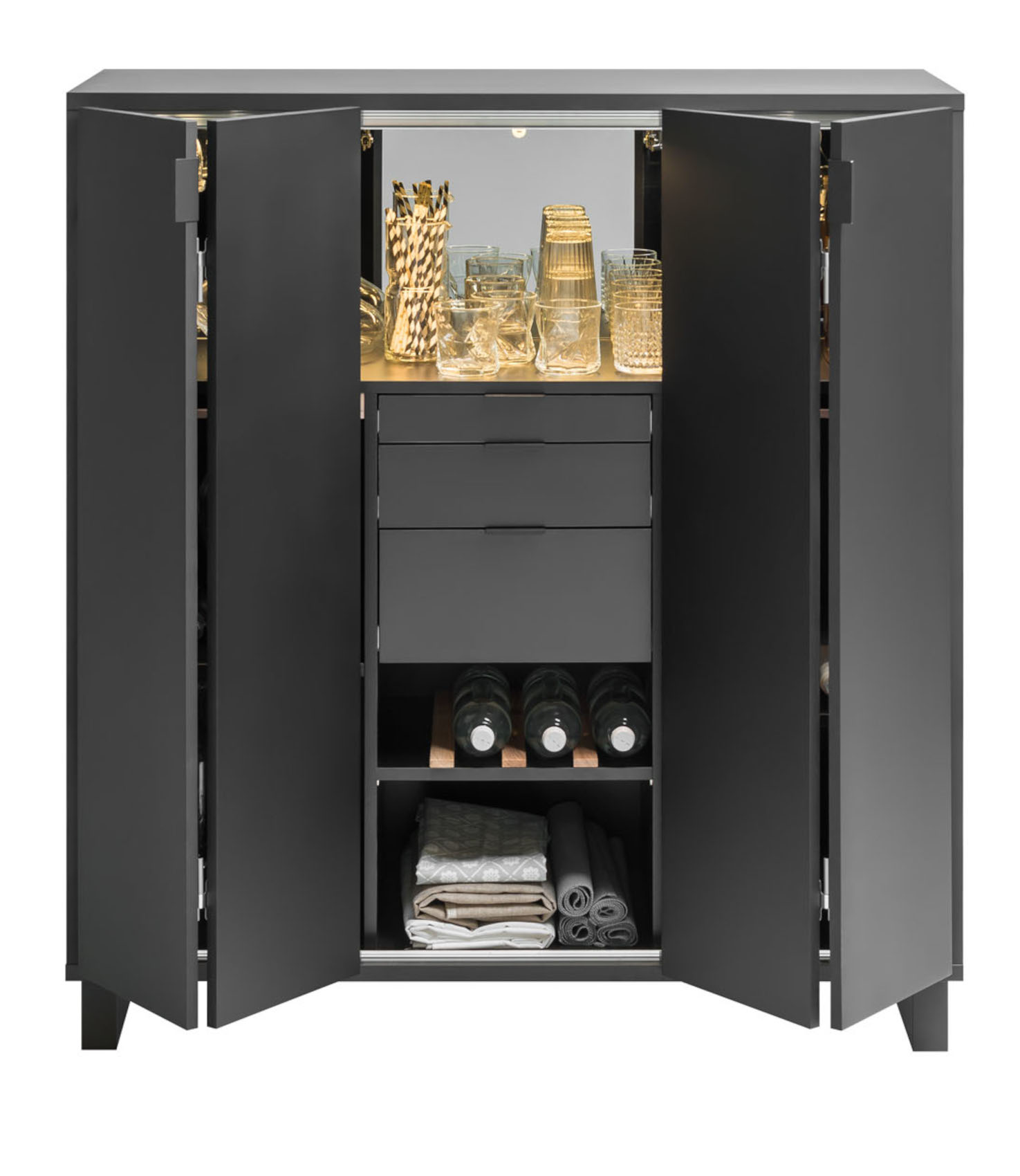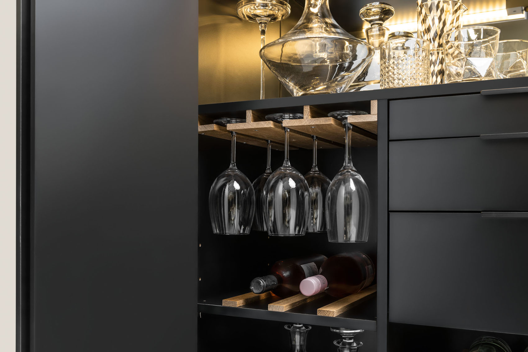 Ve vnitřním prostoru jsou vloženy 3 police s libovolně nastavitelnou výškou, jedna široká police s vývodem pro kabeláž a 3 zásuvky na kovových pojezdech. K polici jsou připevněny závěsy na sklenice a držáky na vinné lahve. Součástí komody je LED osvětlení s pohybovým senzorem, které se rozsvítí při otevření dvířek.