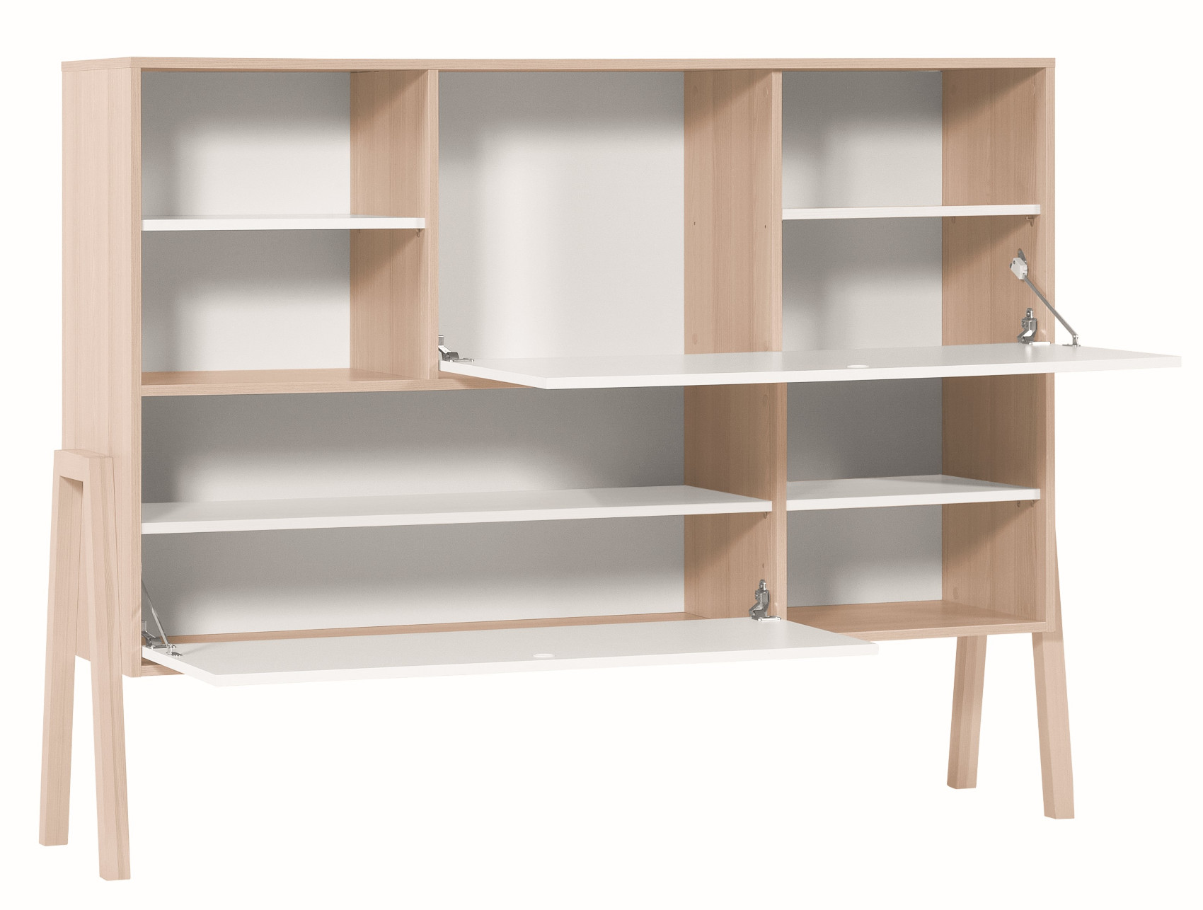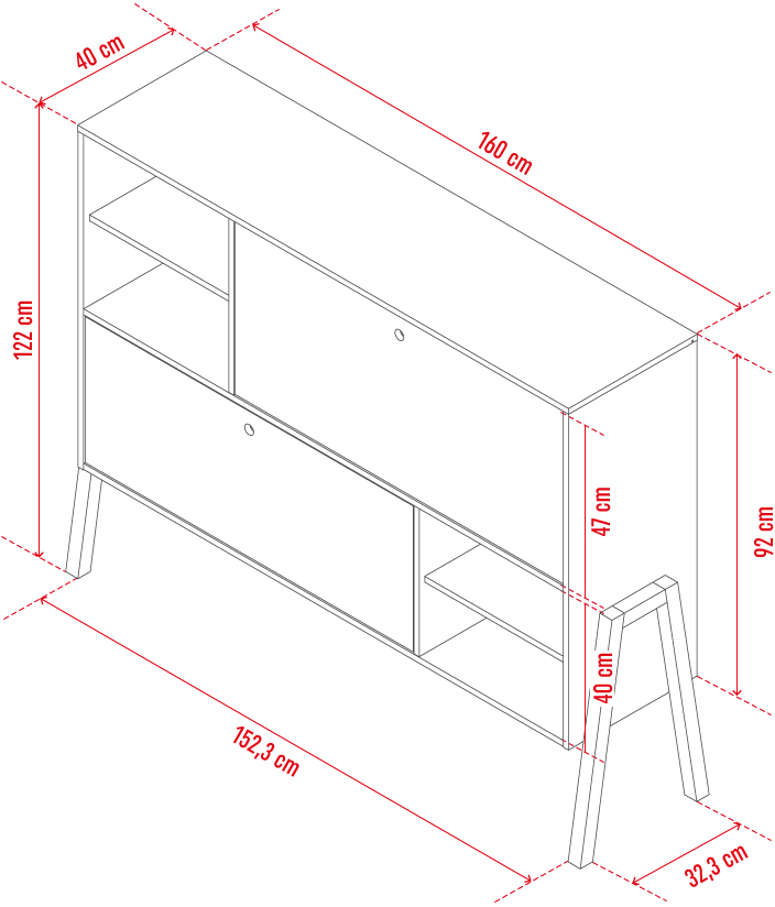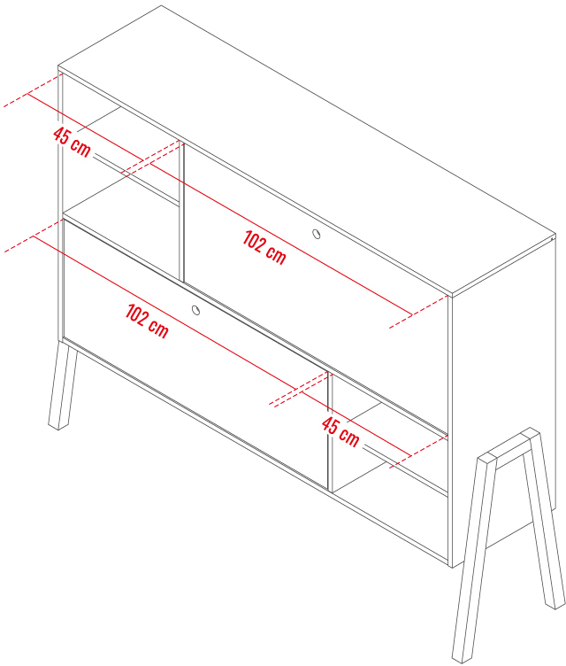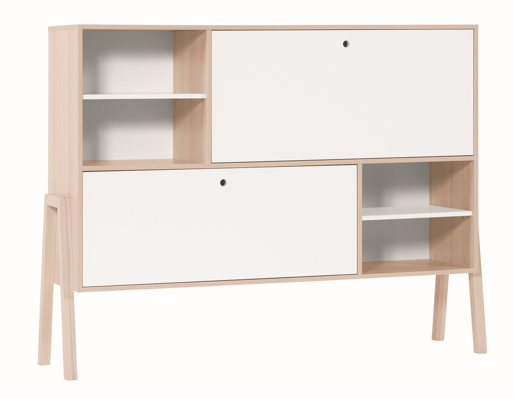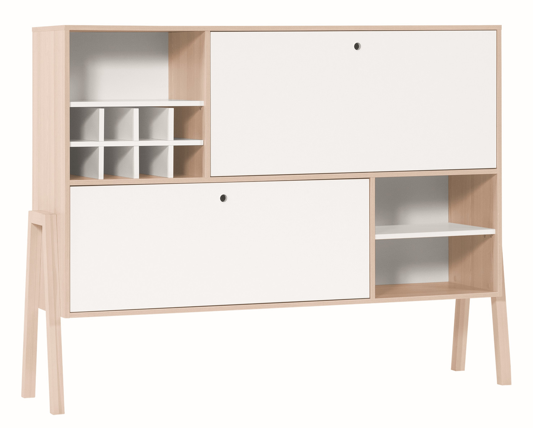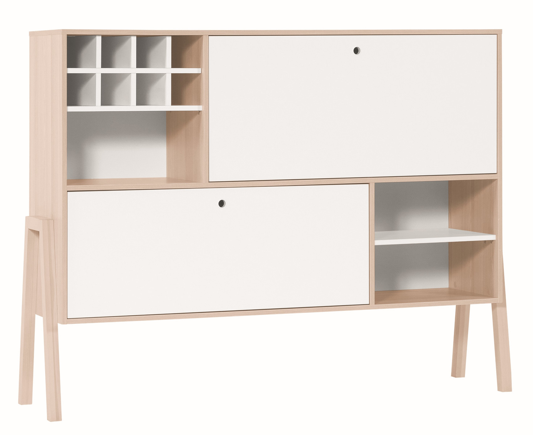 Skříňka má 2 sklopná dvířka, za kterými jsou vloženy 2 lakované police. V levé části jsou 2 otevřené niky, do které si můžete dokoupit polici na víno (v případě zájmu nás kontaktujte a my vám zašleme nové nacenění).V pravé spodní části jsou další 2 otevřené niky k vystavení oblíbených knih nebo dekorací.