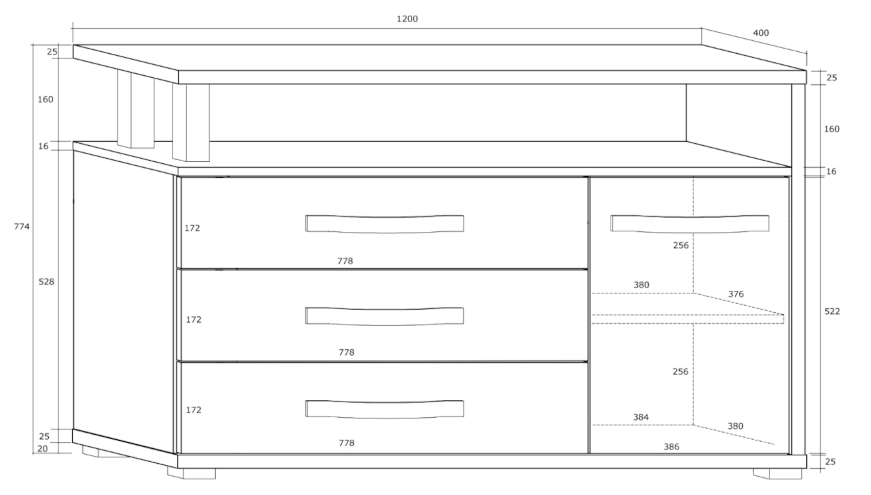 Součástí jsou 1 plná dvířka, za kterými je vložena 1 lakovaná police. Na levé straně jsou 3 prostorné zásuvky na kovových pojezdech.