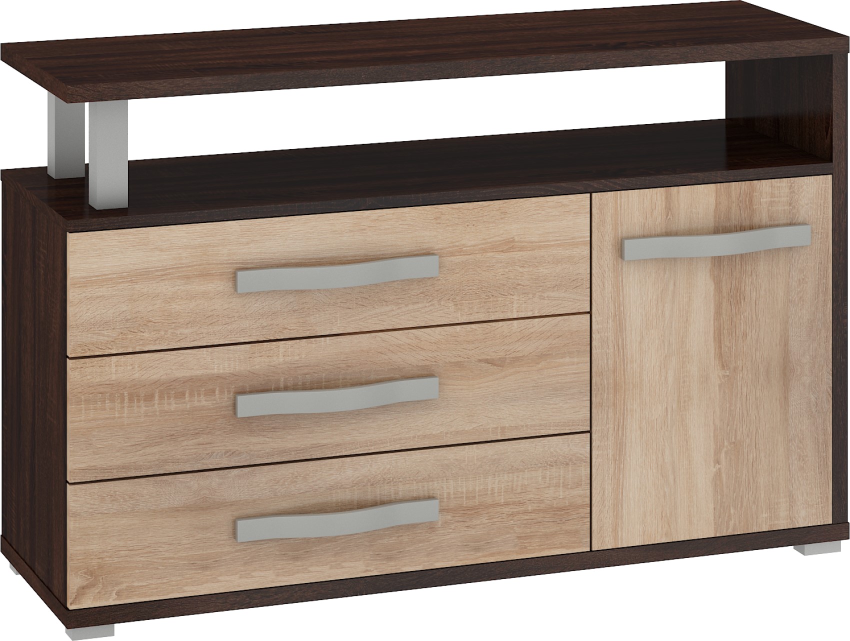 Komoda 1D3S Angel 04 se skvěle hodí do moderně zařízených interiérů. Zaujme vás svým neobvyklým avšak moderním designem a přírodním provedením. Je vyrobena z kvalitních lamino desek o síle 25 mm a 16 mm. Nábytek stojí na nízkých kovových nožkách. Nabízíme vám několik barevných variant. Zajímavý design barev dodává komodě ještě více na luxusu a nadčasovosti.