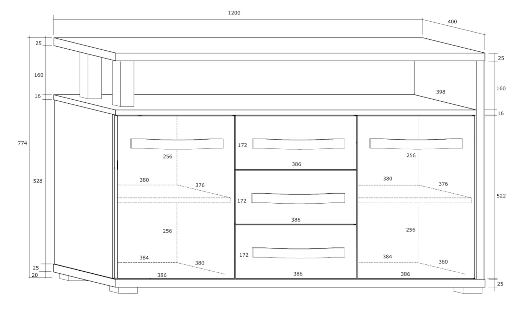Součástí jsou 2 plná dvířka, za kterými jsou vloženy 2 lakované police. V prostřední části jsou 3 prostorné zásuvky na kovových pojezdech.