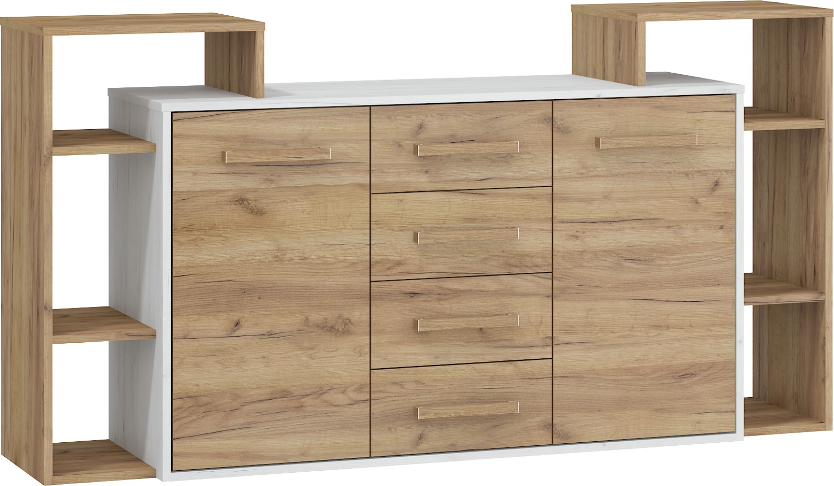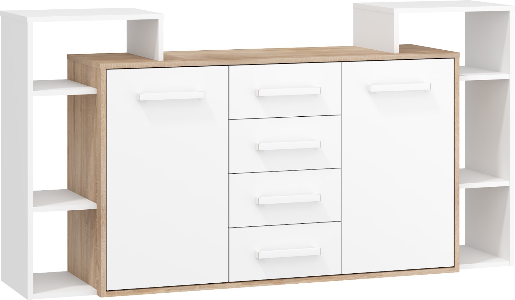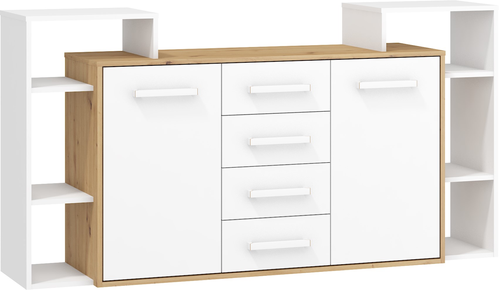 Součástí jsou 2 dvířka, za kterými jsou vloženy 4 lakované police. Mezi nimi jsou 4 zásuvky na kovových pojezdech. Na levé a pravé straně jsou 3 otevřené niky k vystavení vašich oblíbených dekorací.