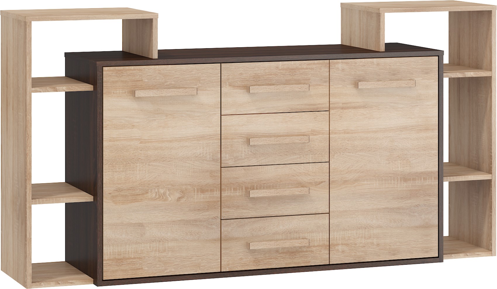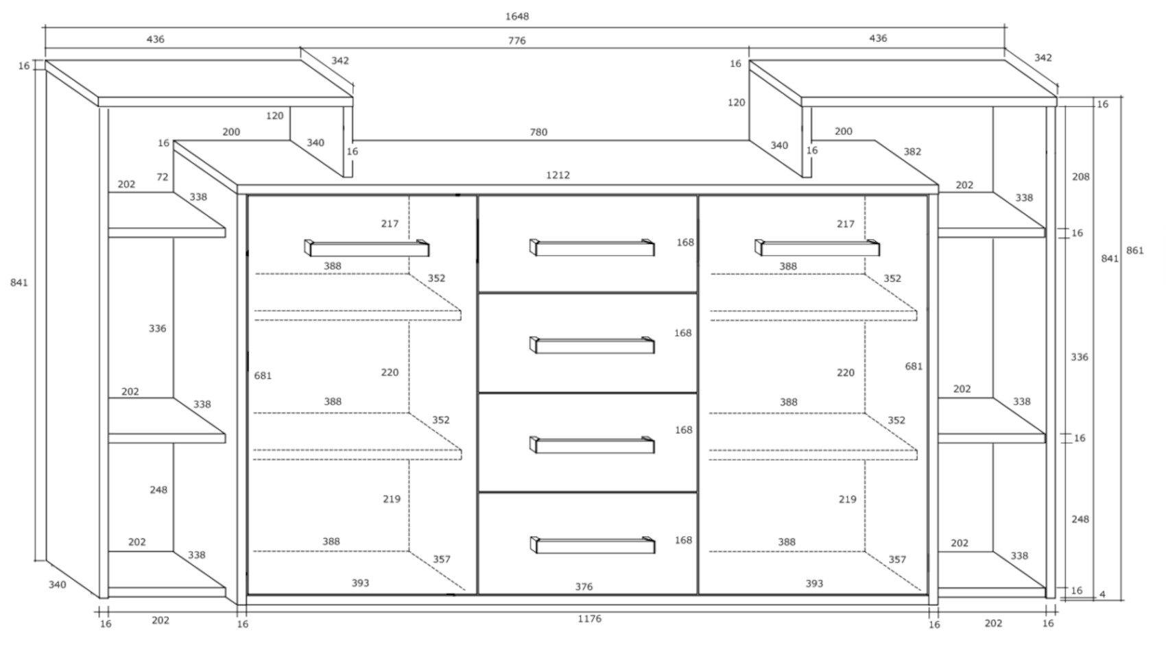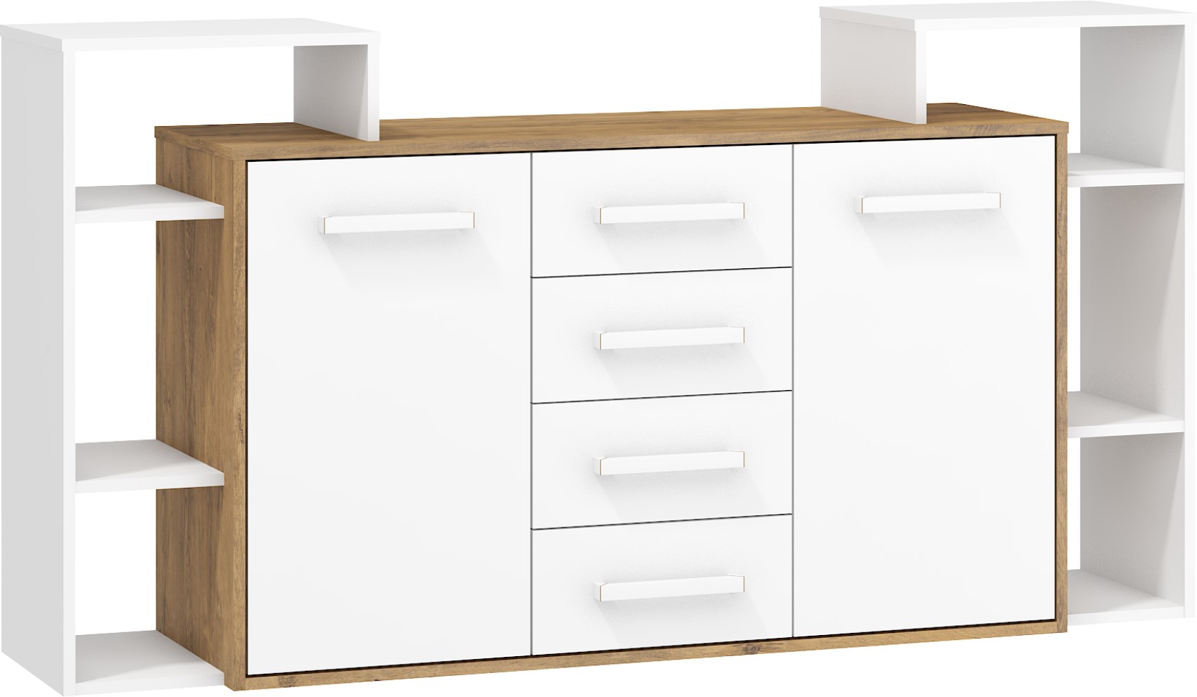 Součástí jsou 2 dvířka, za kterými jsou vloženy 4 lakované police. Mezi nimi jsou 4 zásuvky na kovových pojezdech. Na levé a pravé straně jsou 3 otevřené niky k vystavení vašich oblíbených dekorací.