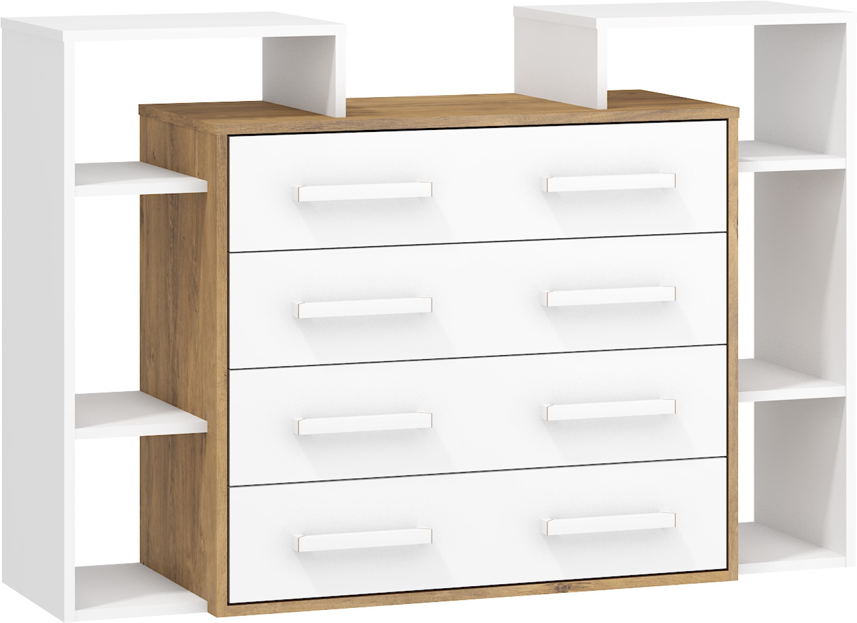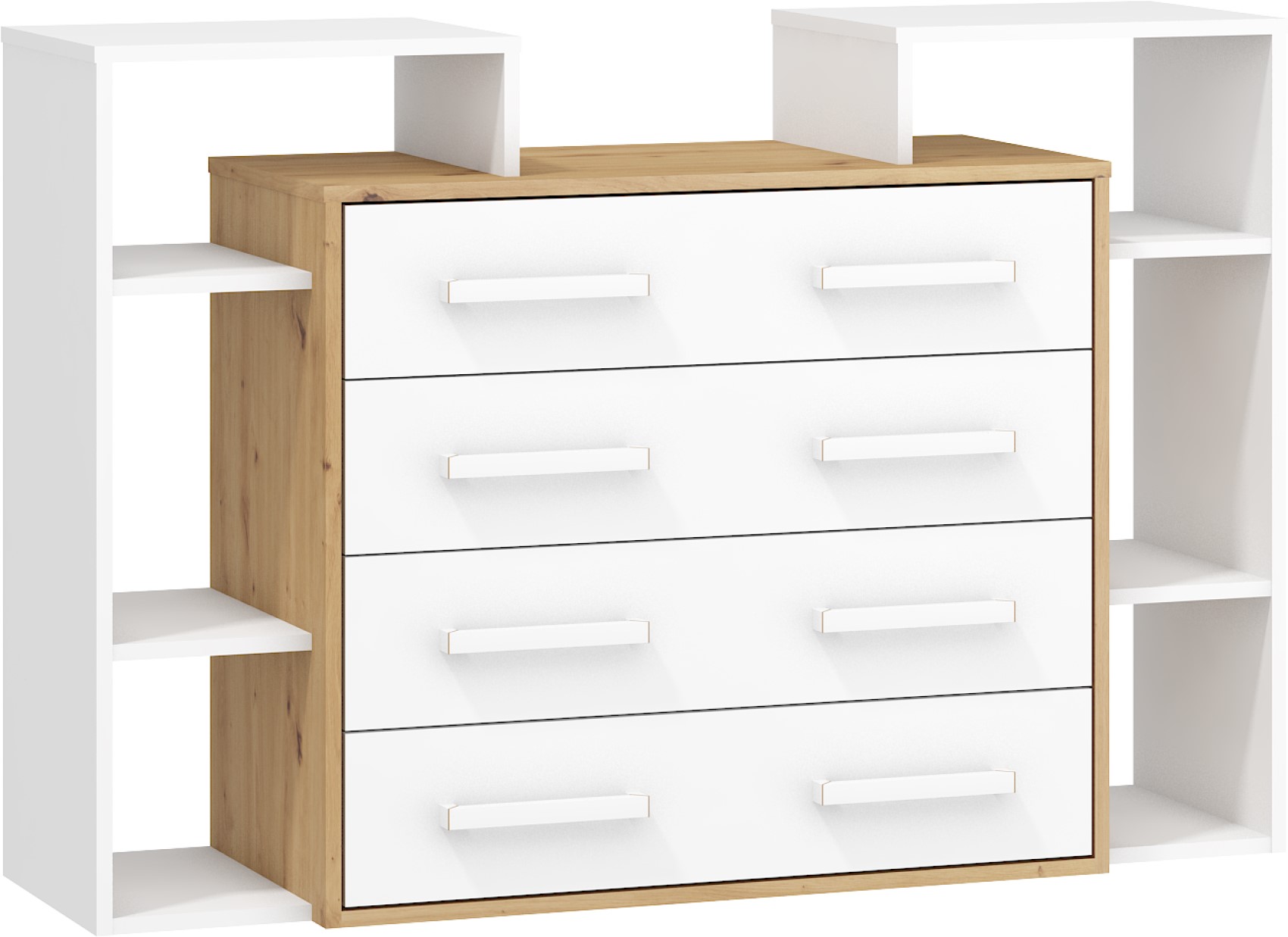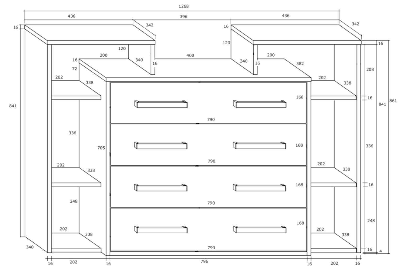 Součástí 4 dlouhé zásuvky na kovových pojezdech. Na levé a pravé straně jsou 3 otevřené niky k vystavení vašich oblíbených dekorací.