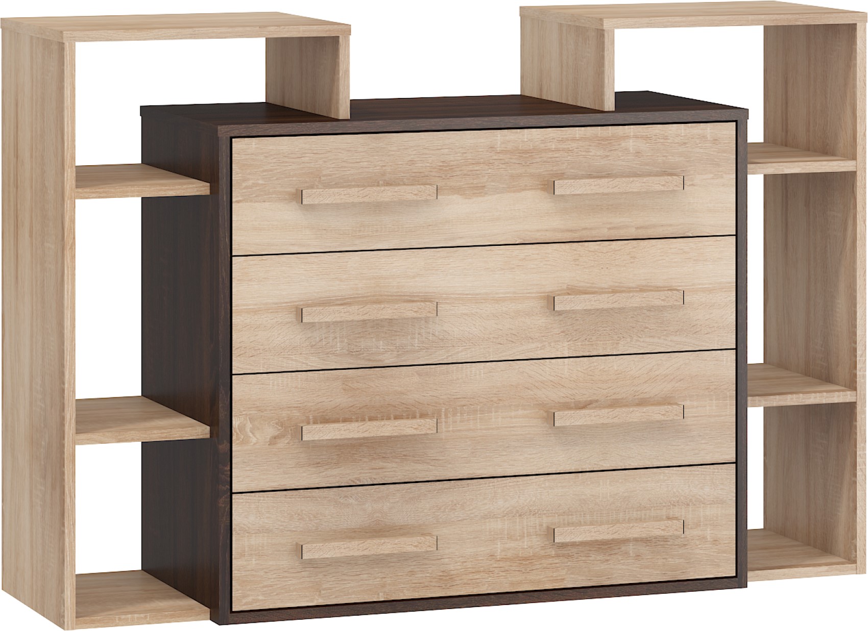 Komoda 4S Rio 07 se skvěle hodí do moderně zařízených interiérů zejména předsíní. Zaujme vás svým neobvyklým avšak moderním designem a přírodním provedením. Je vyrobena z kvalitních lamino desek o síle 16 mm a 25 mm. Desky mají ABS hranění, které zvyšuje odolnost pro odštípnutí hran. Součástí zásuvek a dvířek je zabudovaný systém tichého dovírání. Nabízíme vám několik barevných variant. Zajímavý design barev dodává skříni ještě více na luxusu a nadčasovosti.