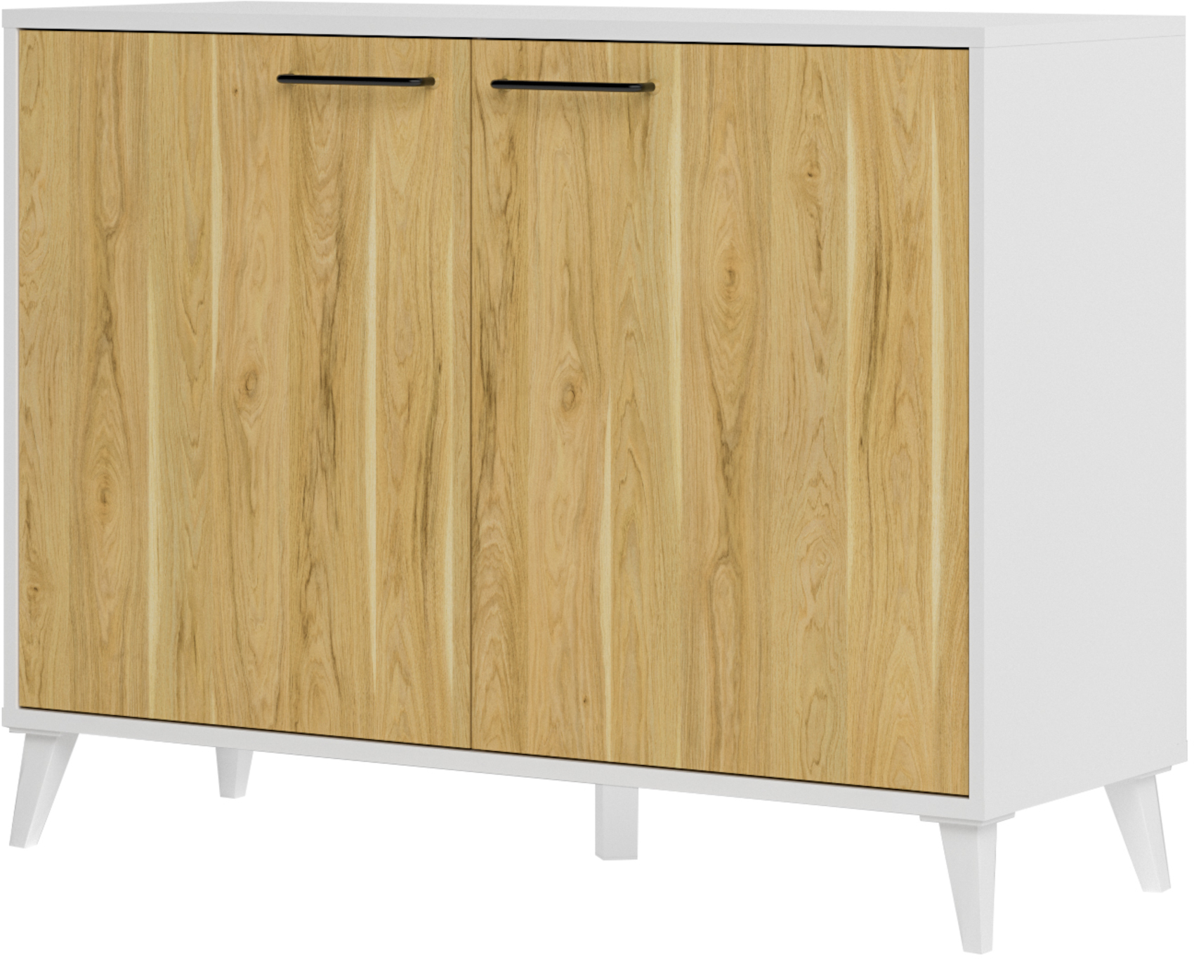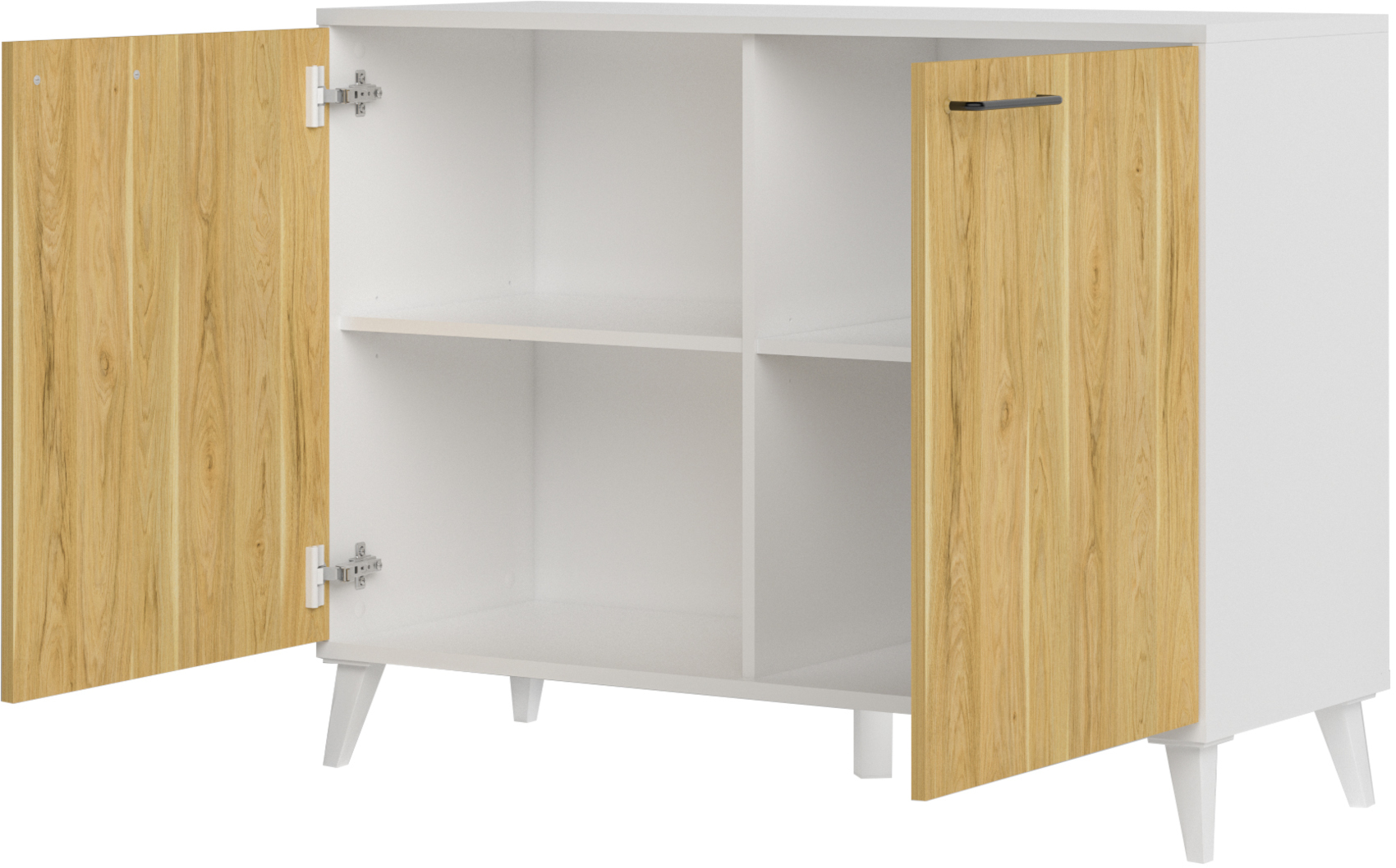 Součástí komody jsou 2 dvířka, za kterými jsou vloženy 2 police.