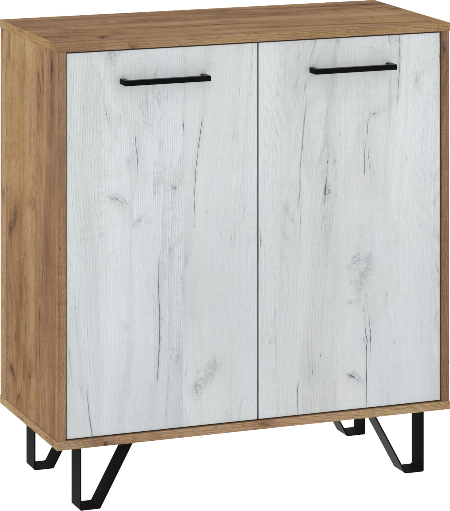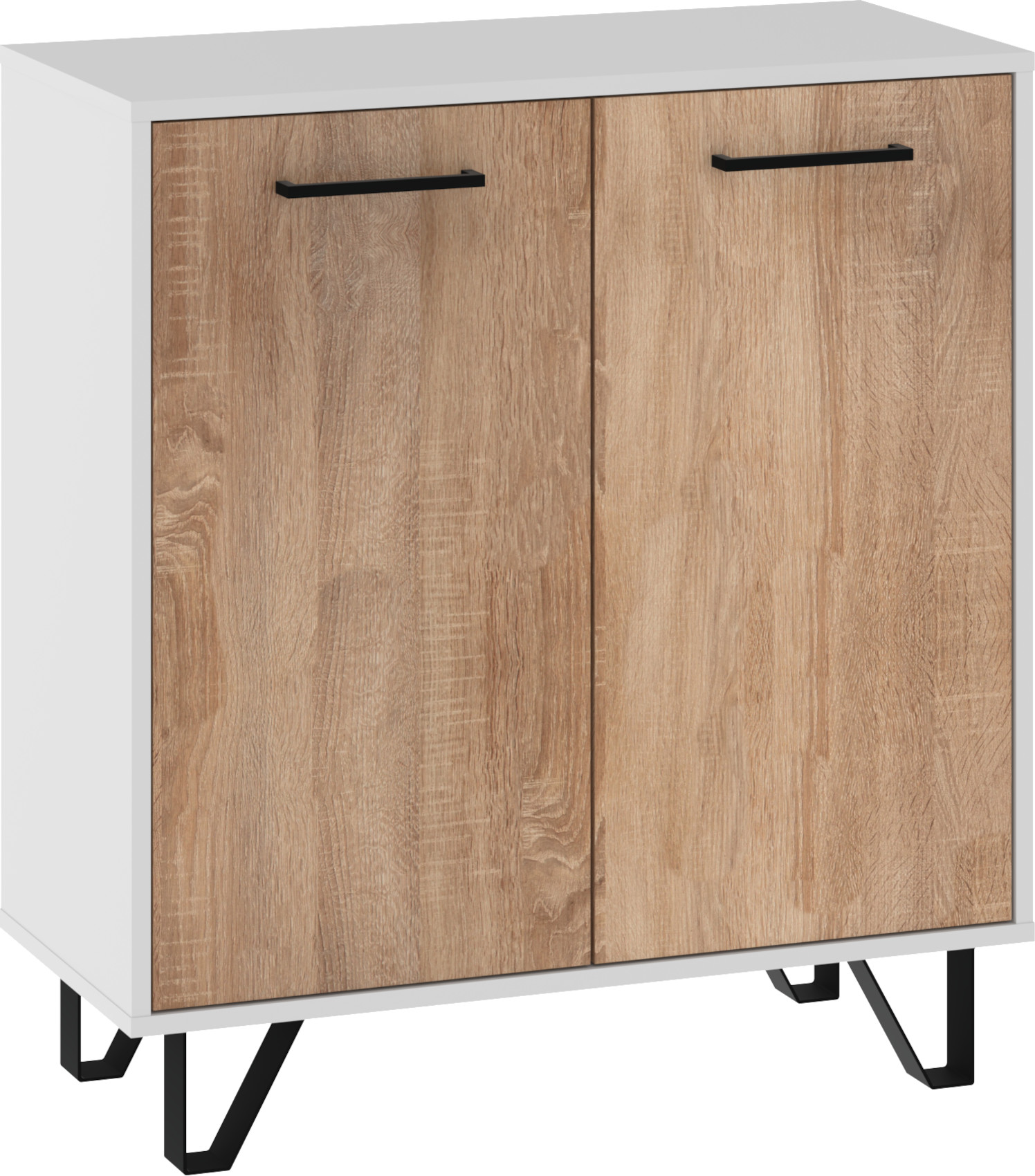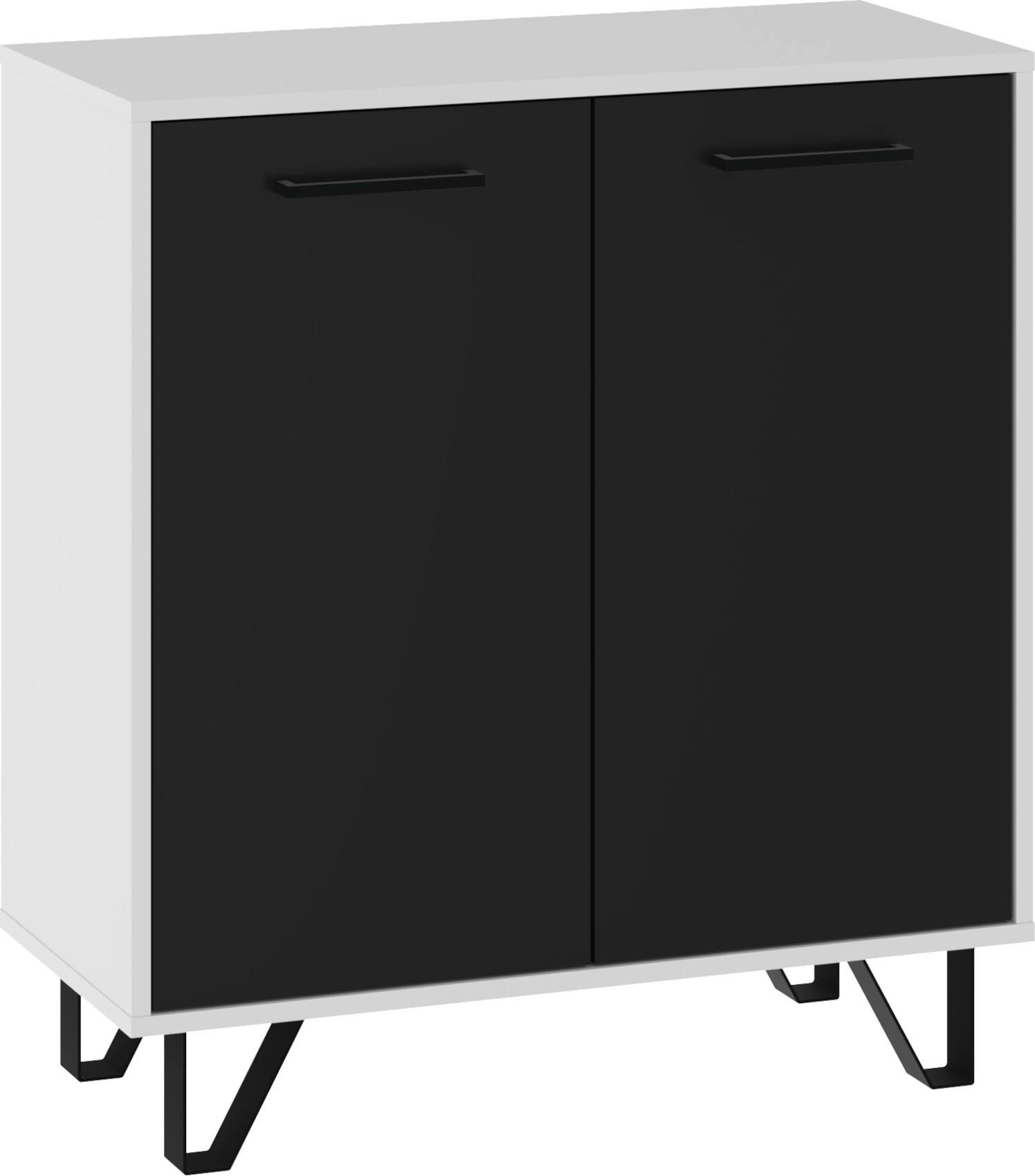 Součástí komody jsou 2 dvířka, za kterými jsou vloženy 2 lakované police.