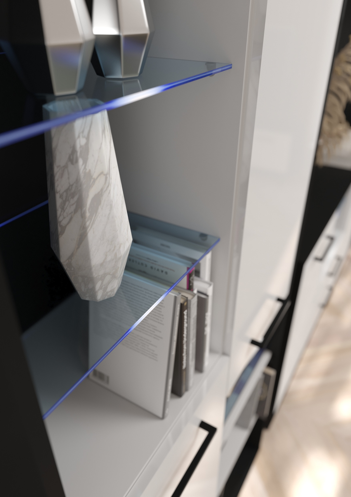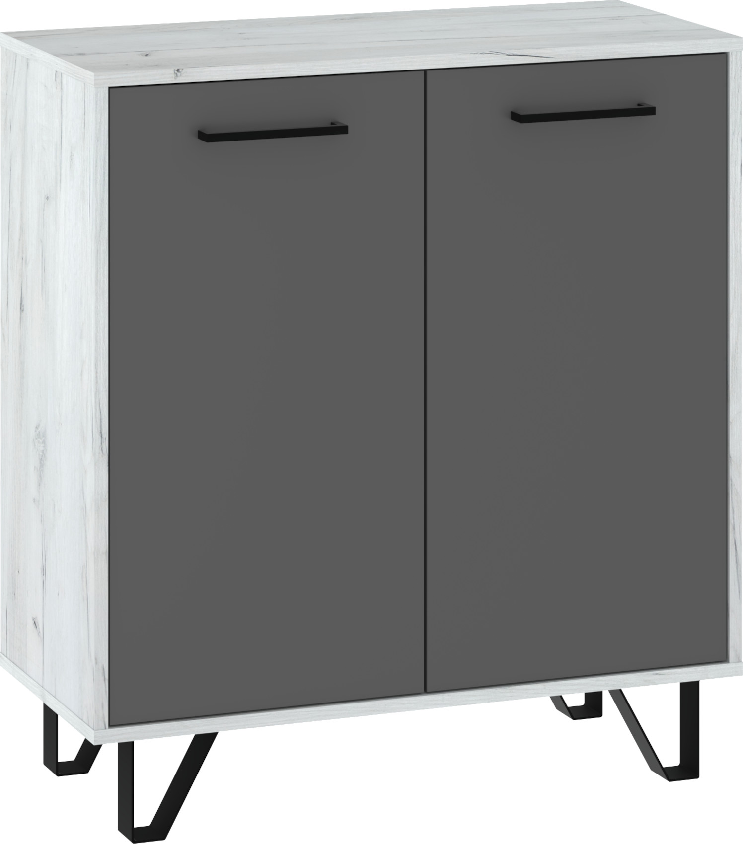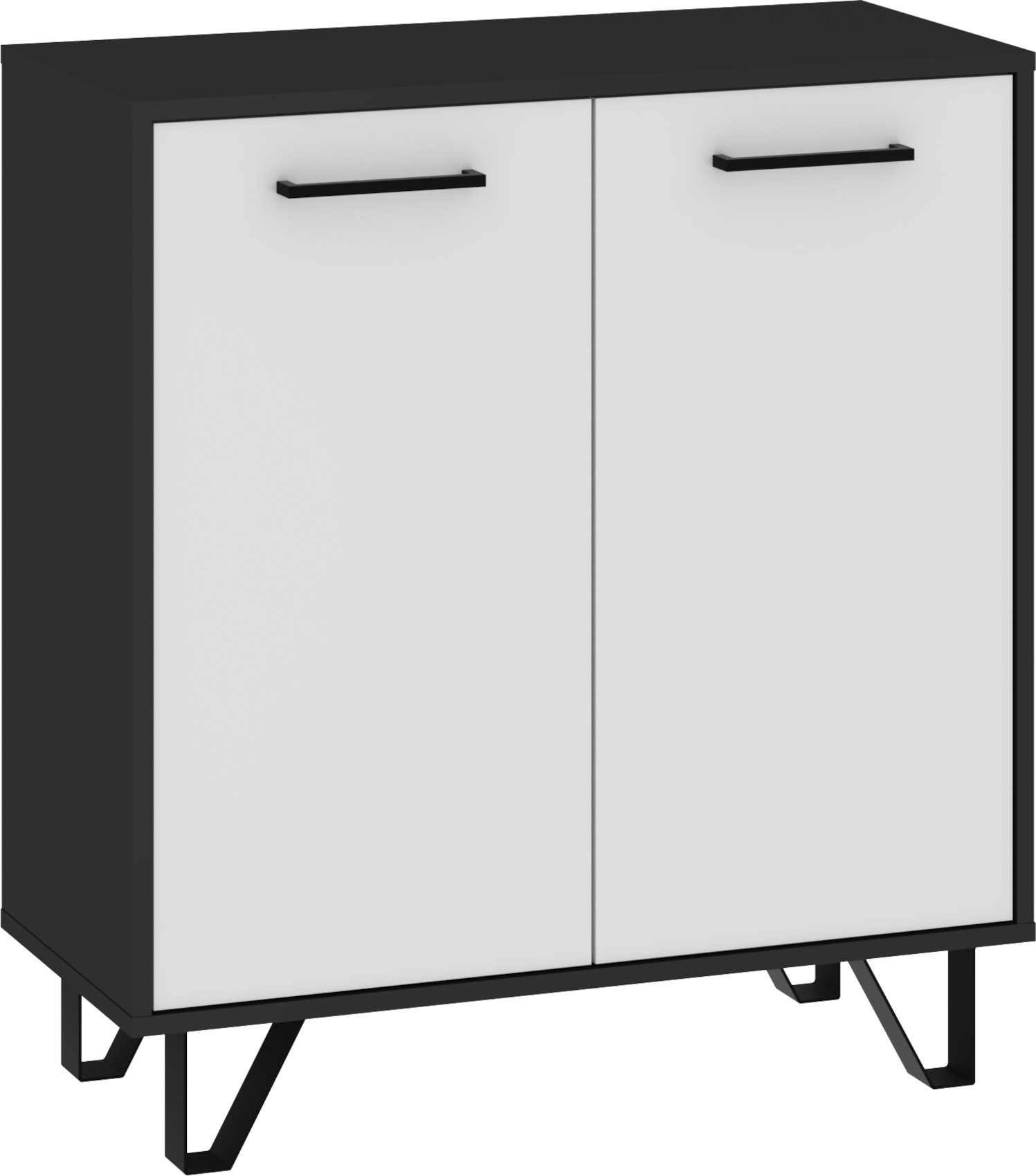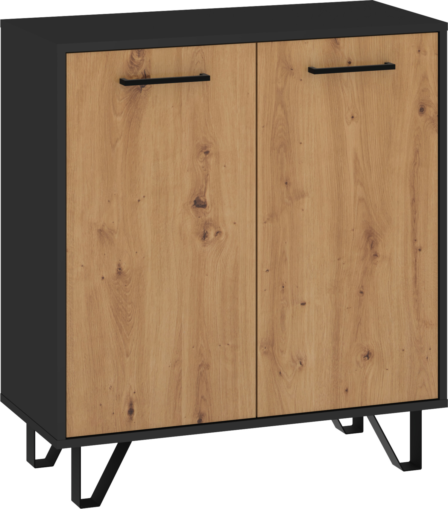 Součástí komody jsou 2 dvířka, za kterými jsou vloženy 2 lakované police.