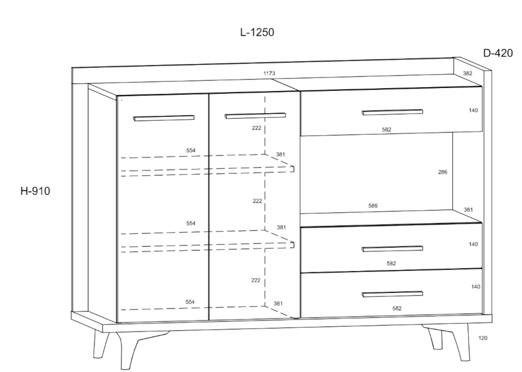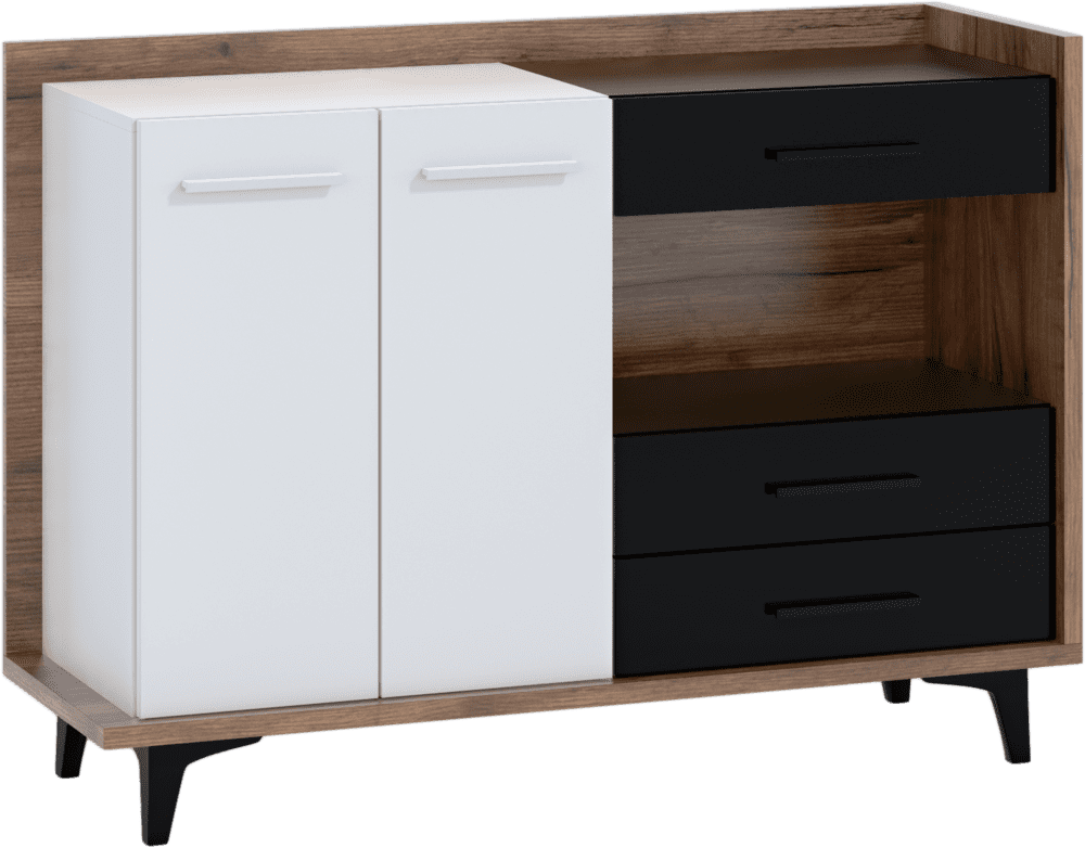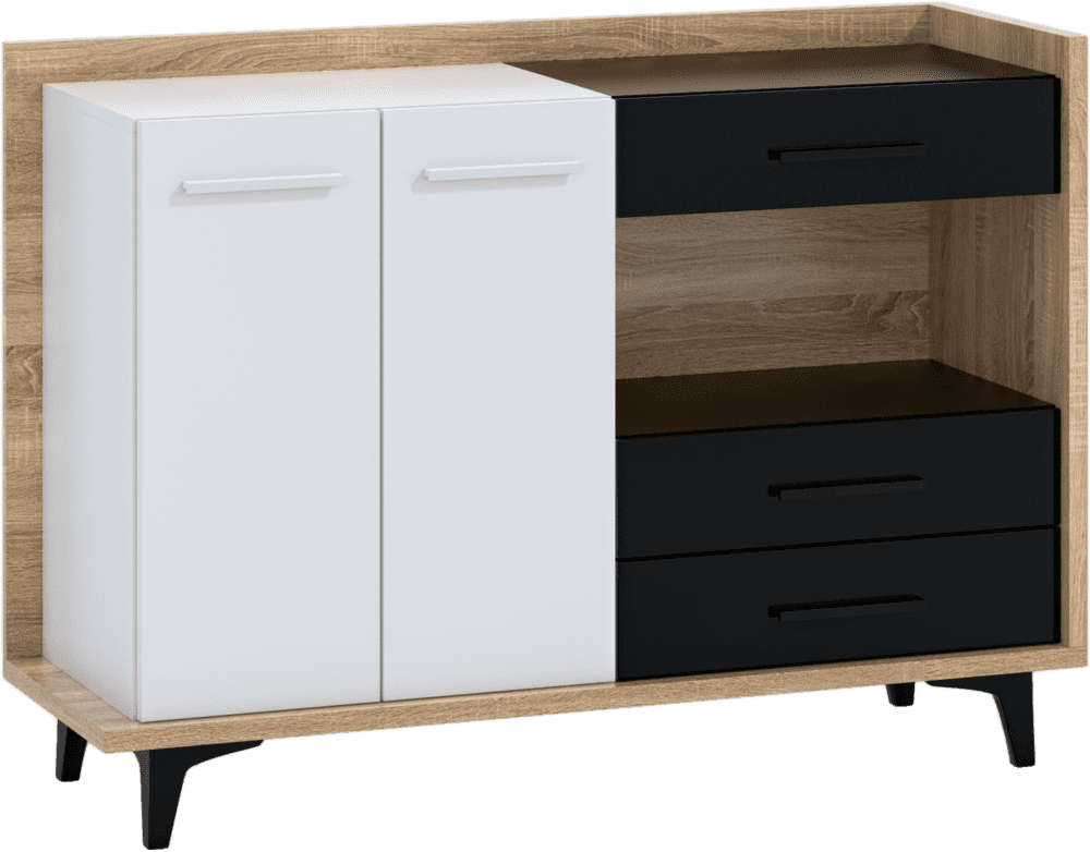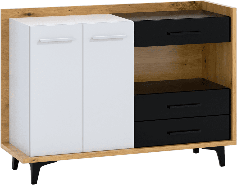 Součástí komody jsou 2 plná dvířka, za kterými jsou vloženy 2 dlouhé lakované police. V pravé části jsou 3 zásuvky na kovových pojezdech a otevřená nika k vystavení vašich oblíbených dekorací, knih či rámečků s fotografiemi.