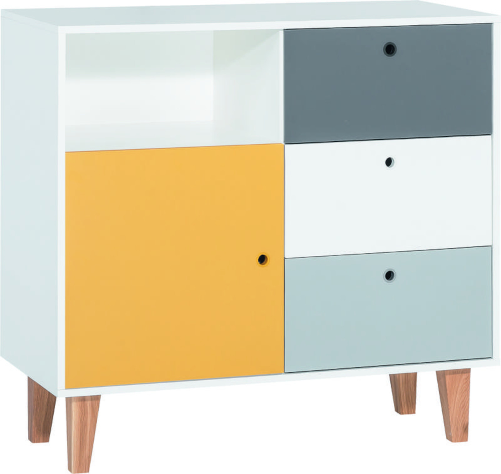 Součástí pravé strany jsou 3 zásuvky na kovových pojezdech Quadro. Levá strana se skládá z 1 dvířek, za kterými je libovolně polohovatelná police a v horní části komody je otevřená nika k uložení vašich oblíbených knih nebo dekorací.