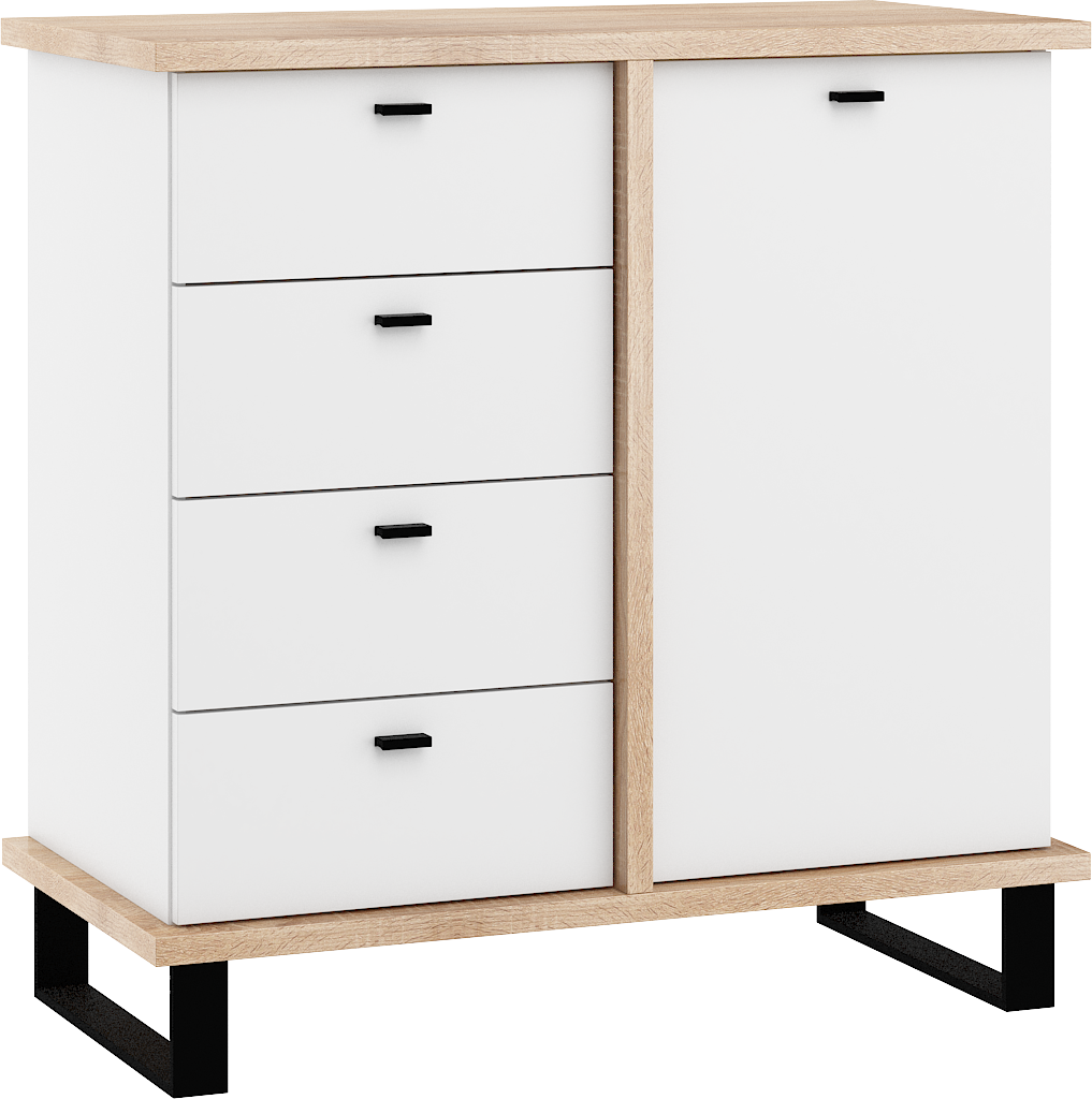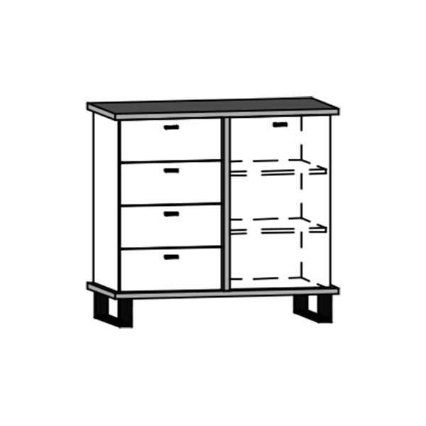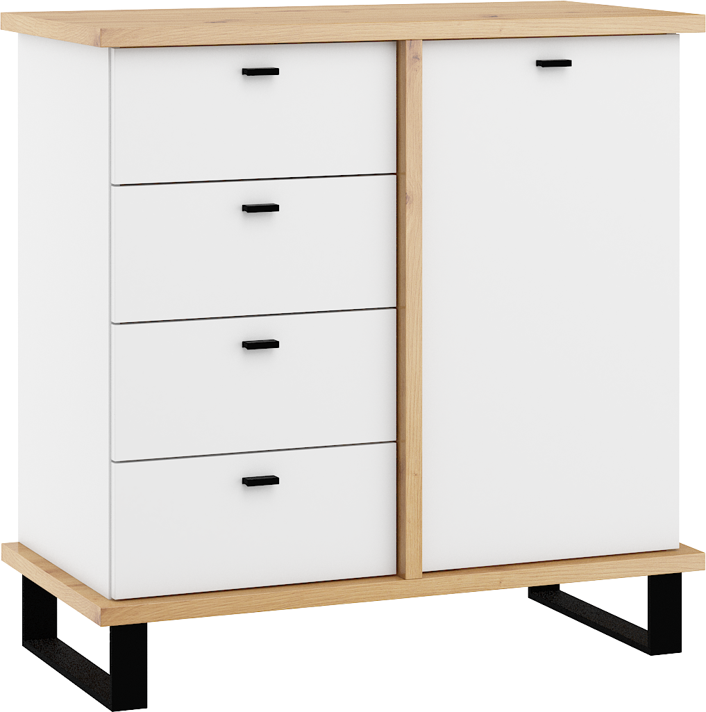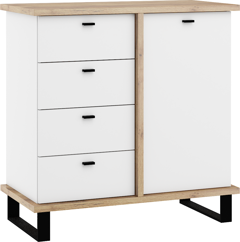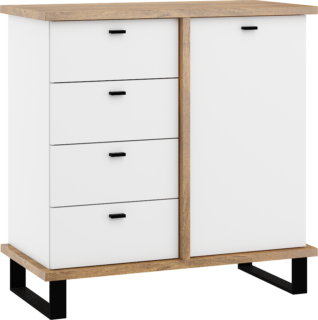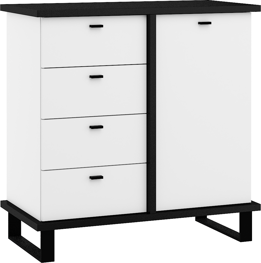 Komoda Cross 04 disponuje 4 zásuvkami a skříňkou se 2 poličkami uvnitř. Nožky jsou vysoké 12 cm.