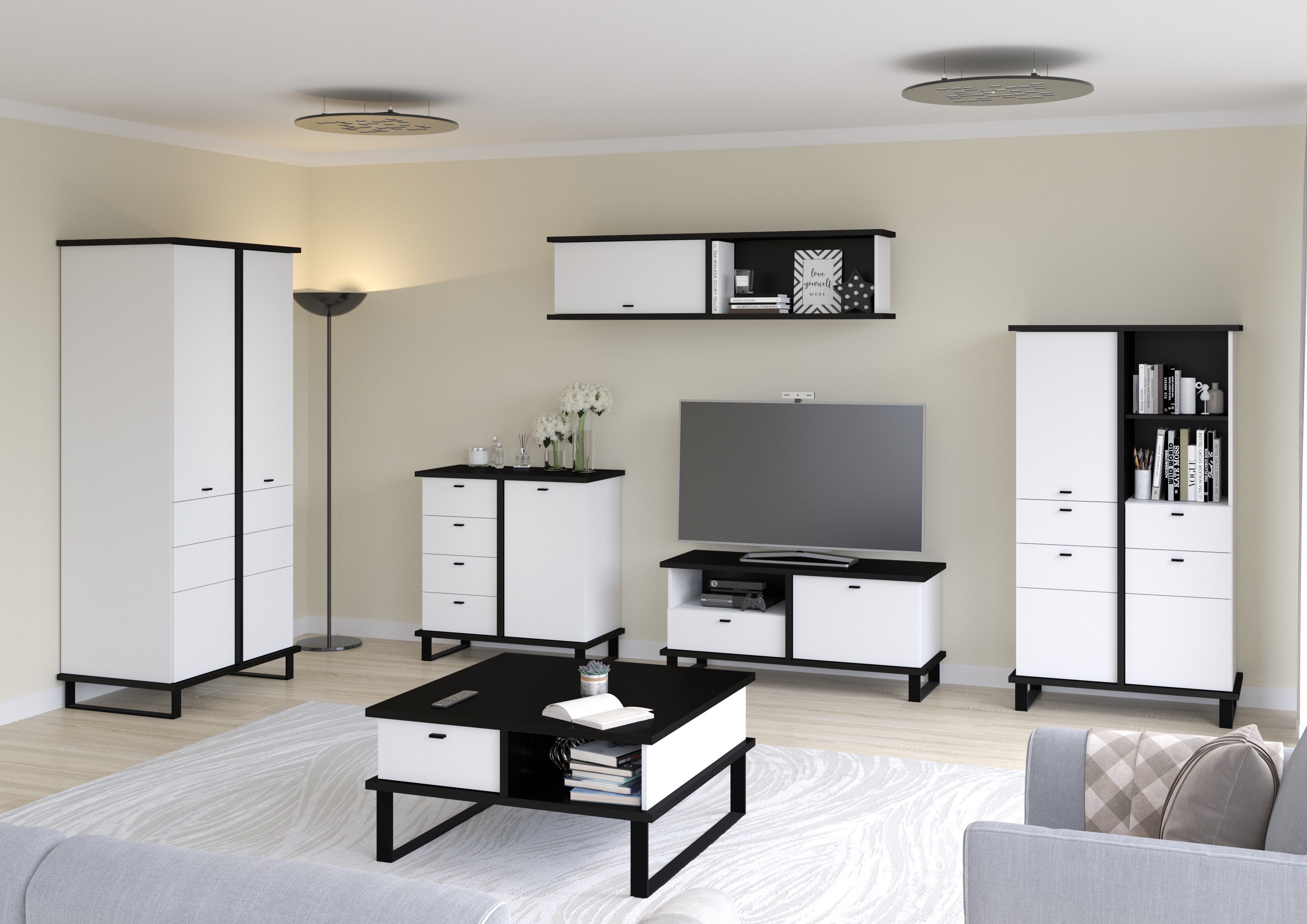 Vitríny mají kouřová skla, která ještě více zdůrazní originální vzhled systému. Černou barvou vynikají i úchyty, jež doplňují barevné kombinace reflektující moderní trendy v bydlení. S kolekcí Cross nemůžete šlápnout vedle!