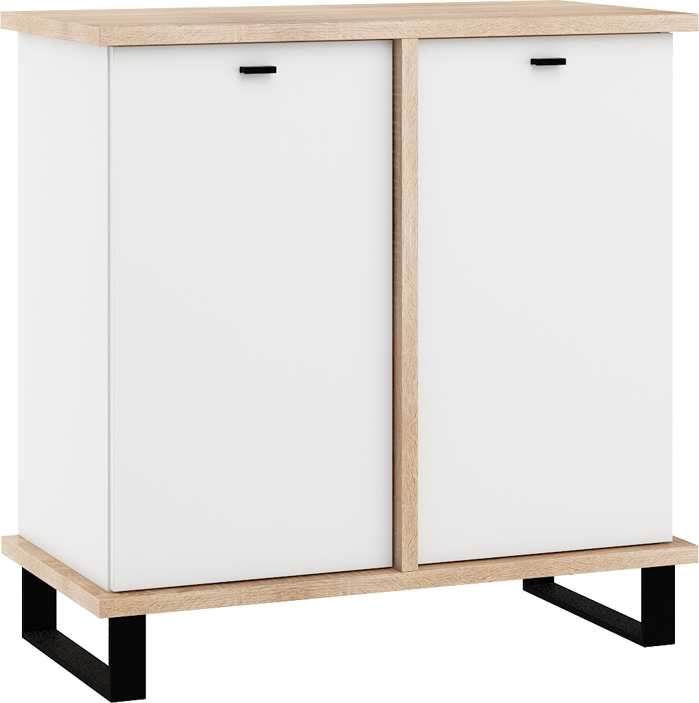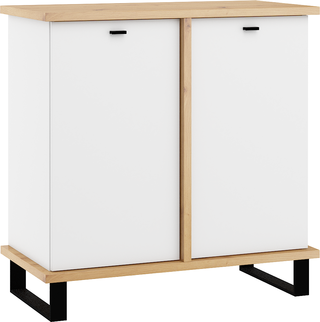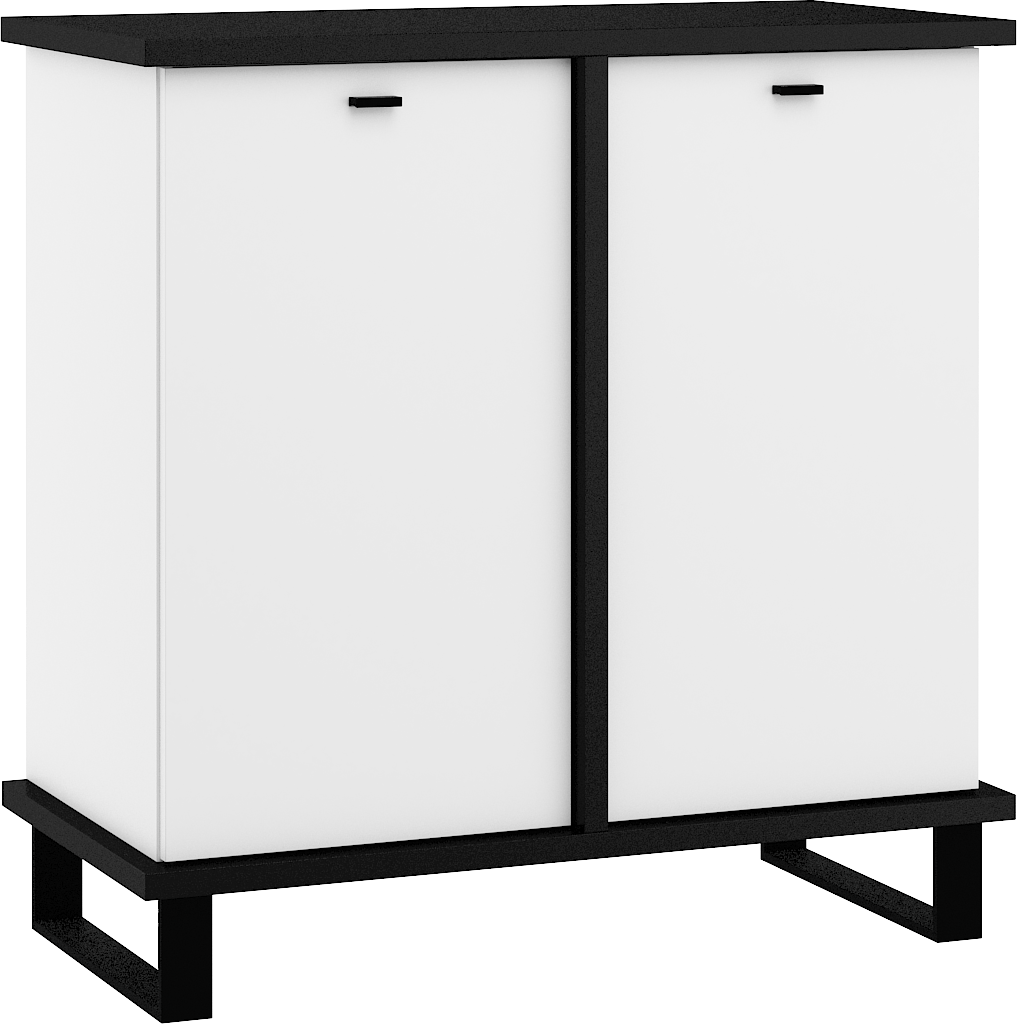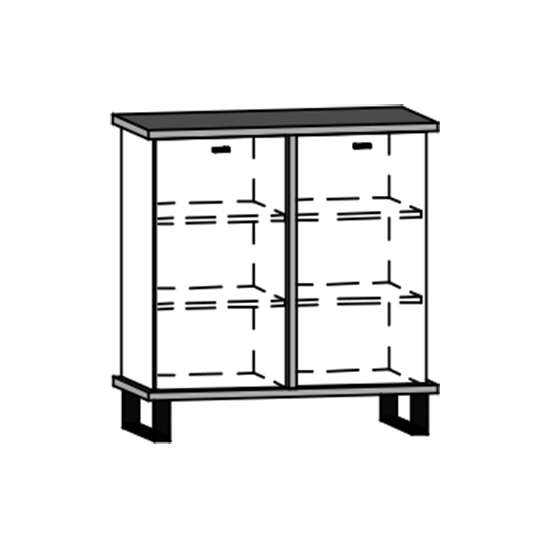 Komoda Cross 05 disponuje 2 skříňkami s plnými dvířky a se 2 poličkami uvnitř každé z nich. Nožky jsou vysoké 12 cm.