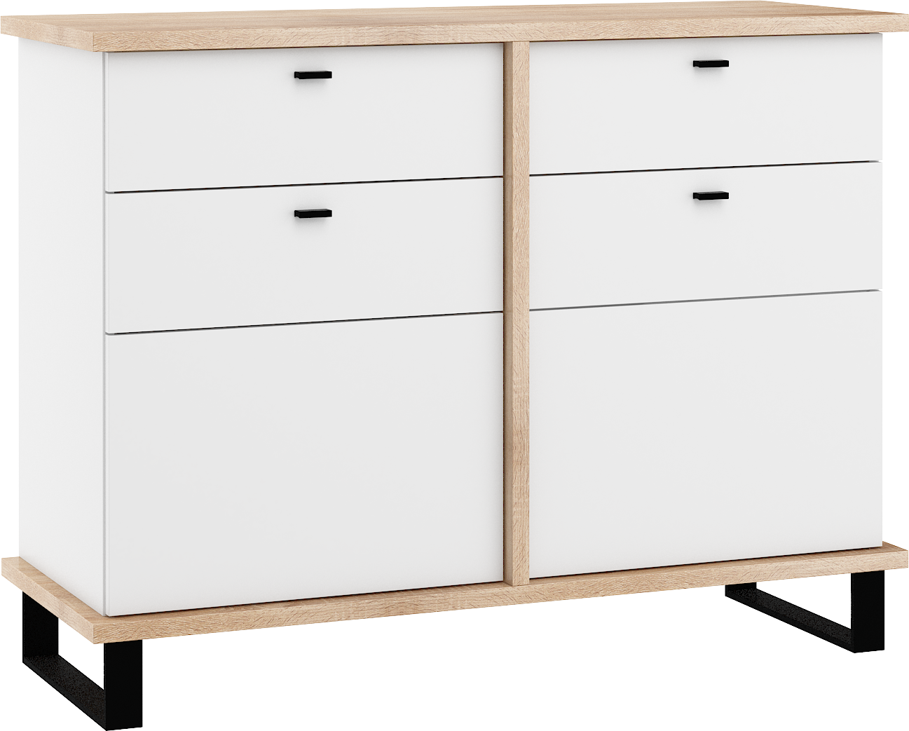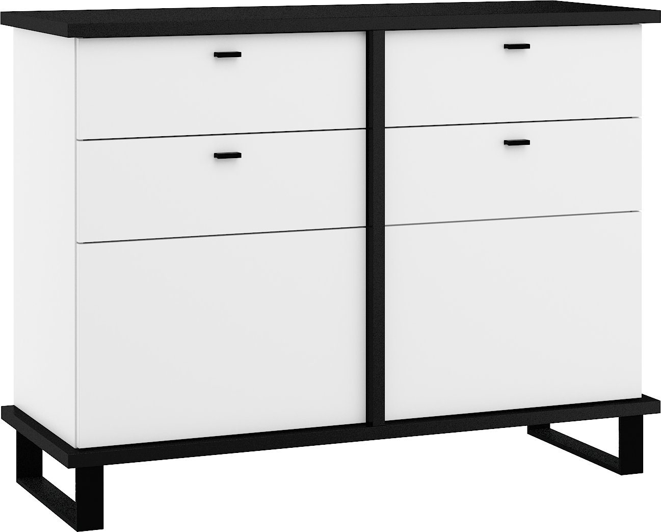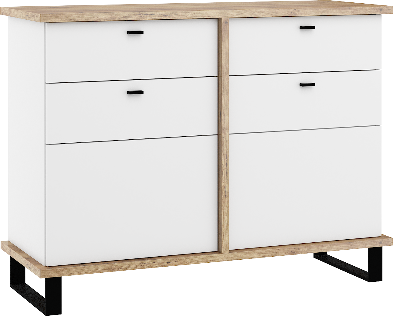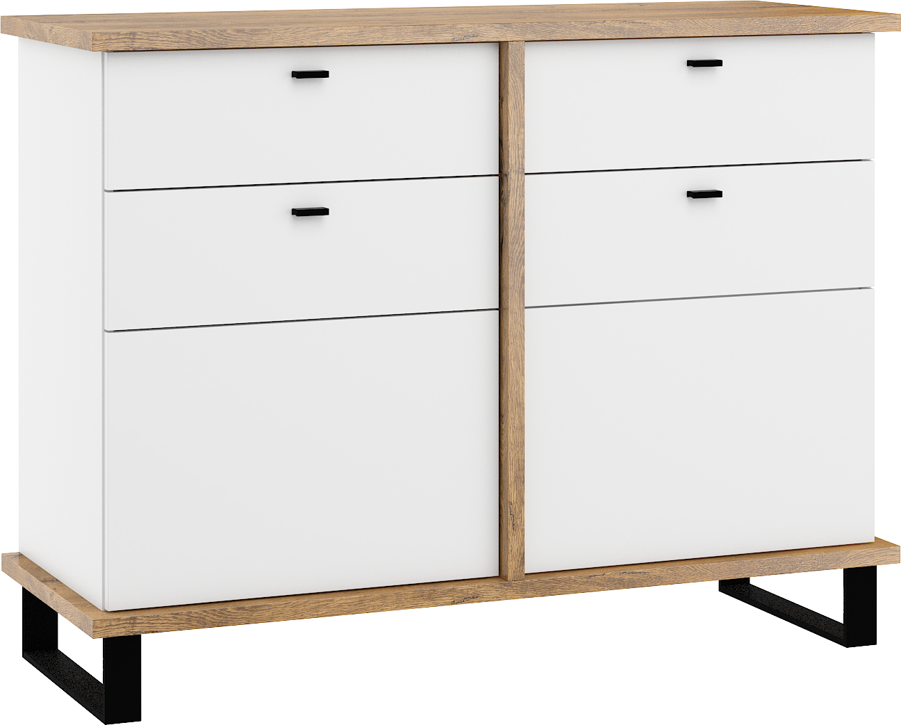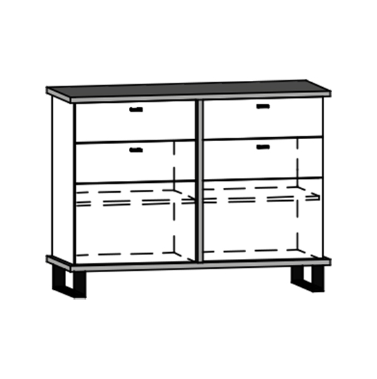 Komoda Cross 06 disponuje 2 skříňkami s plnými dvířky, s poličkou uvnitř každé z nich. Navíc má také 2 praktické zásuvky. Nožky jsou vysoké 12 cm.